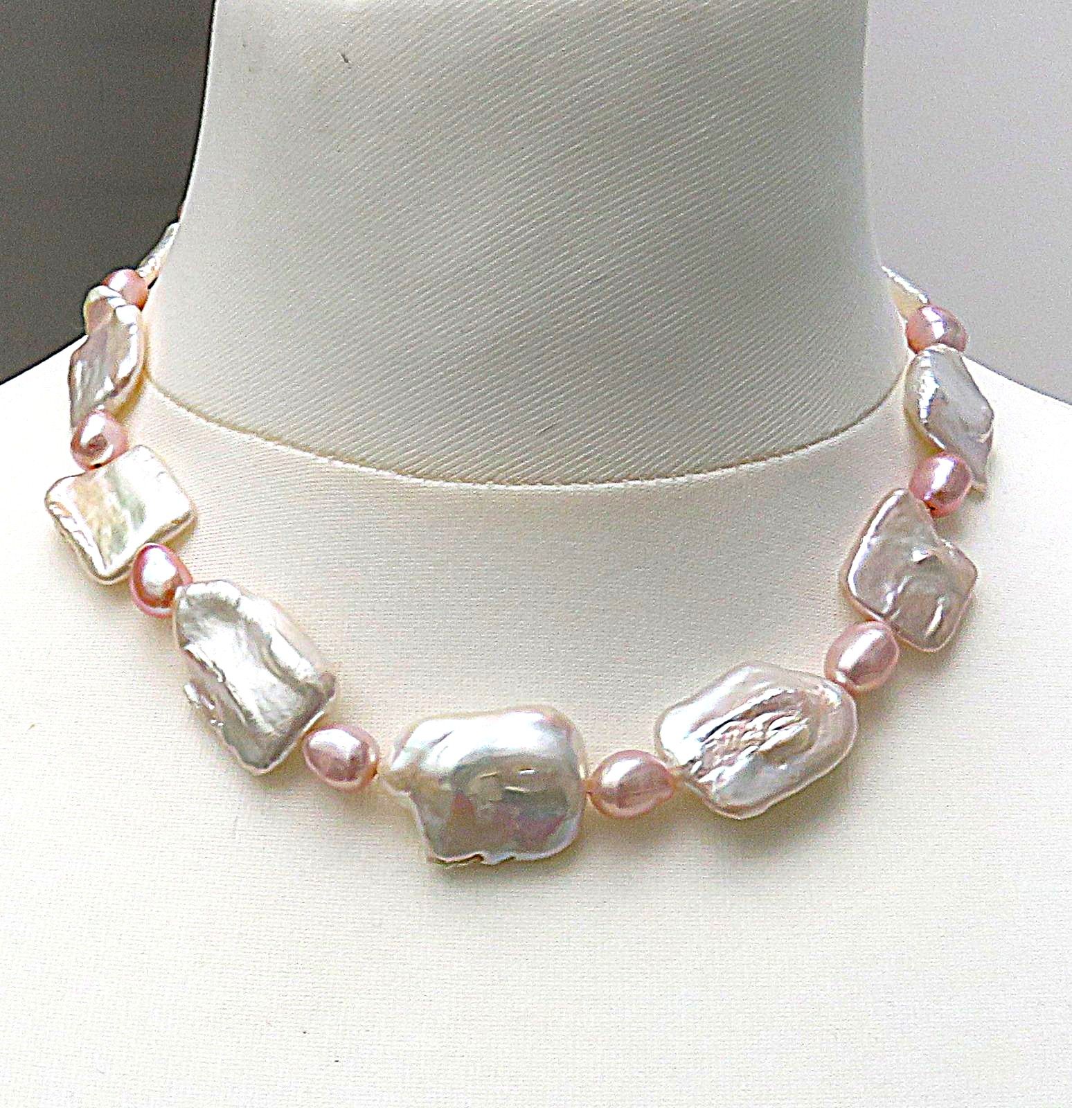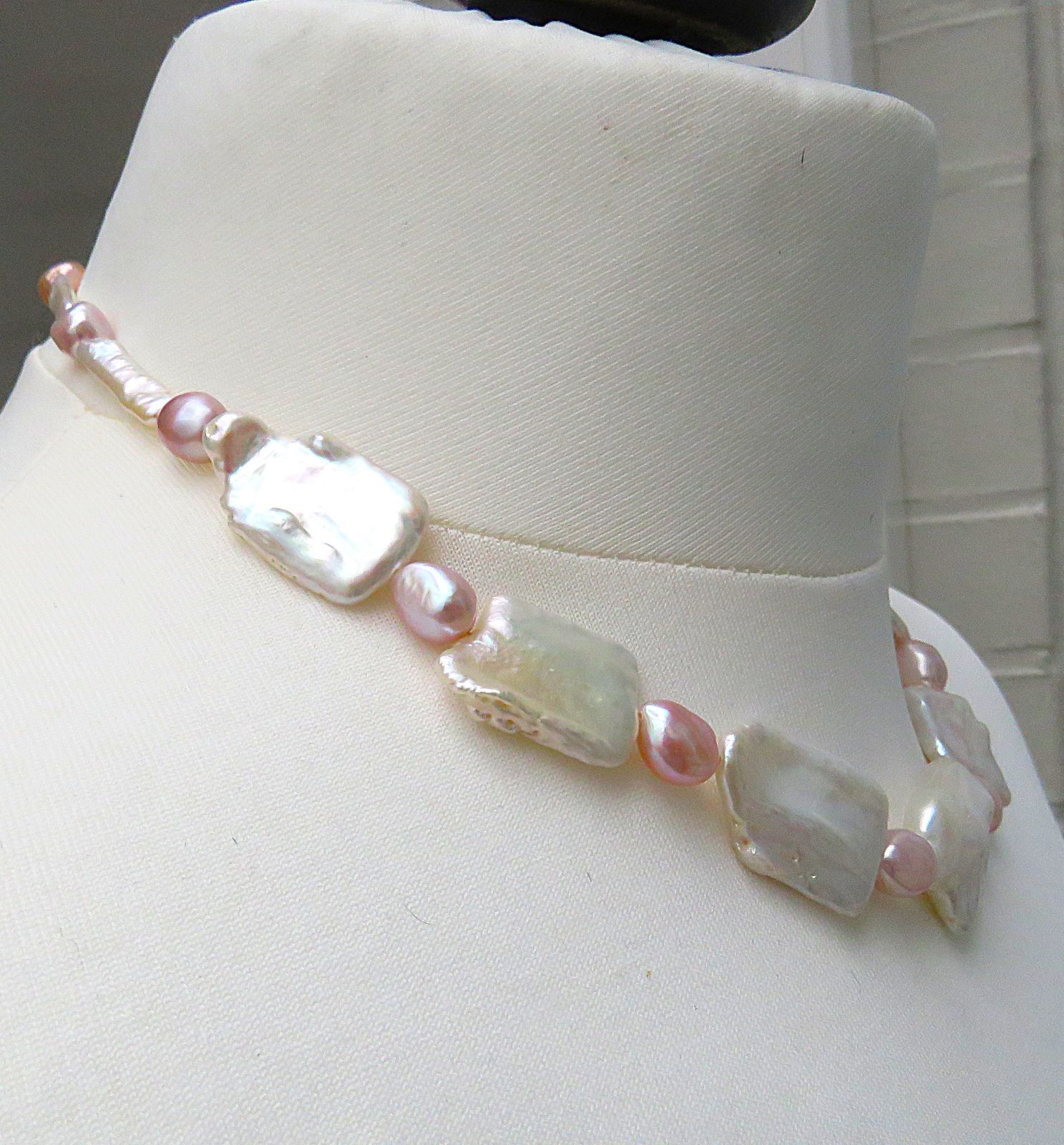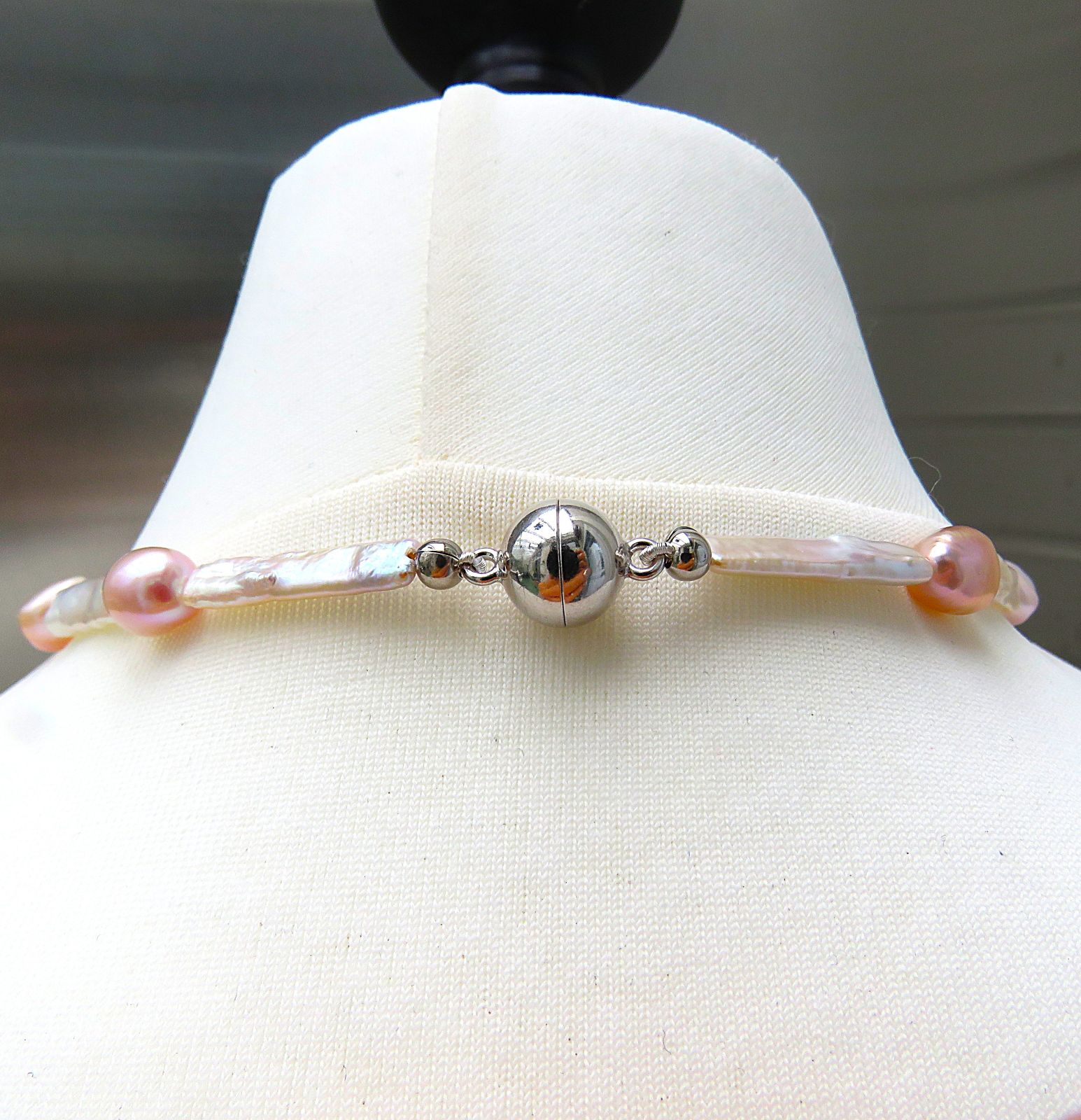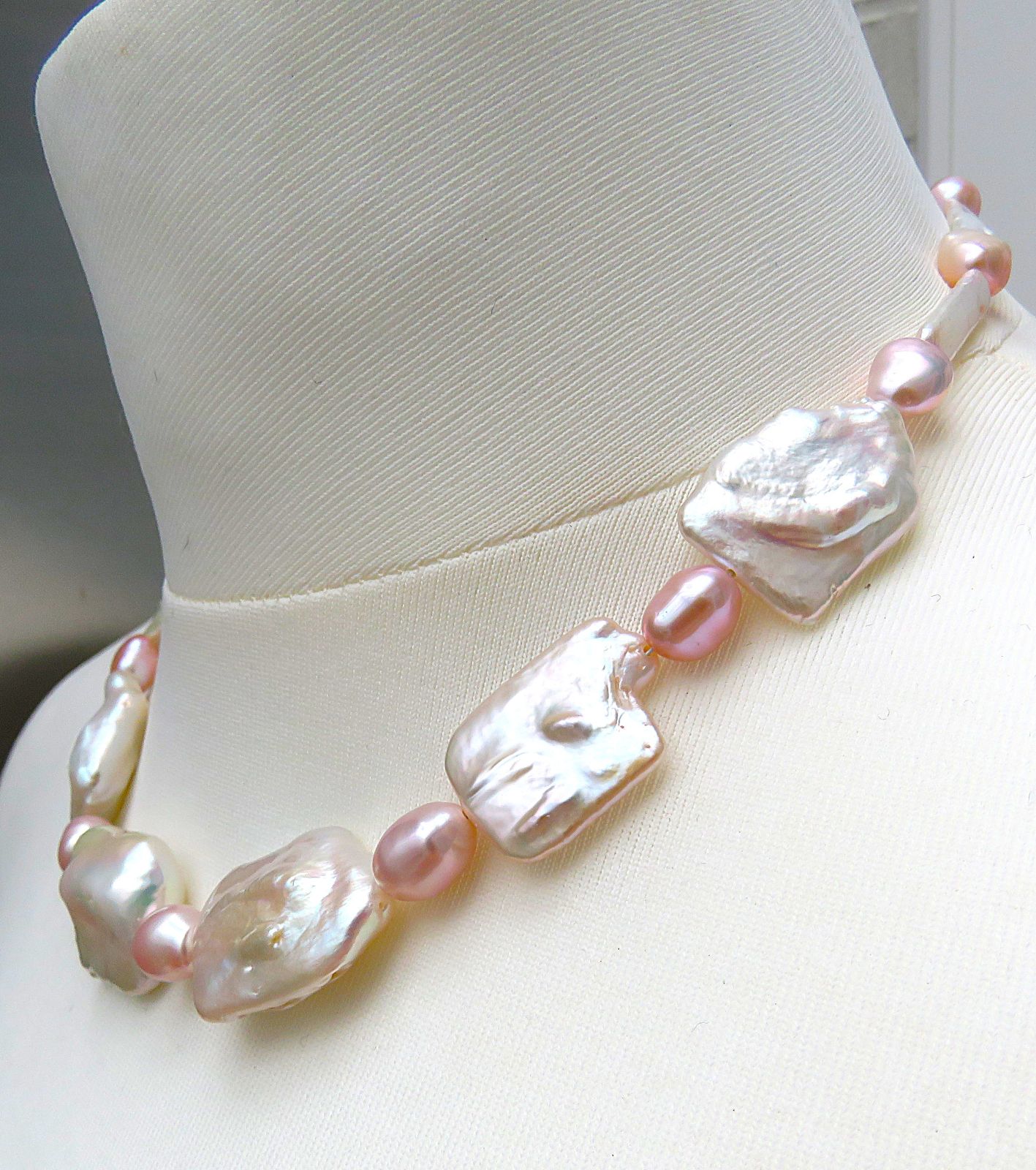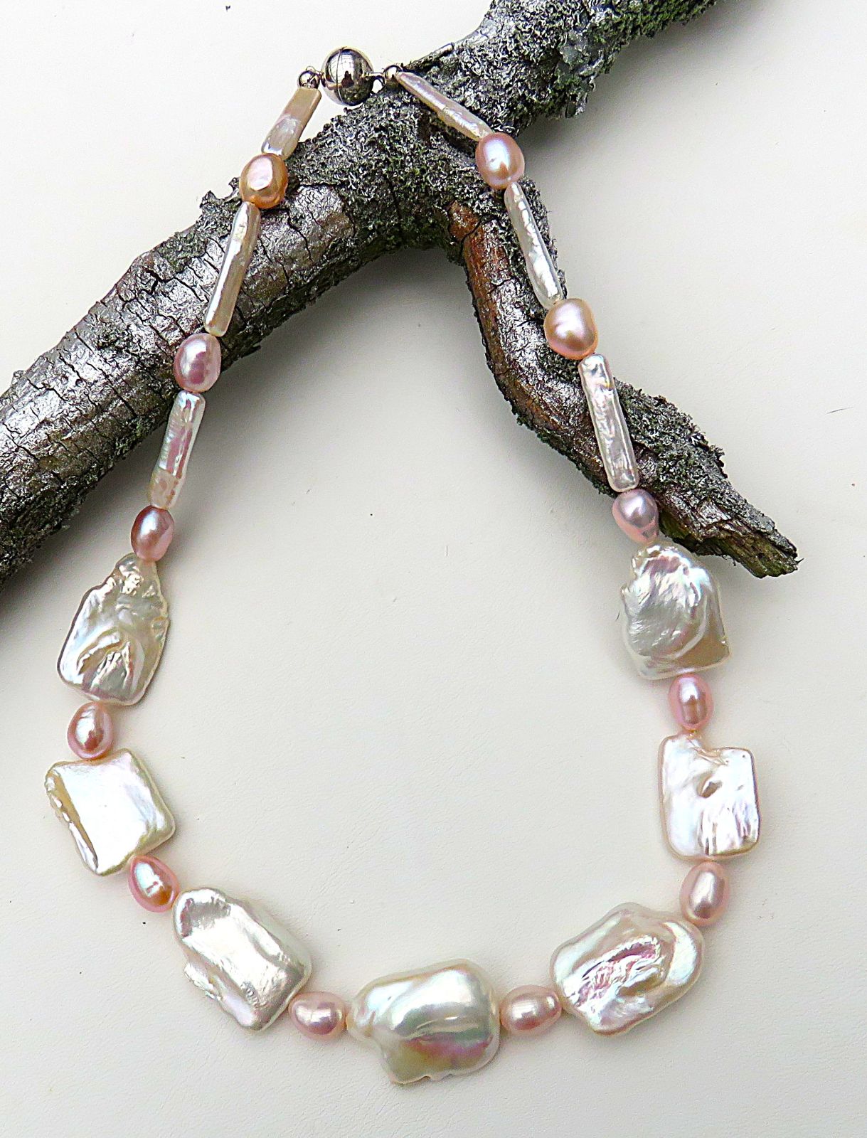 Alle verwendeten Perlen wurden gezüchtet und sind naturfarben. Verarbeitet habe ich riesige rechteckige Biwaperlen, ebenso wie Biwa Perlen in Form von Stäbchen. Sie werden begleitet von kernlosen Perlen in semibarock von natürlichem Rosé.