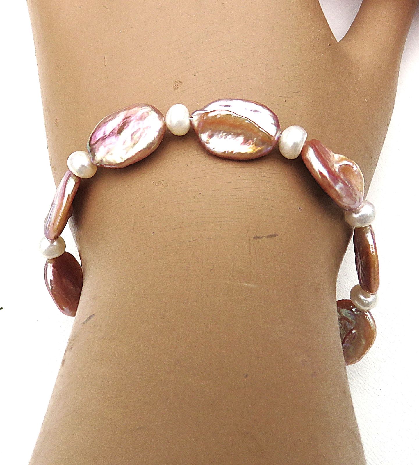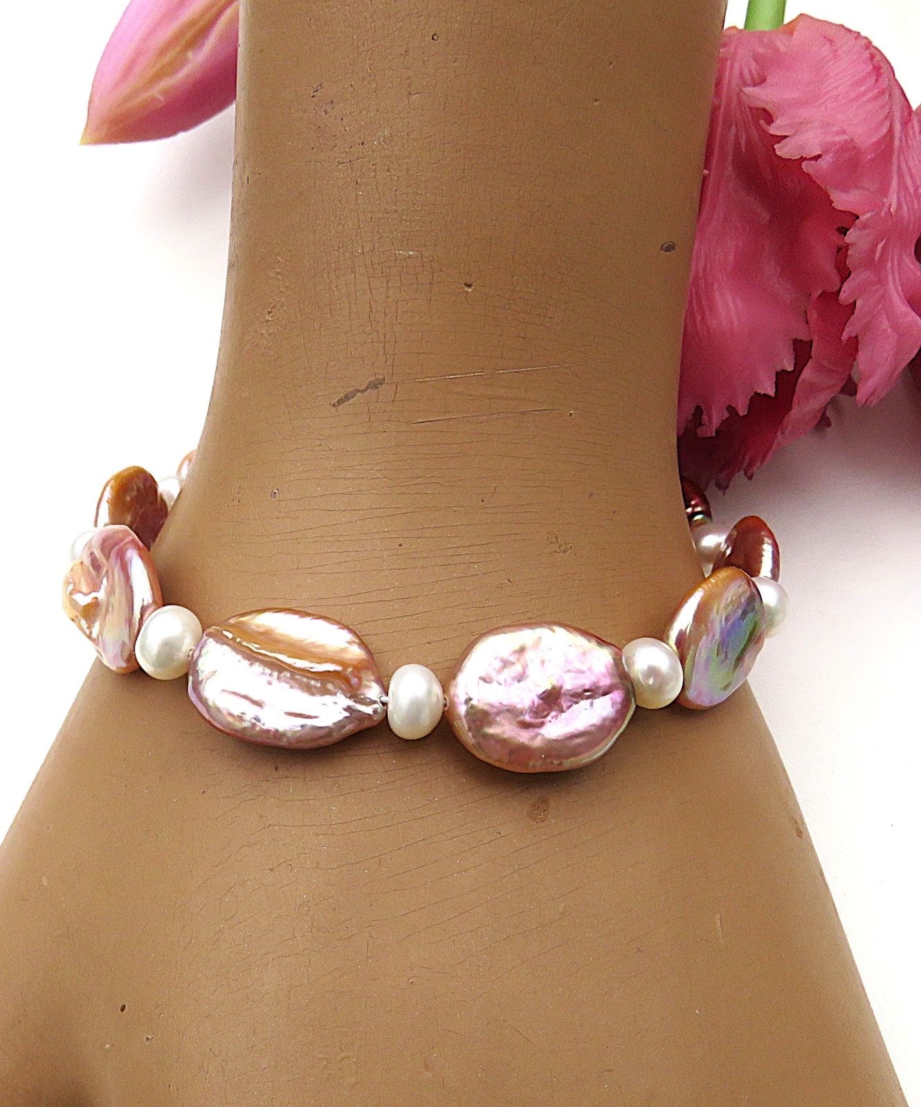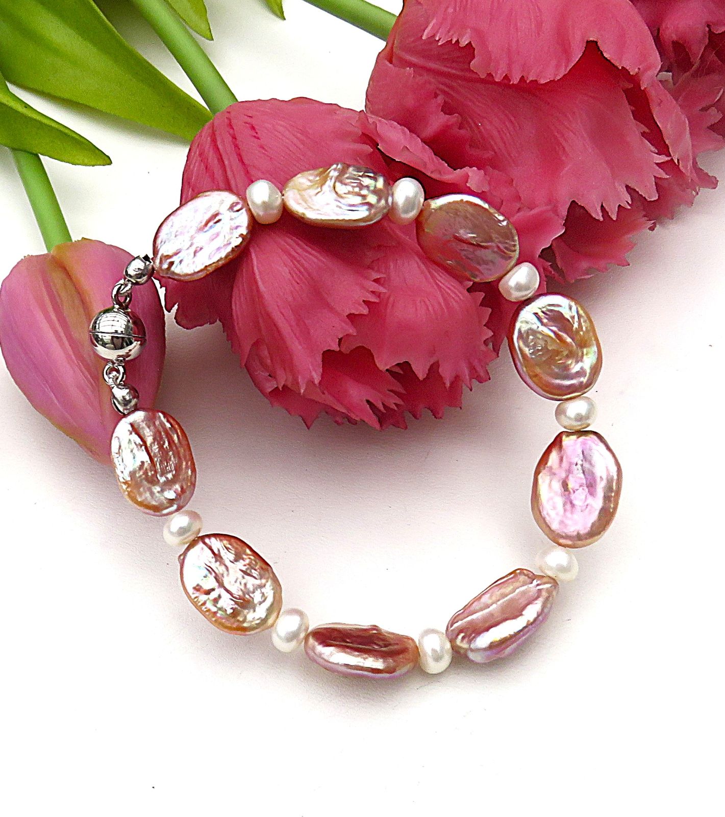 Aus barocken naturfarbenen Coin Perlen in Verbindung mit erstklassigen Süßwasser Bouton Perlen habe ich dieses Armband gefertigt. Es ist mittelgroß ausdrucksvoll und ein Fliegengewicht aufgrund der Coin Perlen. Diese sind zwar ausladend, aber ob ihrer flachen Form sehr leichtgewichtig. Daher verfügt dieses Armband über einen großen Tragekomfort. Denn es liegt flach angeschmiegt am Handgelenk. Diesen 20 cm langen Armschmuck habe ich auf kunststoffummantelten Juwelierdraht gearbeitet. Geschlossen wird das Perlen Armband mit einer 8 mm Magnetschließe aus rhodiniertem Sterlingsilber.