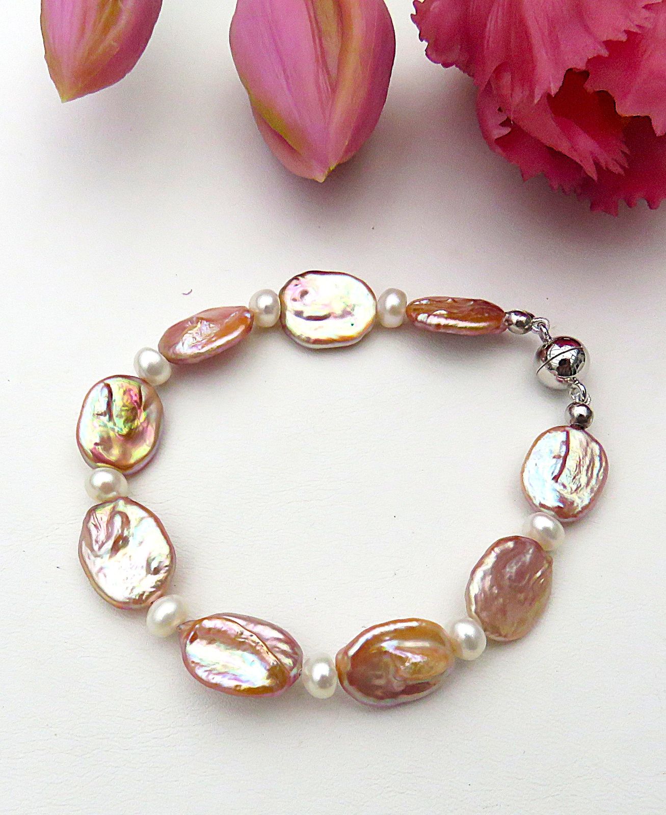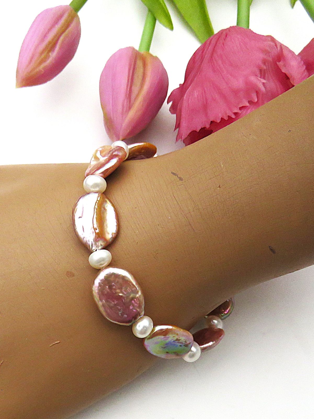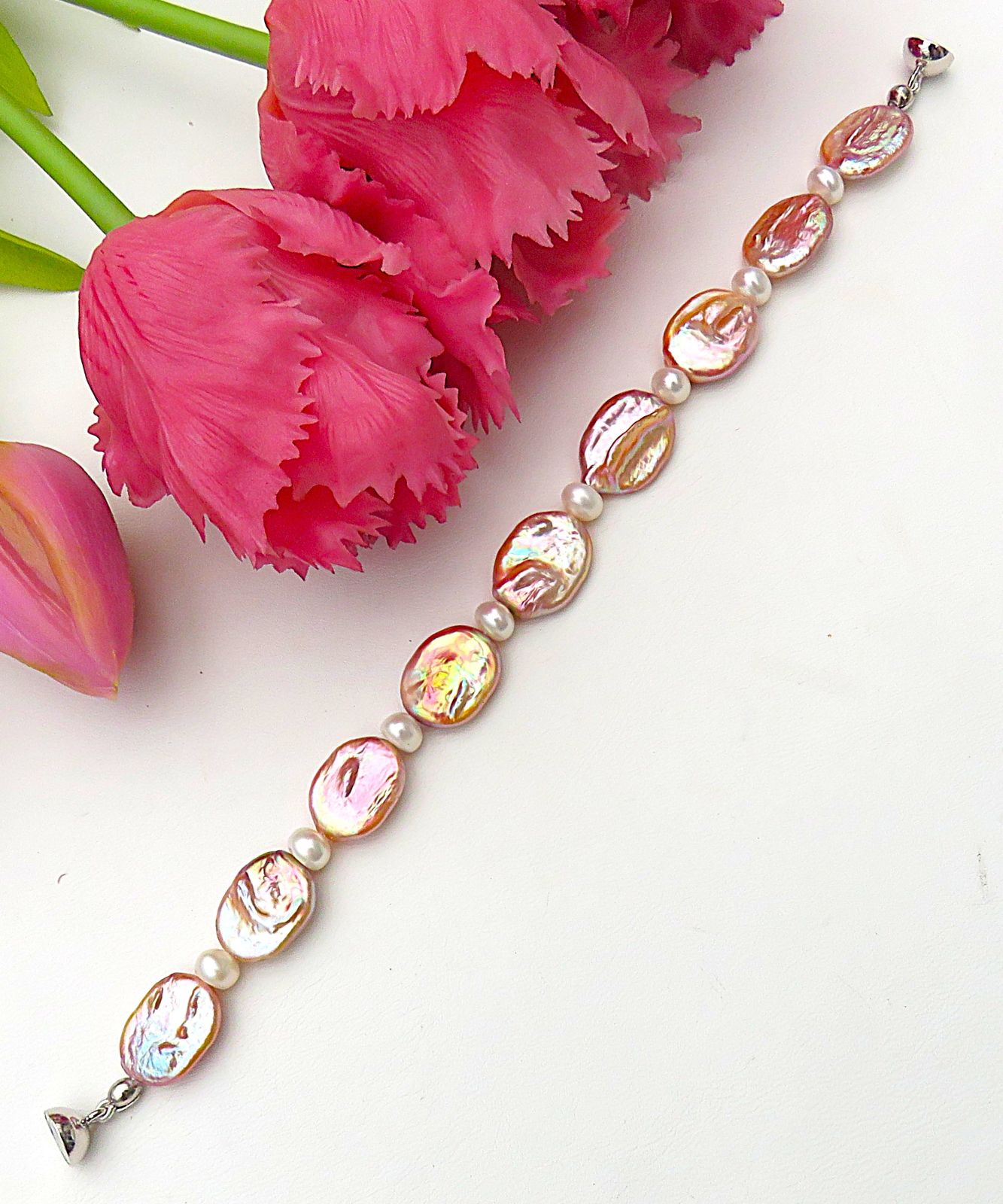 Aus barocken naturfarbenen Coin Perlen in Verbindung mit erstklassigen Süßwasser Bouton Perlen habe ich dieses Armband gefertigt. Es ist mittelgroß ausdrucksvoll und ein Fliegengewicht aufgrund der Coin Perlen. Diese sind zwar ausladend, aber ob ihrer flachen Form sehr leichtgewichtig. Daher verfügt dieses Armband über einen großen Tragekomfort. Denn es liegt flach angeschmiegt am Handgelenk. Diesen 20 cm langen Armschmuck habe ich auf kunststoffummantelten Juwelierdraht gearbeitet. Geschlossen wird das Perlen Armband mit einer 8 mm Magnetschließe aus rhodiniertem Sterlingsilber.