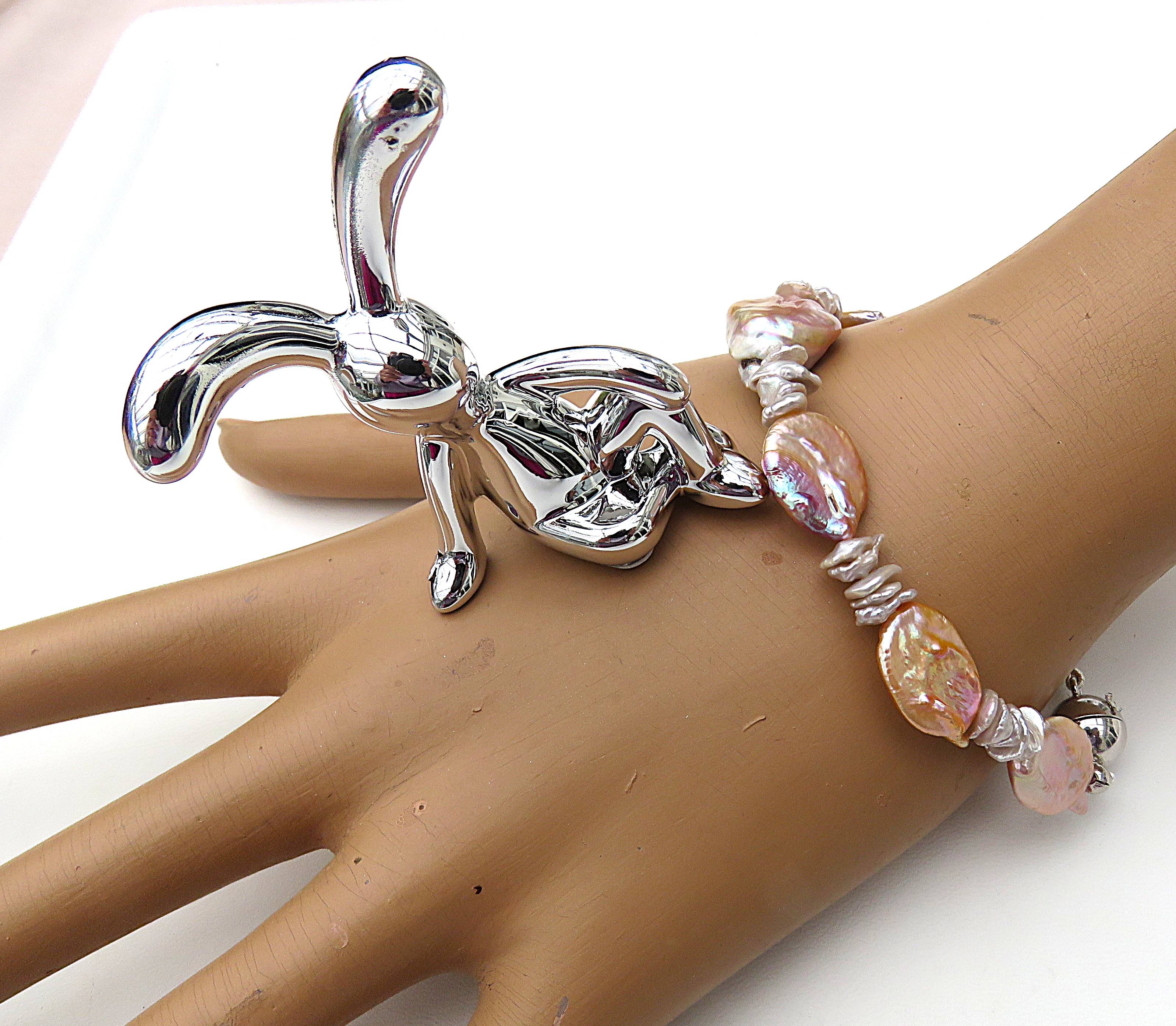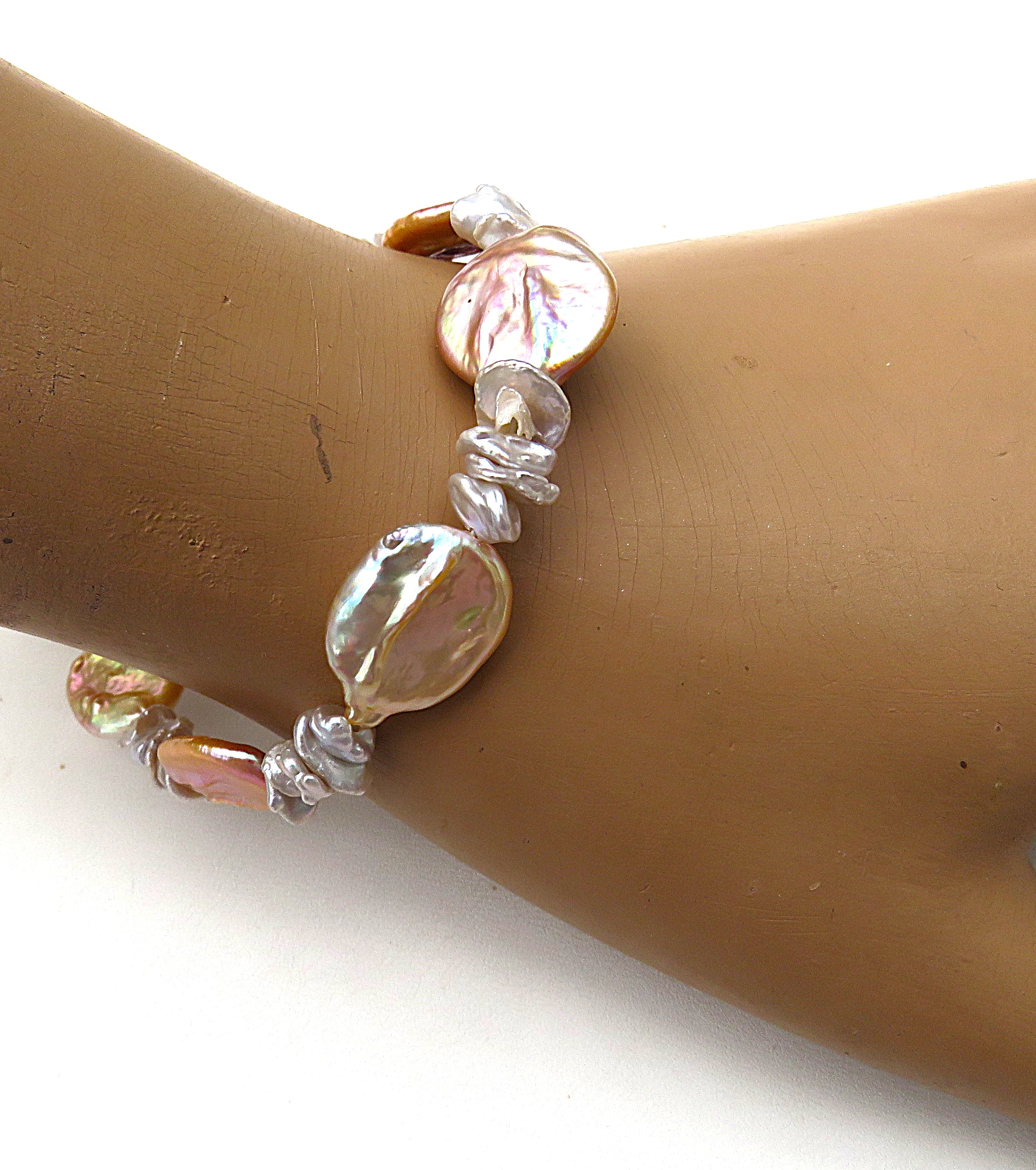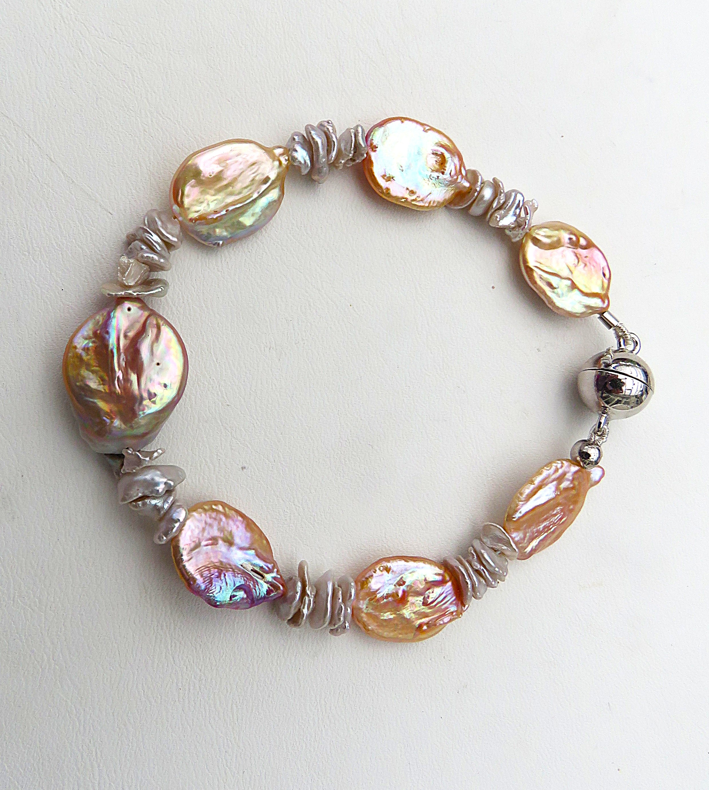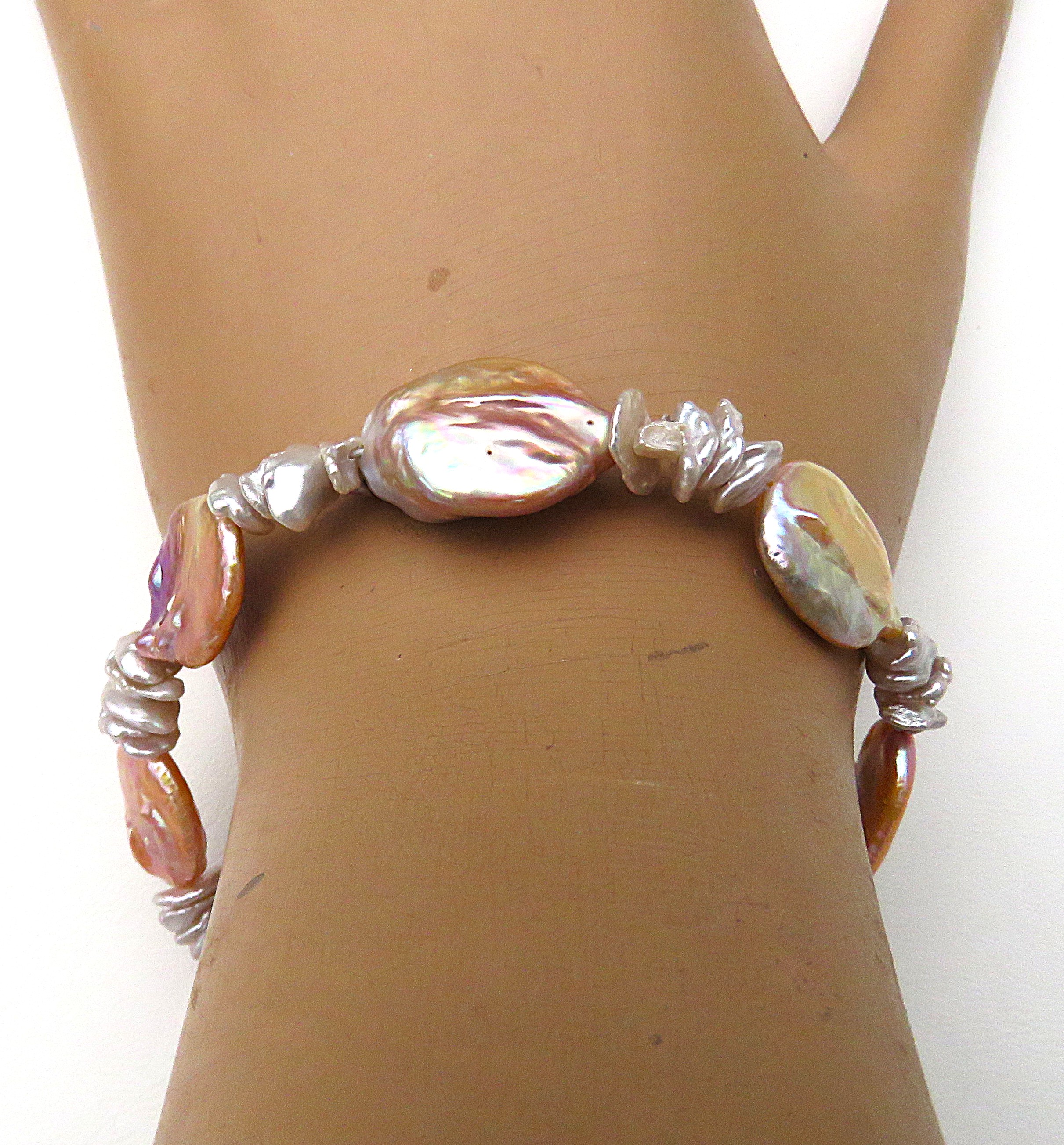 Aus naturfarbenen Keshi Perlen in Verbindung mit ovalen Süßwasser Coin Perlen habe ich dieses Armband gefertigt. Es ist groß und ausdrucksvoll, aber dennoch ein Fliegengewicht aufgrund der Coin Perlen. Diese sind zwar ausladend, aber ob ihrer flachen Form sehr leichtgewichtig. Daher verfügt dieses Armband über einen großen Tragekomfort. Denn es liegt flach angeschmiegt am Handgelenk. Diesen 20 cm langen Armschmuck habe ich auf kunststoffummantelten Juwelierdraht gearbeitet. Geschlossen wird das Perlen Armband mit einer 10 mm Magnetschließe aus rhodiniertem Sterlingsilber.