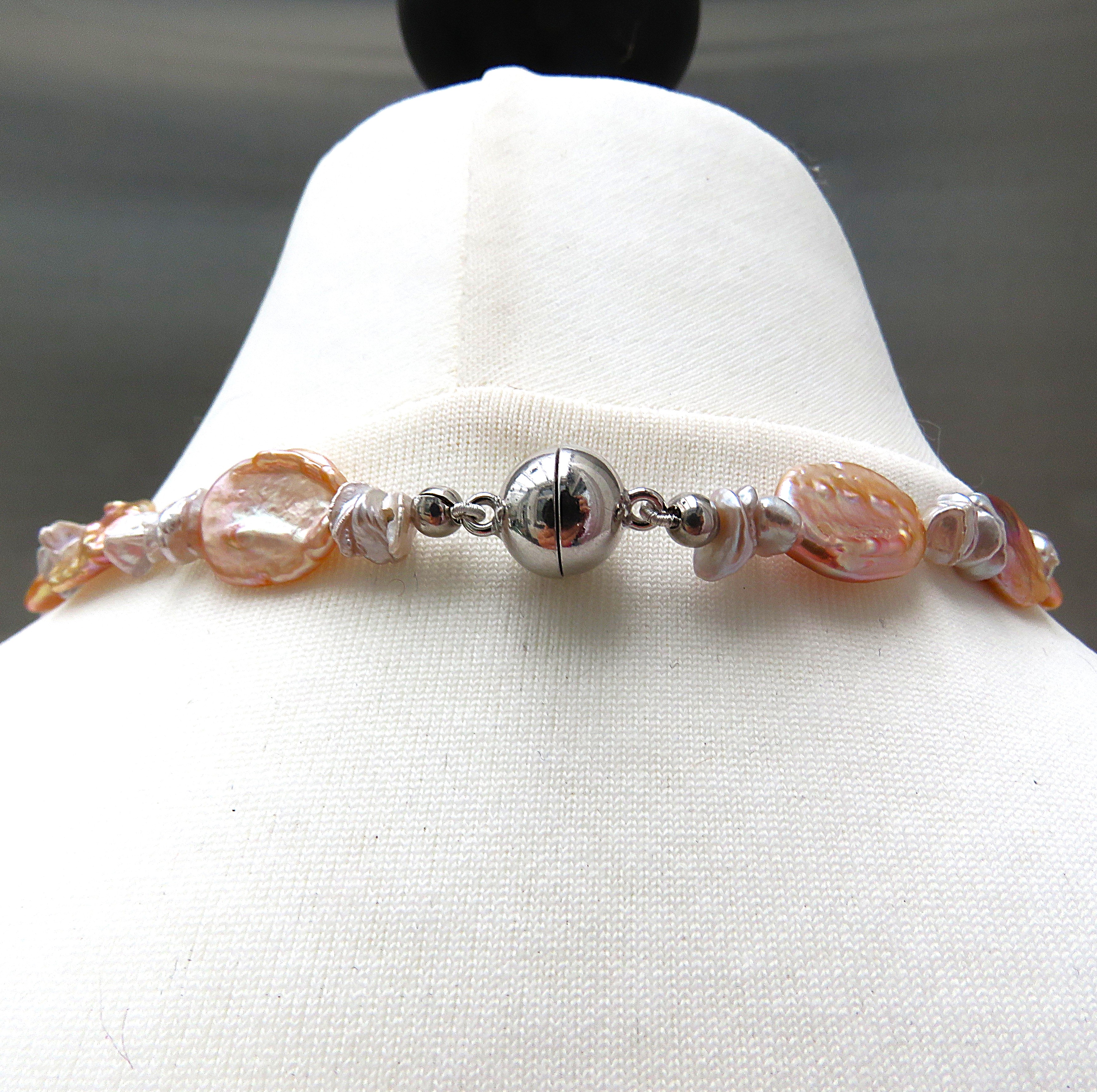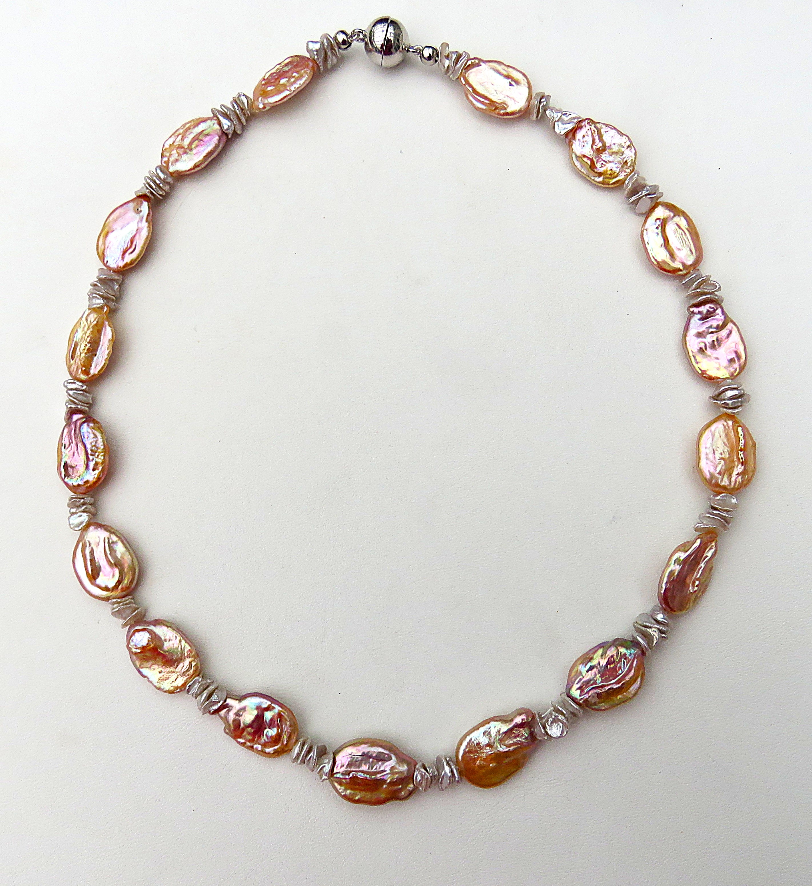 Diese Perlen Kette ist ein weiteres Einzelstück aus meinem Atelier. Verarbeitet habe ich lachsfarbene, sehr barocke Coin Perlen. Sie werden begleitet von Keshi in natürlichem Greige. Die Süßwasser Perlenkette habe ich auf kunststoffummantelten geschmeidigen Juwelierdraht gearbeitet. Geschlossen wird die 44,5 cm lange Kette mit einer 10 mm Magnetschließe aus rhodiniertem Sterlingsilber. Magnetschließen sind für Personen mit Herzschrittmacher NICHT geeignet. Die Coin messen ca. 11,5 x 16,2 bis 12,5 x 18,2 mm Die Keshi in Greige sind ca. 6,5 bis 7,2 mm groß Die Coin Perlen sind, wie oben schon erwähnt, sehr barock. Sie wirken fast wie handmodelliert. Das in Verbindung mit dem exquisiten Lüster garantiert Glamour pur. Die Körperfarbe ist ein helles Lachs, die Überfarben brillieren mit blauen und grünlichen Gletschertönen, mit gleißendem Silber, intensivem Lila und Feuertönen. Einfach hinreißend schön. Die Keshi mit ihrem eigenen und raren natürlichen Körperton halten die einzelnen Coins ein wenig auf Abstand, damit sie ihre extravagante Schönheit so richtig in Szene setzen können. Sie haben Fragen oder Wünsche? Kein Problem. Kontaktieren Sie mich bitte. Ich stehe Ihnen jederzeit gern mit weiteren Auskünften, Vorschlägen oder eigens für Sie ausgefertigten Angeboten zur Verfügung. Das Schmuckstück kommt in exklusiver Verpackung nebst signiertem Echtheits Zertifikat zum Versand. Dies ist ein Service meines Hauses und Ihnen entstehen keinerlei Mehrkosten. |