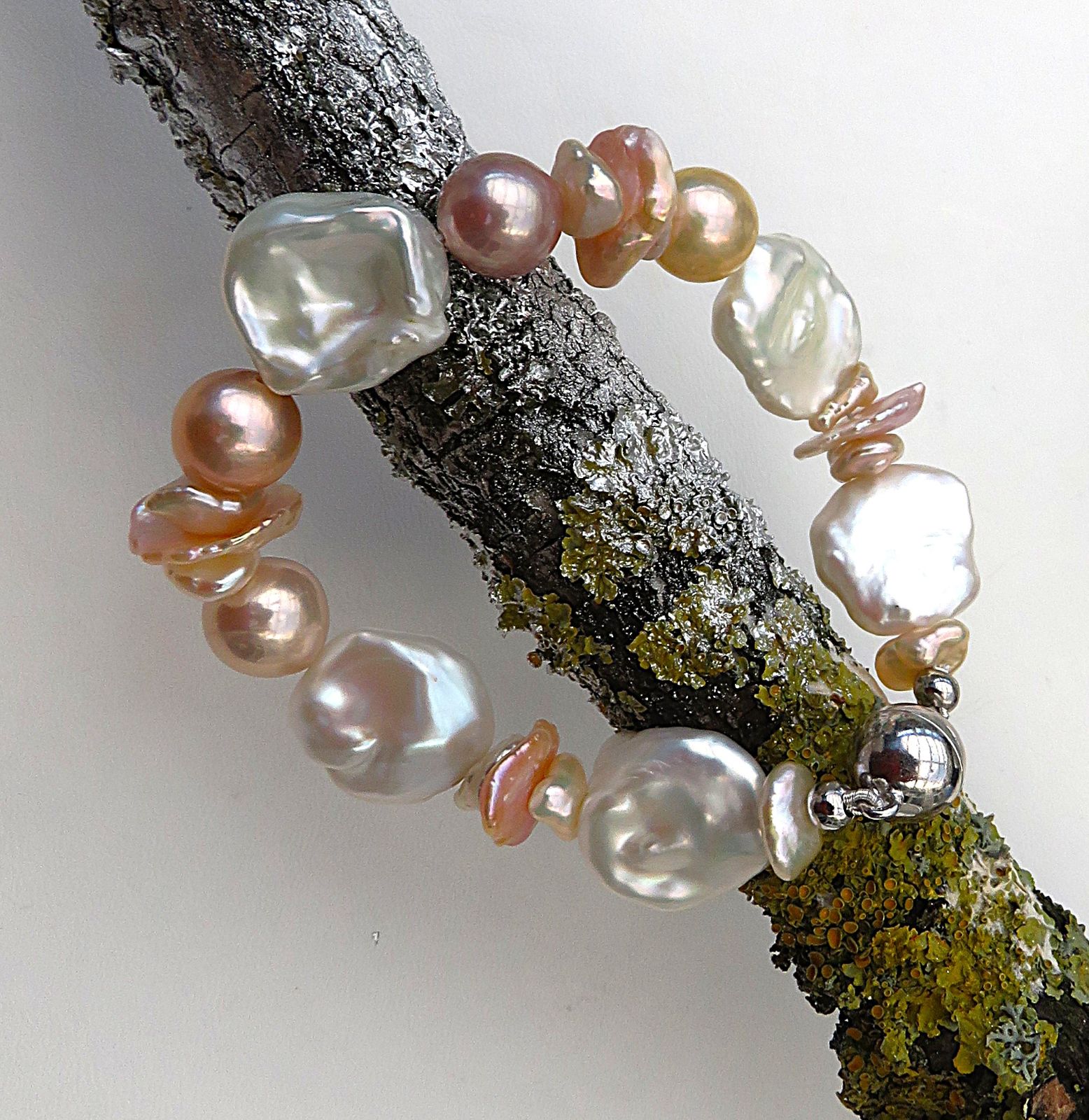 Aus naturfarbenen großen und kleinen Keshi Perlen in Verbindung mit runden Süßwasser Perlen habe ich dieses Armband gefertigt. Es ist groß und ausdrucksvoll, bei gleichzeitigem Tragekomfort, da ich die flachesten Keshi für das Armband ausgewählt habe. So liegen sie flach angeschmiegt am Handgelenk. Diesen 19 cm langen Armschmuck habe ich auf kunststoffummantelten Juwelierdraht gearbeitet. Geschlossen wird das Perlen Armband mit einer 10 mm Magnetschließe aus rhodiniertem Sterlingsilber.