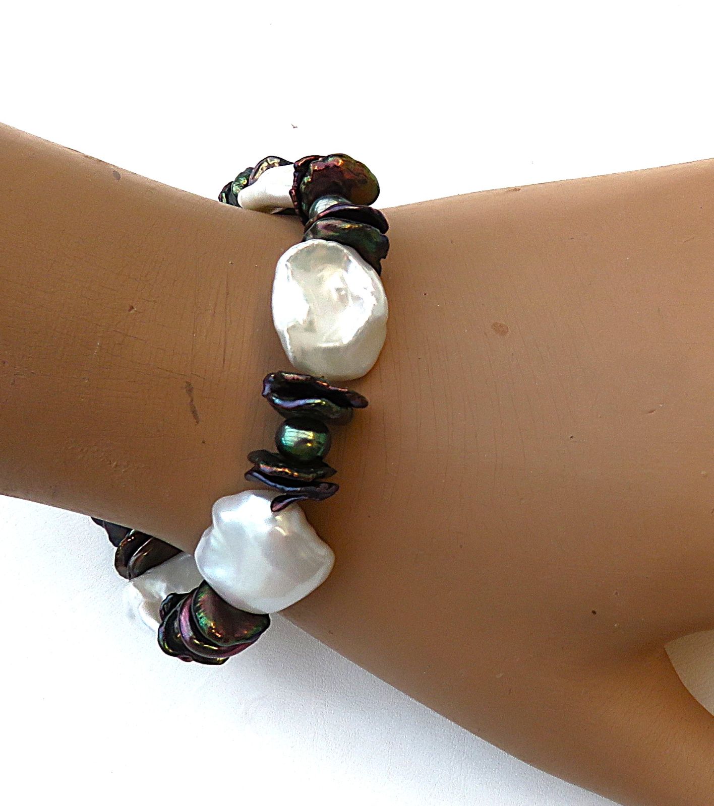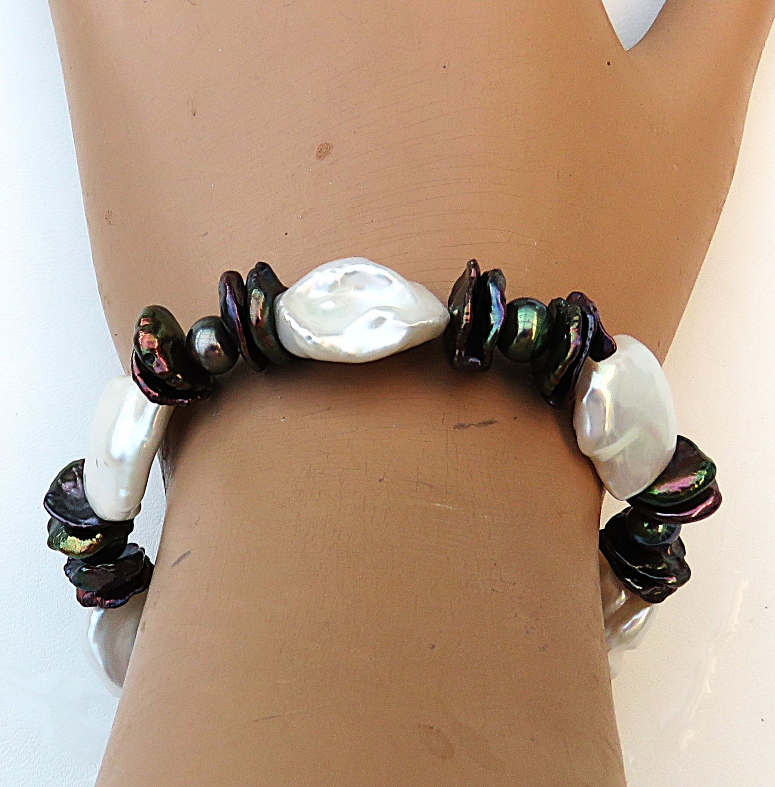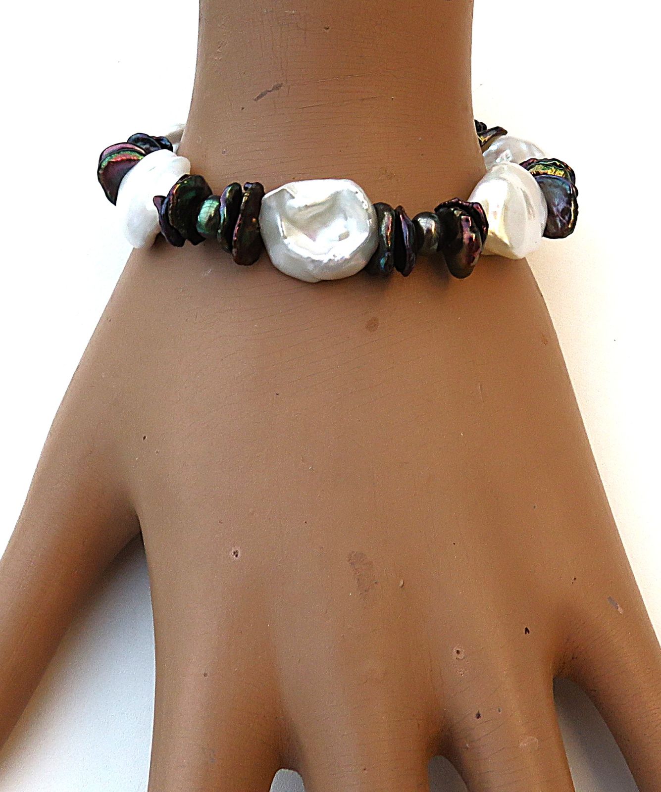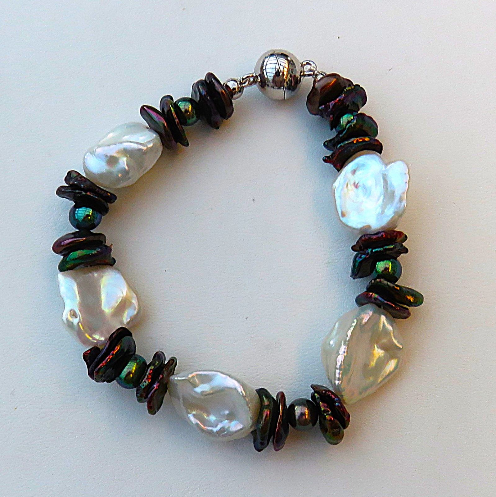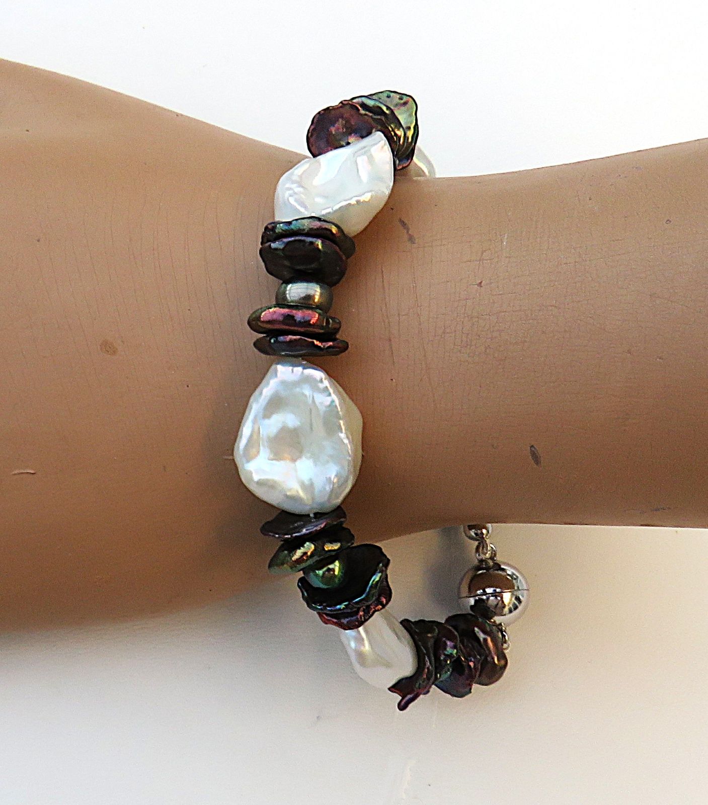 Aus naturfarbenen großen und kleinen schwarz gefärbten Keshi Perlen in Verbindung mit ovalen Süßwasser Perlen habe ich dieses Armband gefertigt. Es ist groß und ausdrucksvoll, bei gleichzeitigem Tragekomfort, da ich die flachesten Keshi für das Armband ausgewählt habe. So liegen sie flach angeschmiegt am Handgelenk. Diesen 1,5 cm langen Armschmuck habe ich auf kunststoffummantelten Juwelierdraht gearbeitet. Geschlossen wird das Perlen Armband mit einer 10 mm Magnetschließe aus rhodiniertem Sterlingsilber.