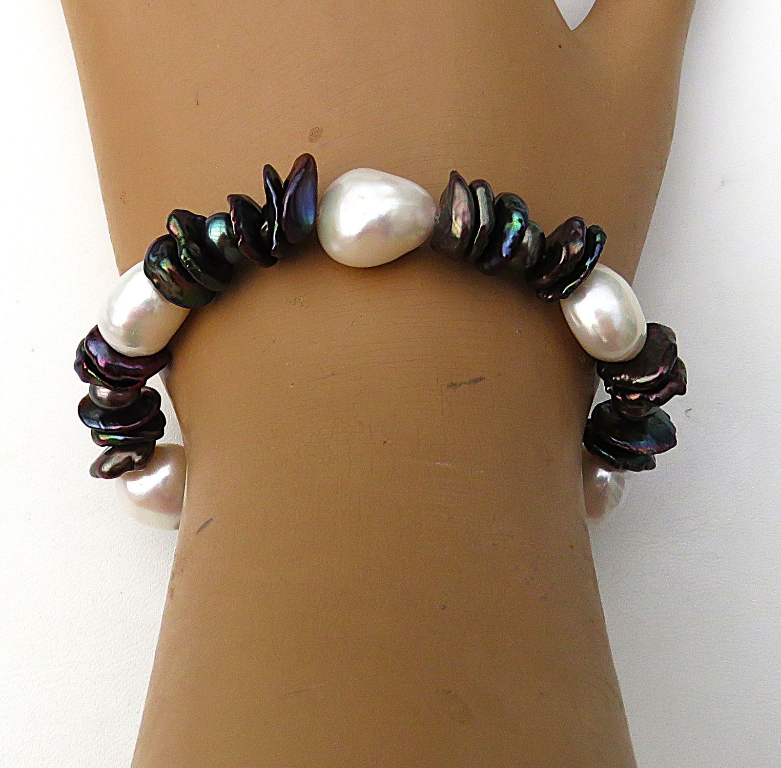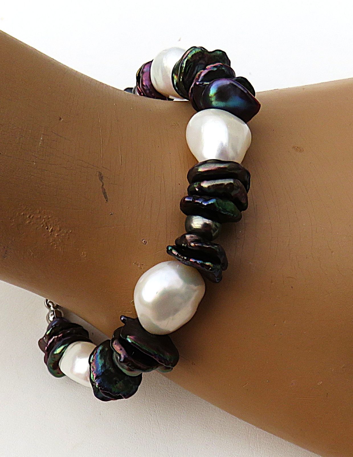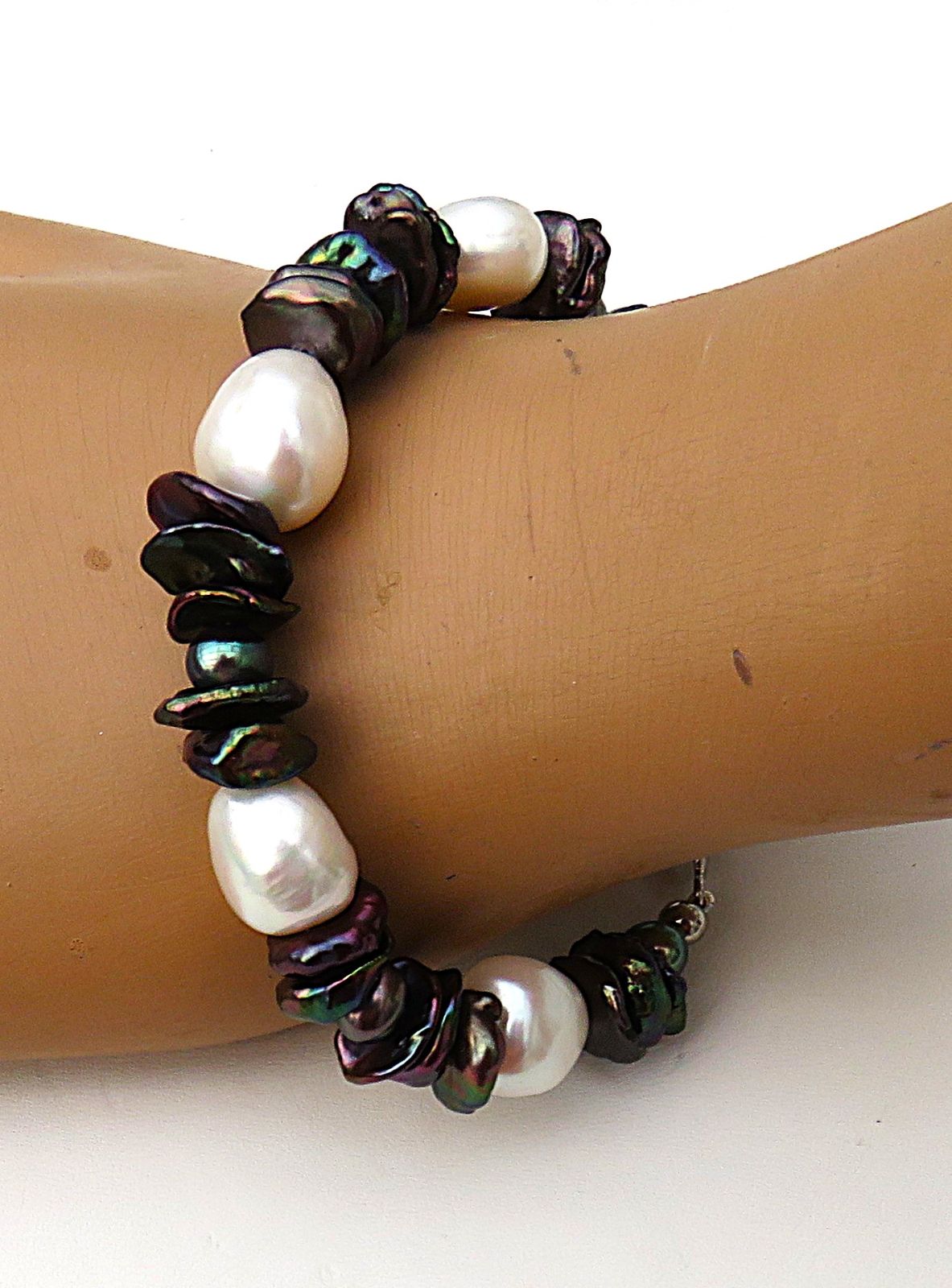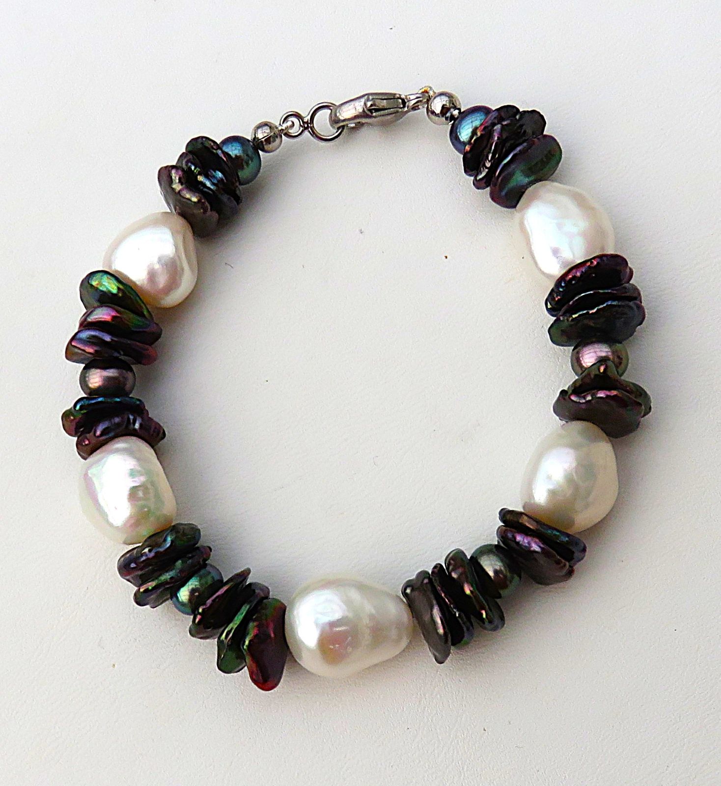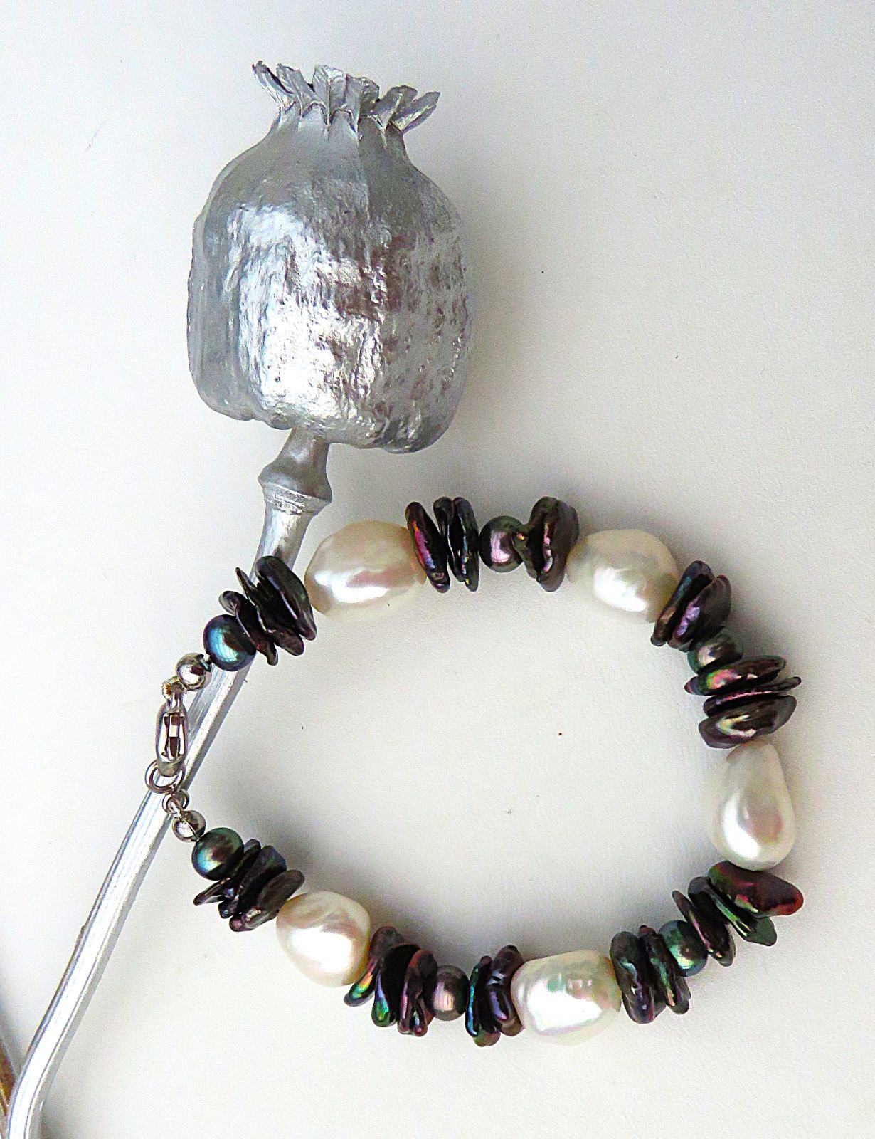 Aus naturfarbenen großen Flats und kleinen schwarz gefärbten Keshi Perlen in Verbindung mit ovalen Süßwasser Perlen habe ich dieses Armband gefertigt. Es ist groß und ausdrucksvoll, bei gleichzeitigem Tragekomfort, da ich die flachesten Flats für das Armband ausgewählt habe. So liegen sie flach angeschmiegt am Handgelenk. Diesen 19 cm langen Armschmuck habe ich auf kunststoffummantelten Juwelierdraht gearbeitet. Geschlossen wird das Perlen Armband mit einem 13 mm Karabiner mit doppelter Gegenöse aus rhodiniertem Sterlingsilber.