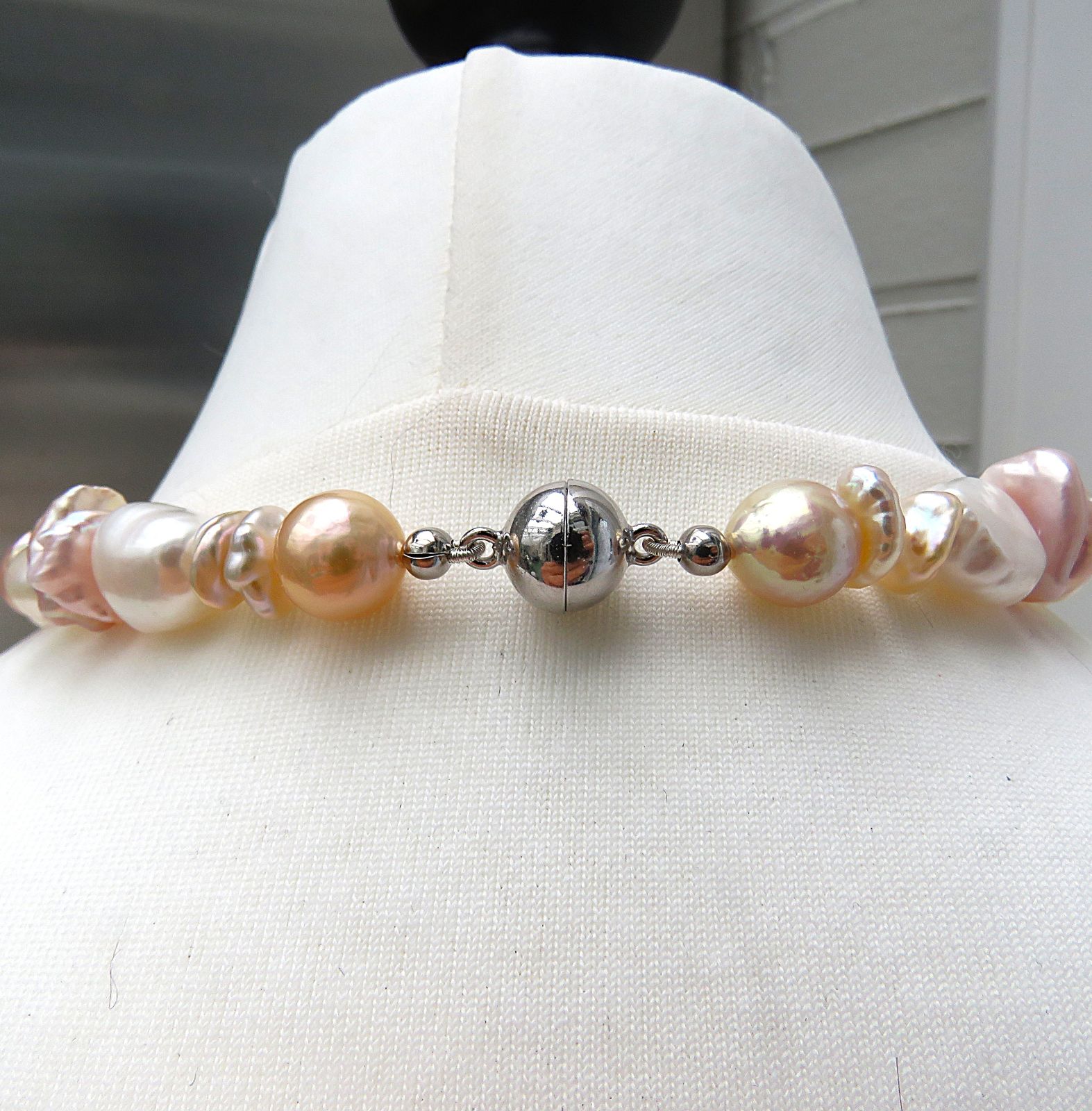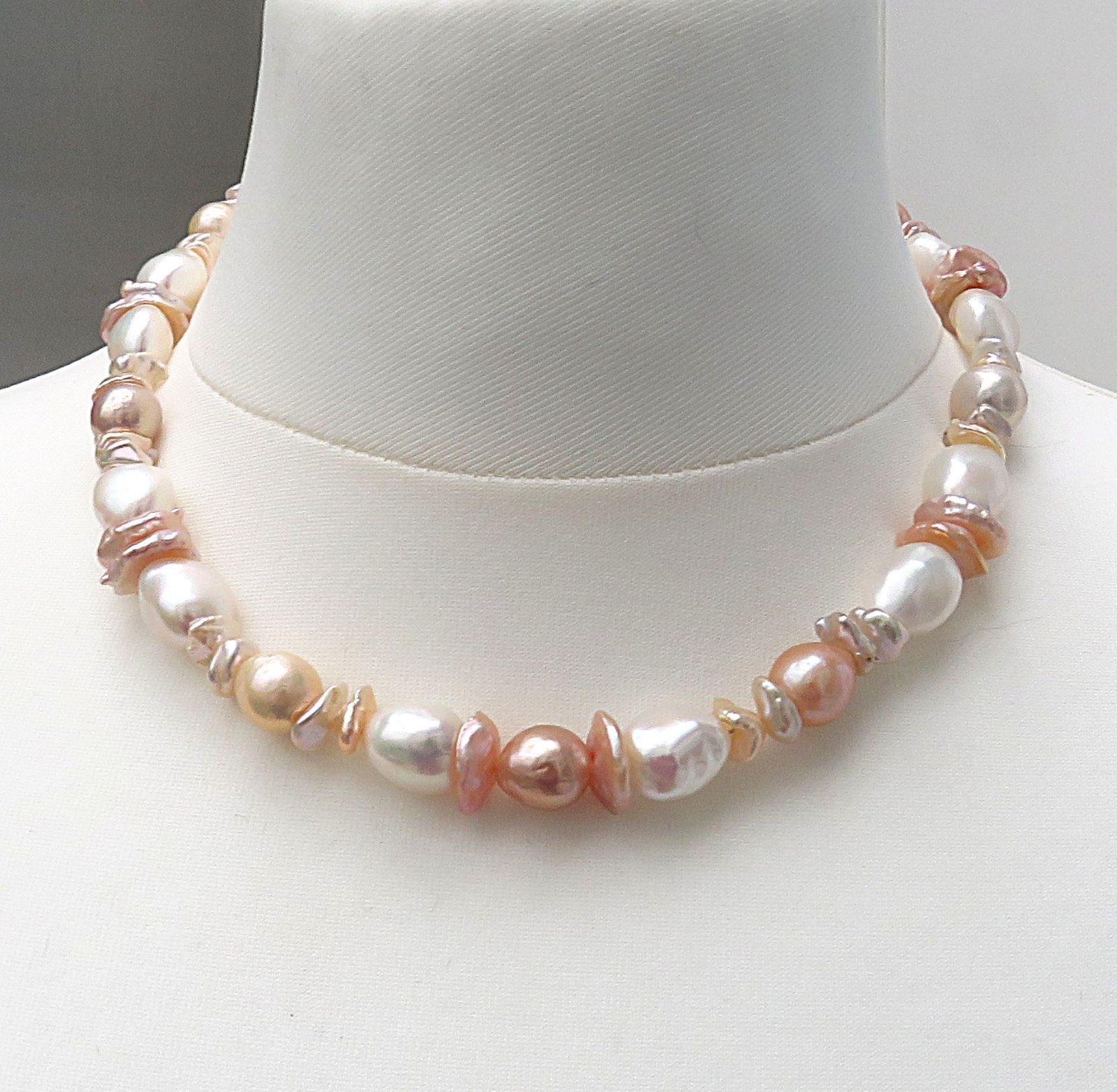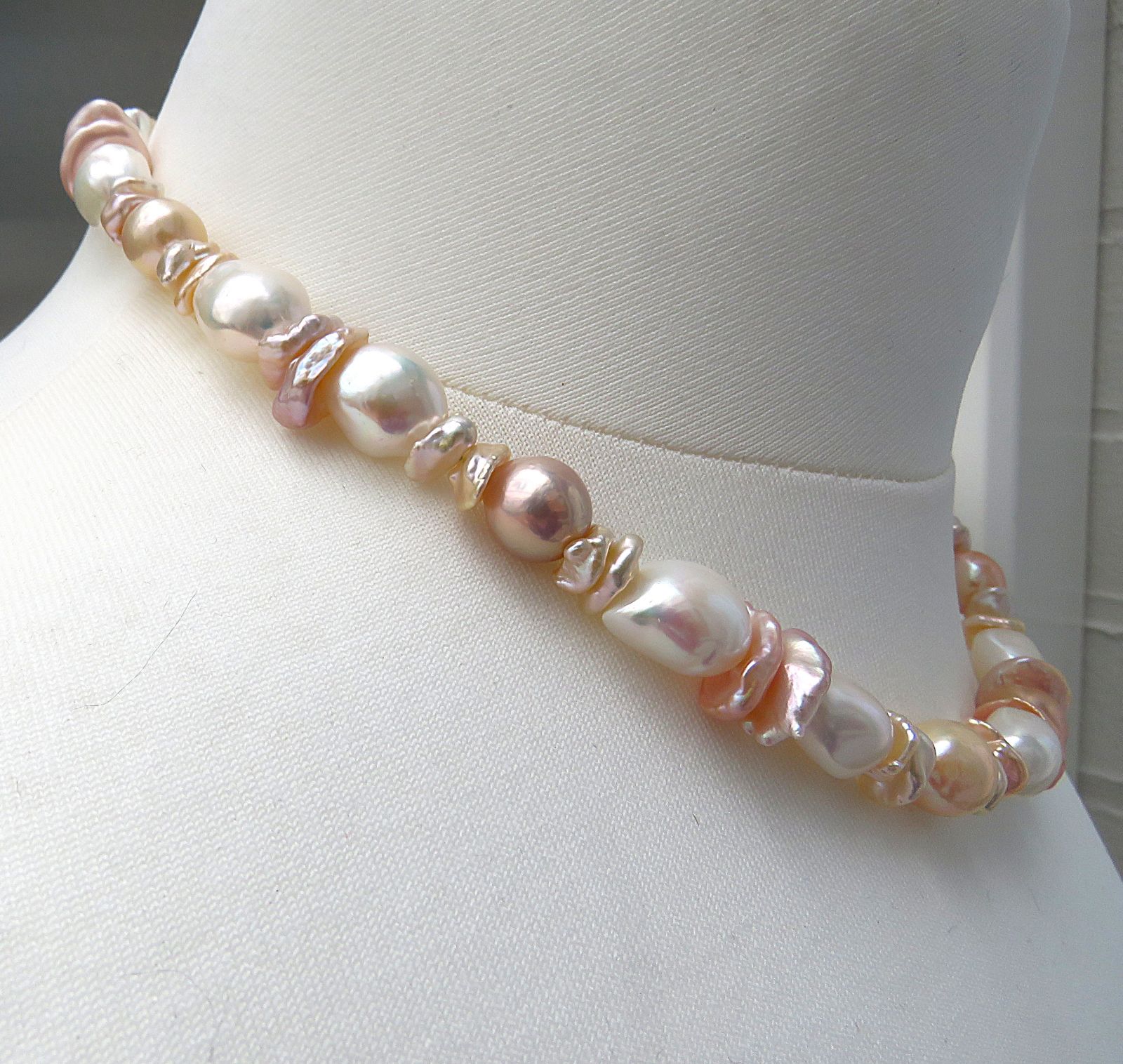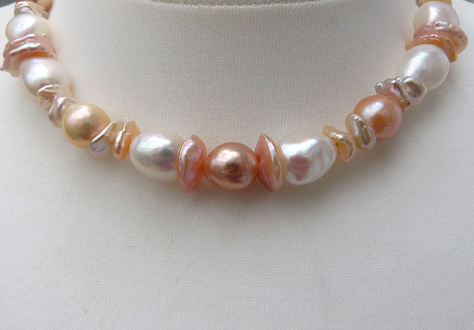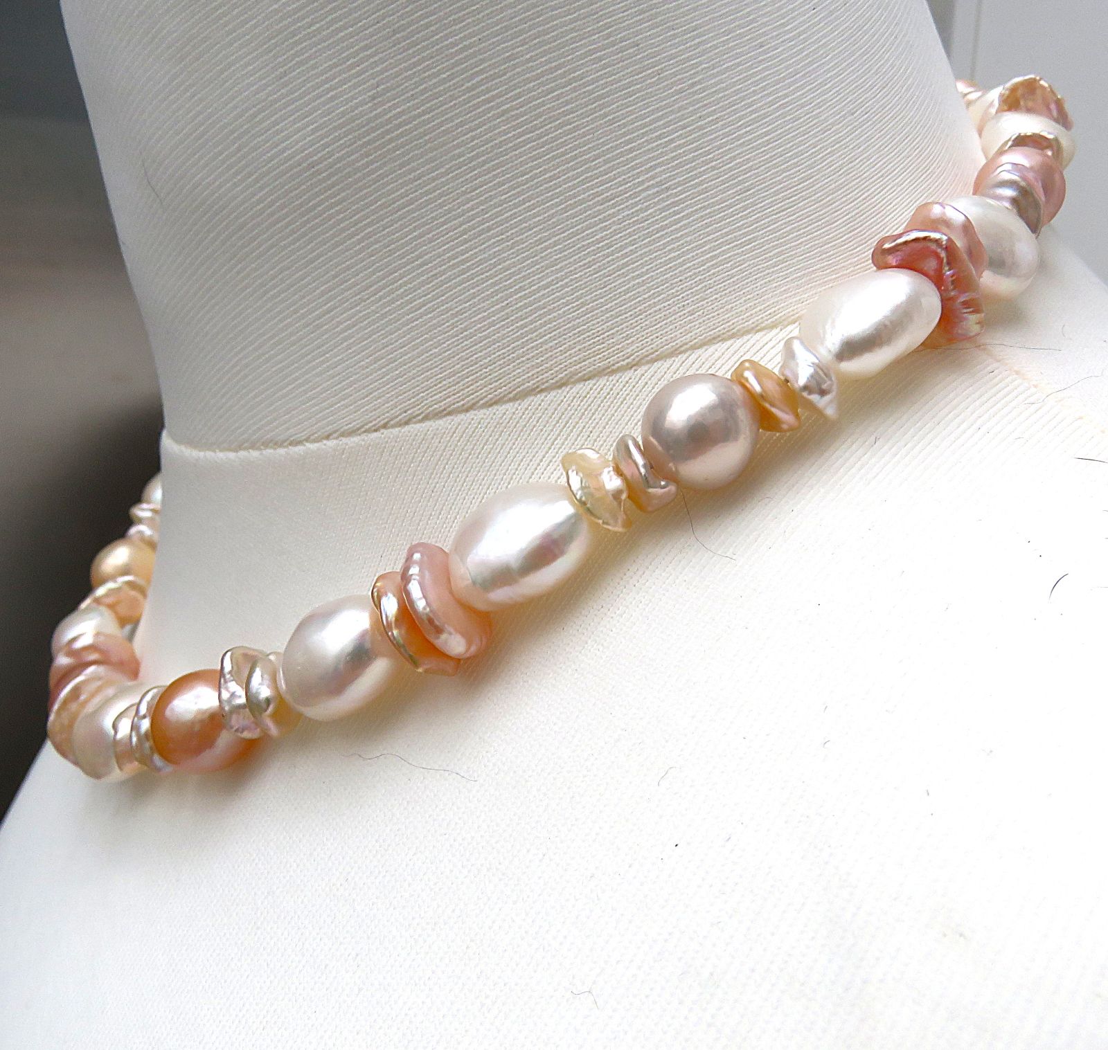 In diesem Süßwasserperlen Collier habe ich Keshi Perlen in zwei verschiedenen Größen zusammen mit großen Flats und runden Perlen kombiniert. Diese habe ich dann im Rapport arrangiert. Alle verwendeten Perlen sind naturfarben. Sie brillieren von strahlendem Silberweiß bis hin zu zarten Gold-, Rosé- und Kupfernuancen. Alle Perlen verfügen über ein unglaublich gutes Lüster und die Perlen scheinen sich gegenseitig mit ihrer Brillanz ausstechen zu wollen. Qualitativ sind alle verwendeten Perlen hochwertig.