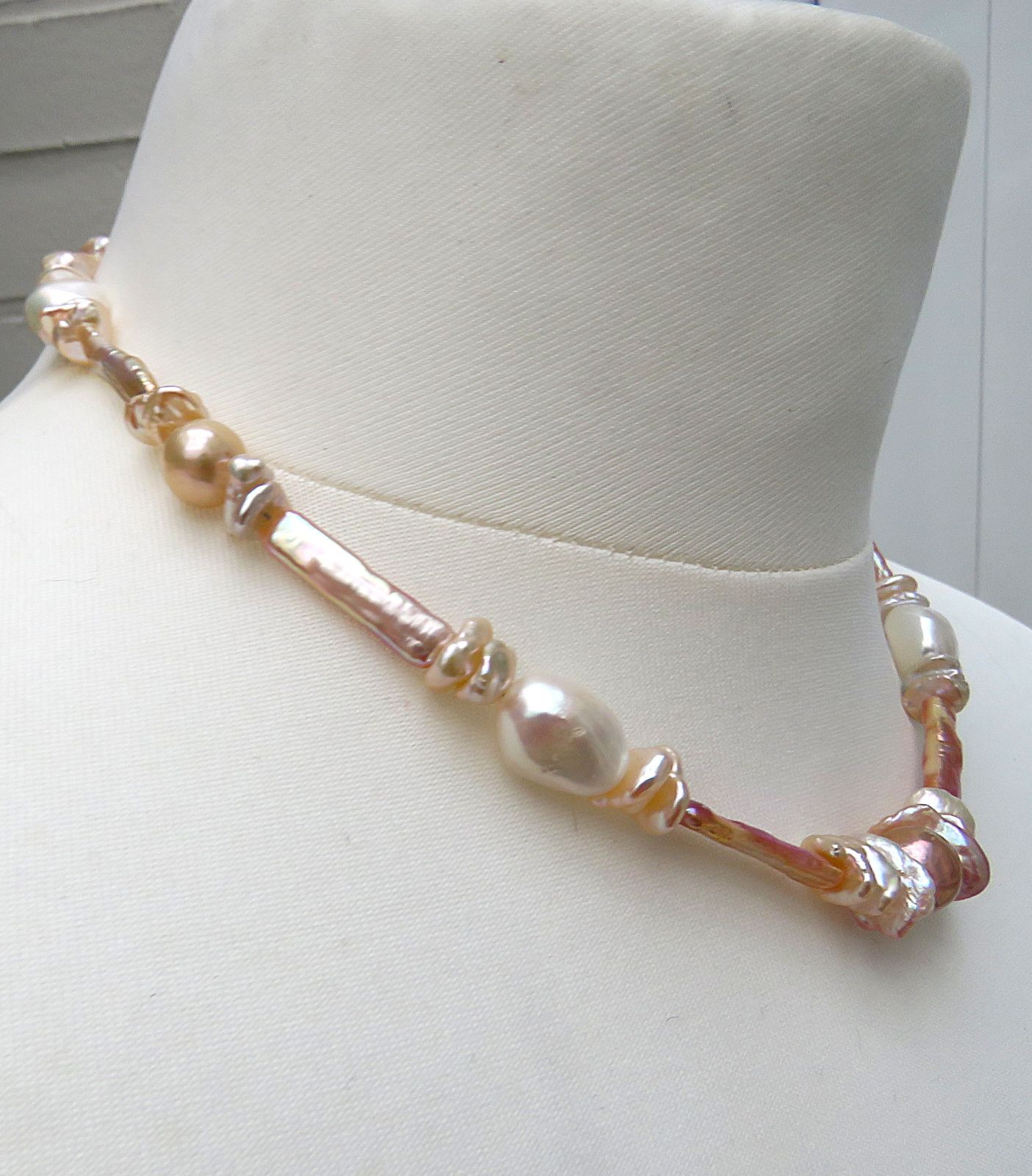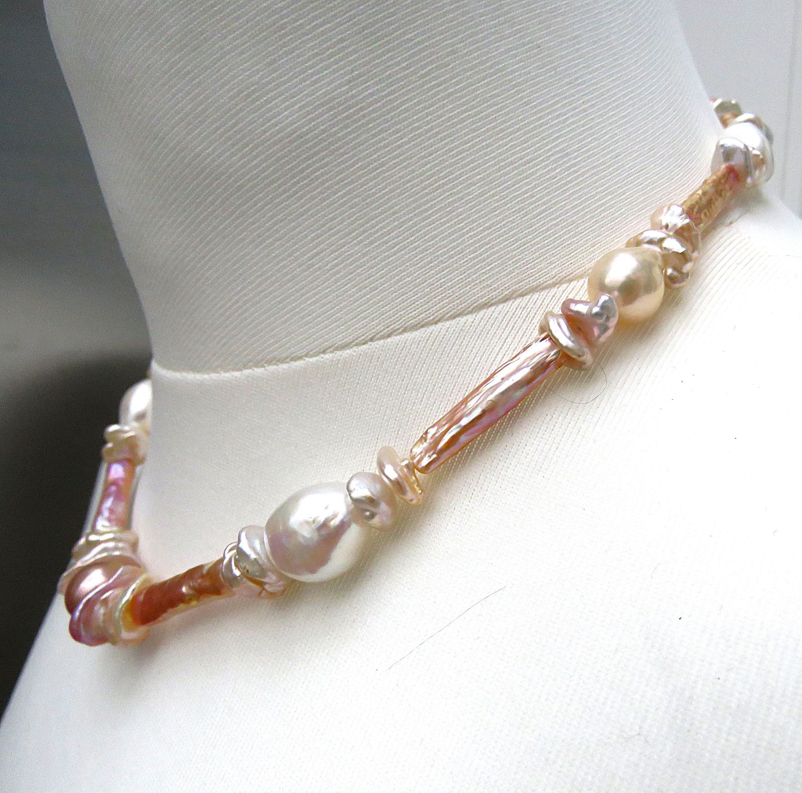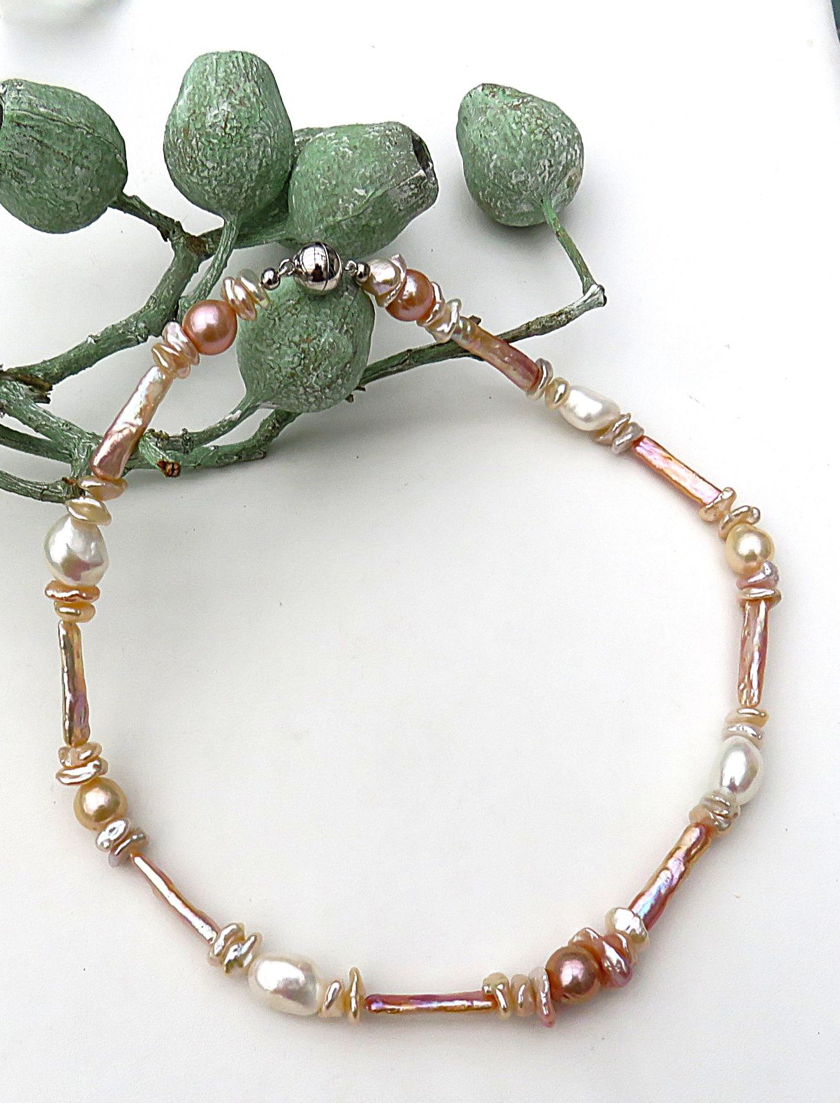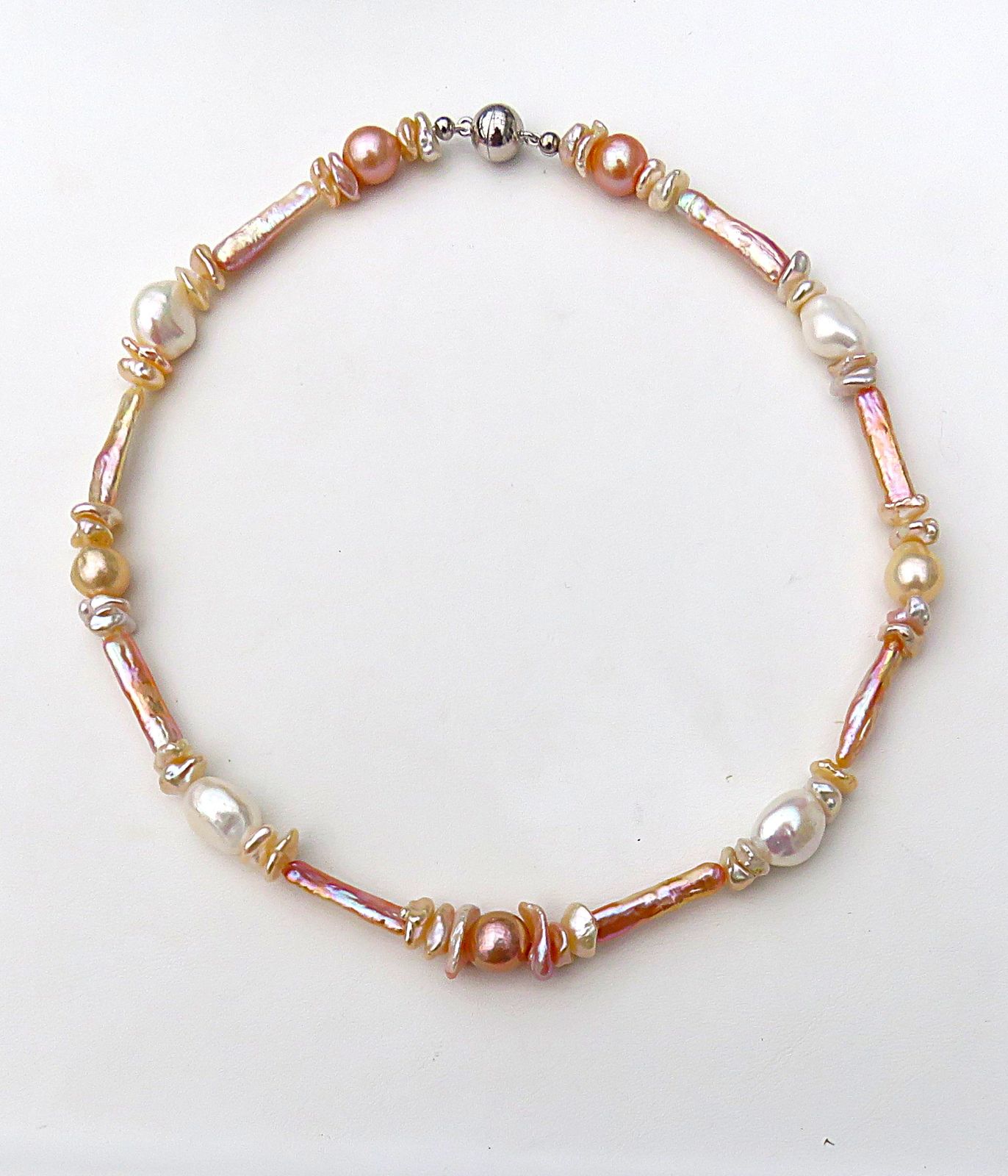 In diesem Süßwasserperlen Collier habe ich Keshi Perlen zusammen mit großen Flats und grazilen Stäbchen Perlen kombiniert. Diese habe ich dann im Rapport arrangiert. Alle verwendeten Perlen sind naturfarben. Sie brillieren von strahlendem Silberweiß bis hin zu zarten Gold-, Rosé- und intensiven Feuernuancen. Alle Perlen verfügen über ein unglaublich gutes Lüster und die Perlen scheinen sich gegenseitig mit ihrer Brillanz ausstechen zu wollen. Qualitativ sind alle verwendeten Perlen hochwertig.