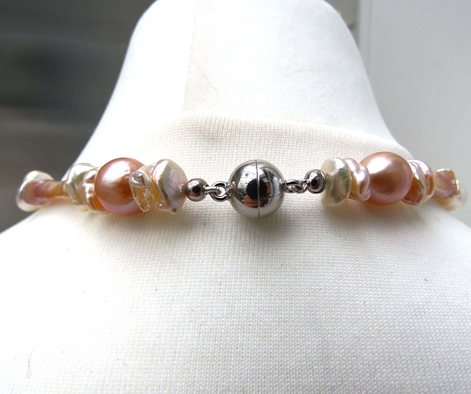 Gearbeitet habe ich das 45 cm lange Perlen Collier auf kunststoffummantelten Juwelierdraht. Geschlossen wird es mit einem 10 mm Magnetschließe aus rhodiniertem Sterlingsilber.