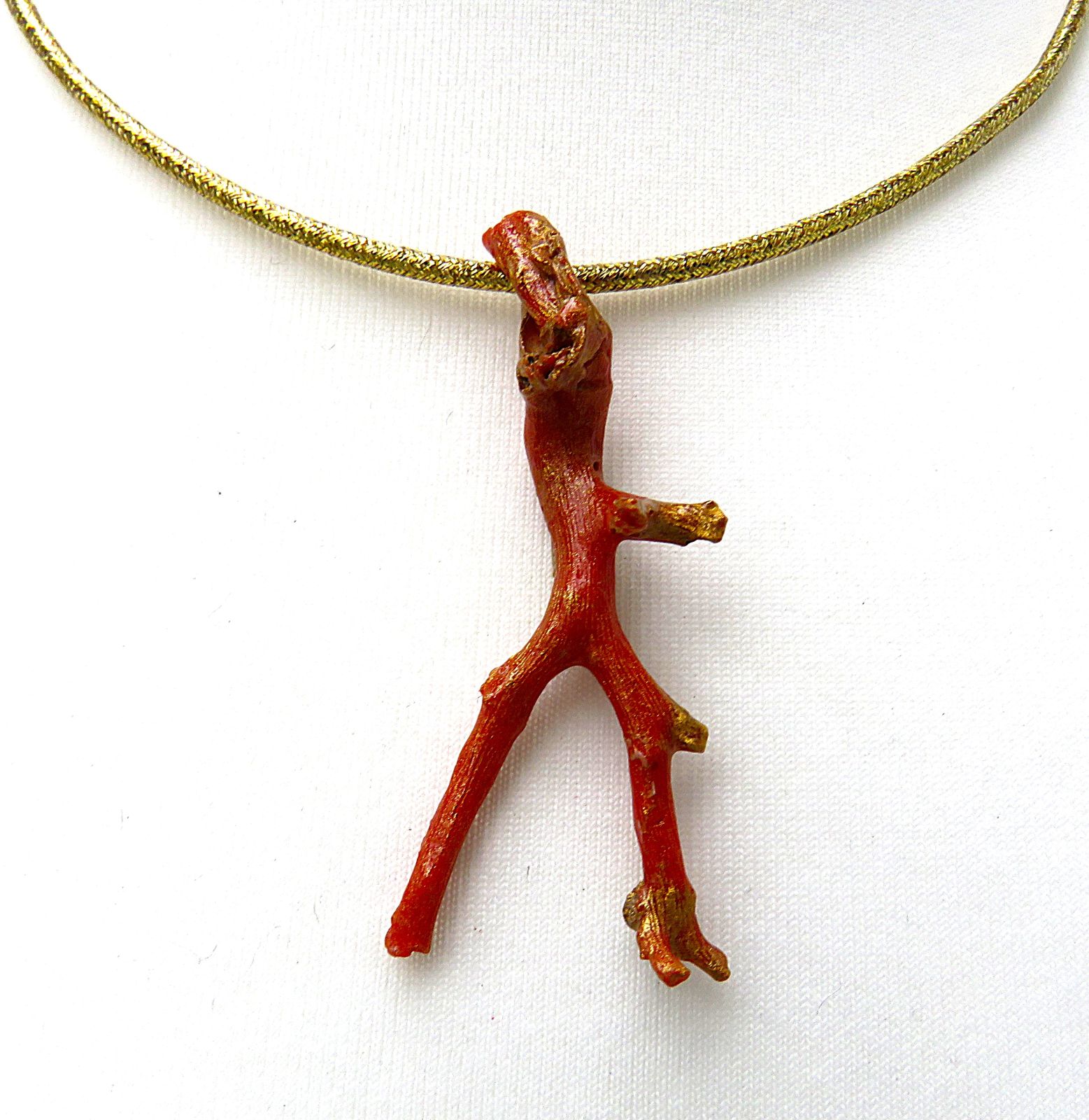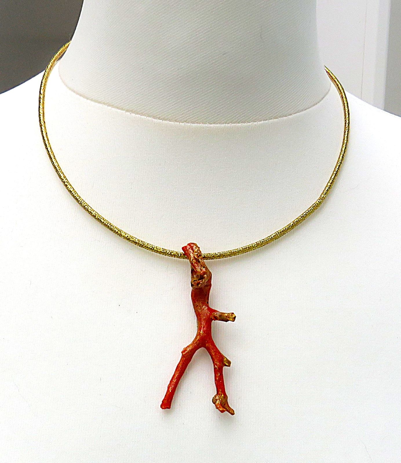 Ein ganz besonderes Unikat Schmuckstück ist dieser Korallen Anhänger mit Muschelgold. Diesen biete ich Ihnen an zwei grundverschiedenen Halsreifen an: Zum Einen an einem mit goldfarbenem Gewebeschlauch verkleideten Magnetreif, zum Anderen an einem vergoldeten Edelstahl Halsreif.