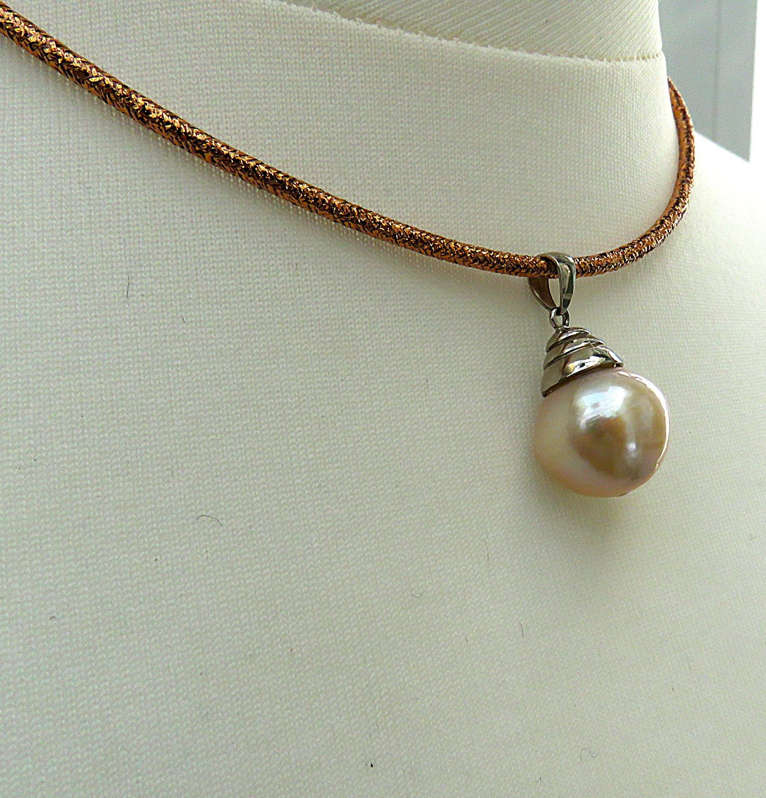 Die Ming Perle mit der Modell Nr. 4938 C ist von natürlicher Körperfarbe in Lachsrosé . Die Überfarbe ist ein zartes Silber mit vagen Gletschertönen, welches in schönem Kontrast zum Halsreif steht. Die Ming hat eine Größe von ca. 14,7 mm x 15 mm. Gesamtlänge des Anhängers beträgt ca. 26,5 mm. Befestigt habe ich die Ming Perle an einer Öse aus rhodiniertem Sterlingsilber mit großer glockenförmiger Kalotte.