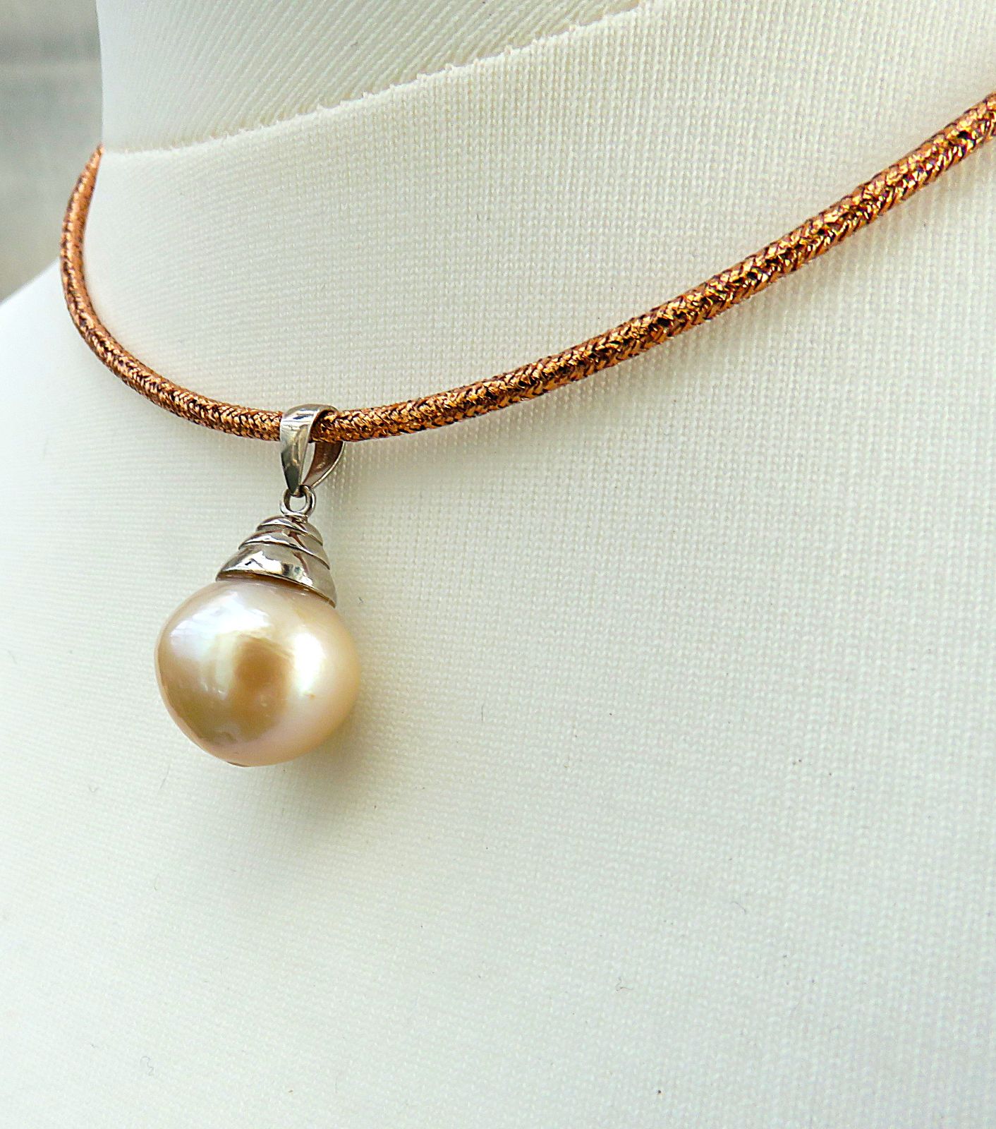 Im Kontrast dazu habe ich eine exzellente zart lachsfarbene Ming Perle ausgesucht. Beide Stücke harmonieren perfekt miteinander.