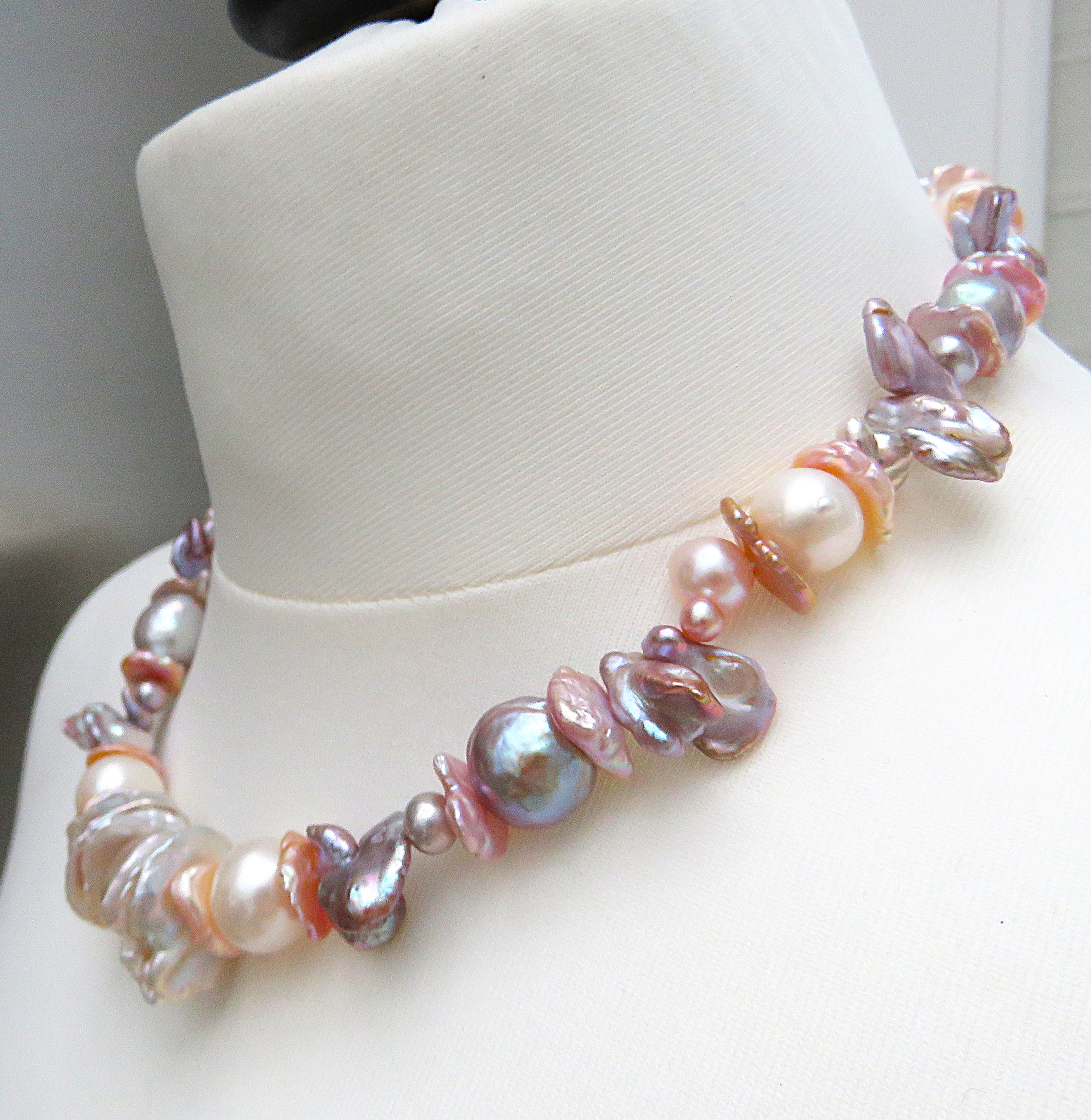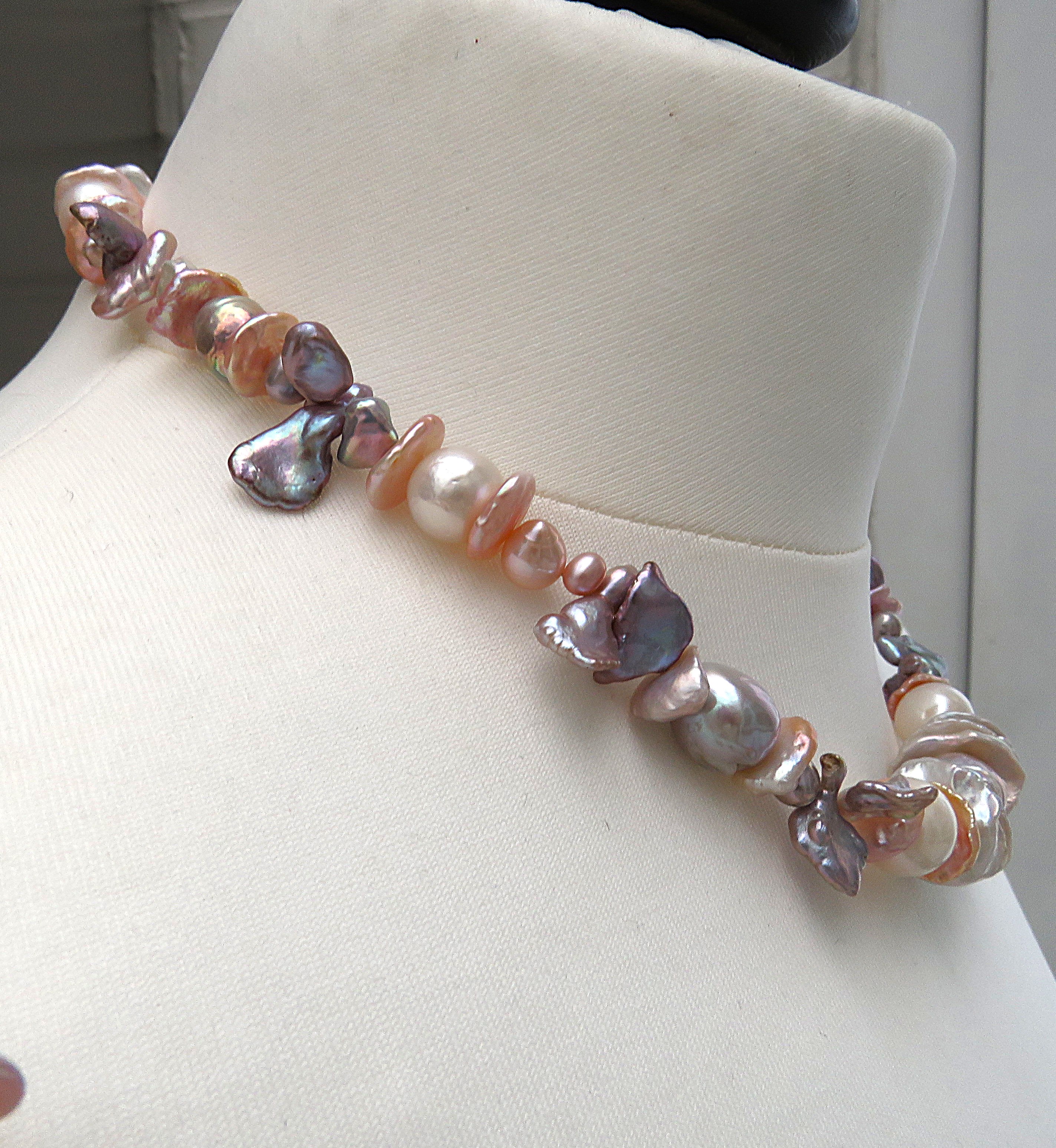 In diesem Süßwasserperlen Collier habe ich in der Hauptsache Ming Perlen und Keshi Perlen verarbeitet. Kleine Akzente setzen zusätzlich unterschiedlich große Süßwasser Tropfenperlen und Potatoes. Alle verarbeiteten Perlen sind naturfarben. Die Perlen mit einem metallischen Blauschimmer wurden zusätzlich gelasert. Zarte lachsfarbene und große weiße Keshi setzen zu dem zarte Akzente und bilden das übrige Perlen Collier.