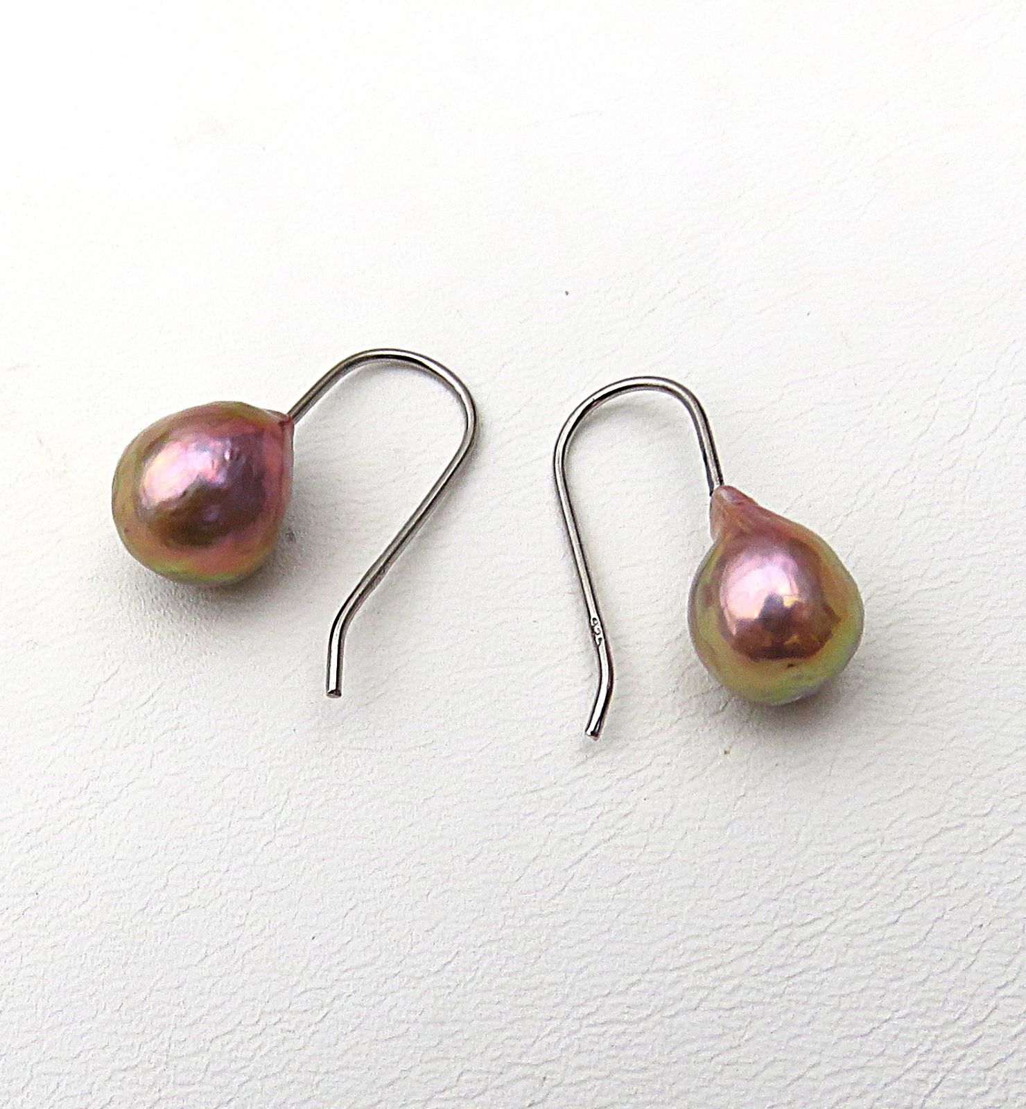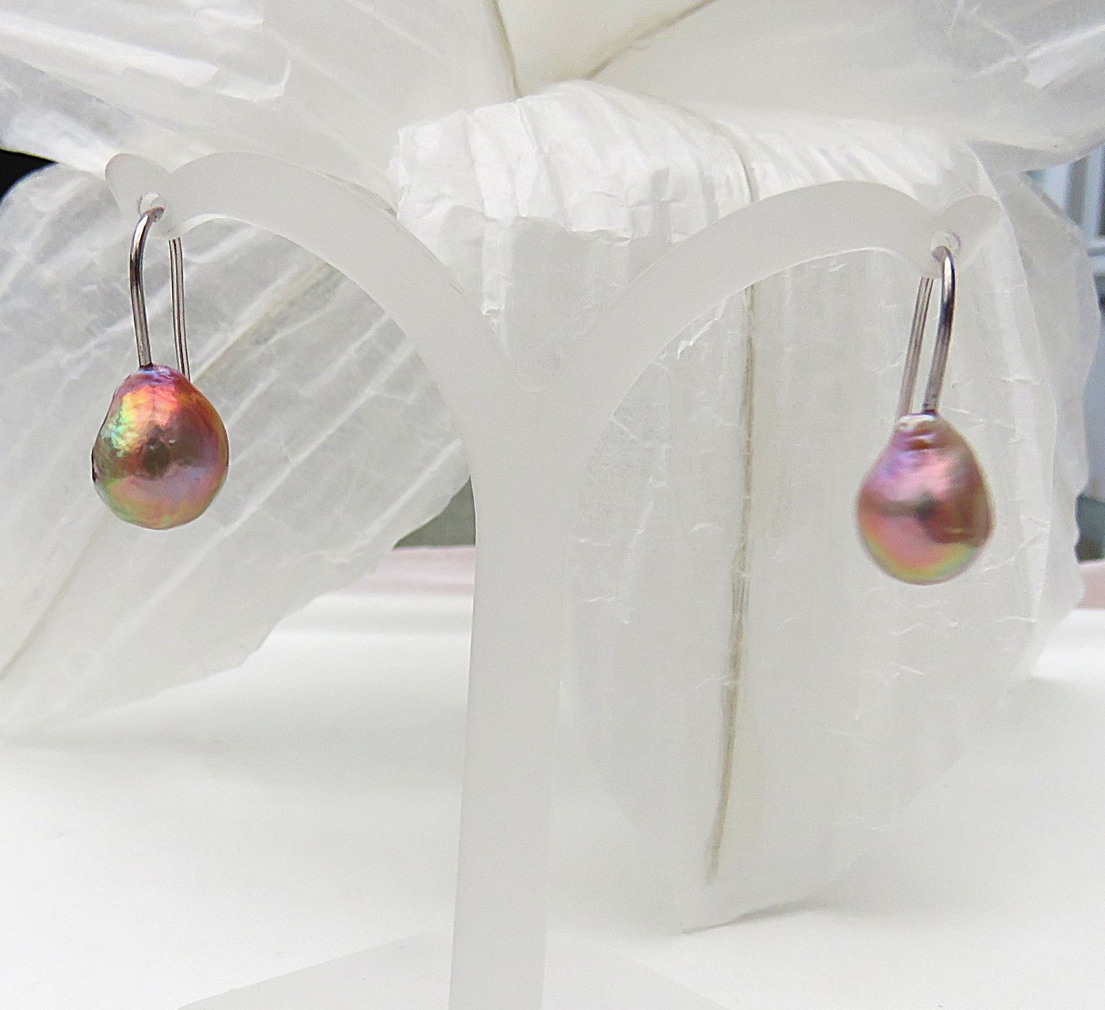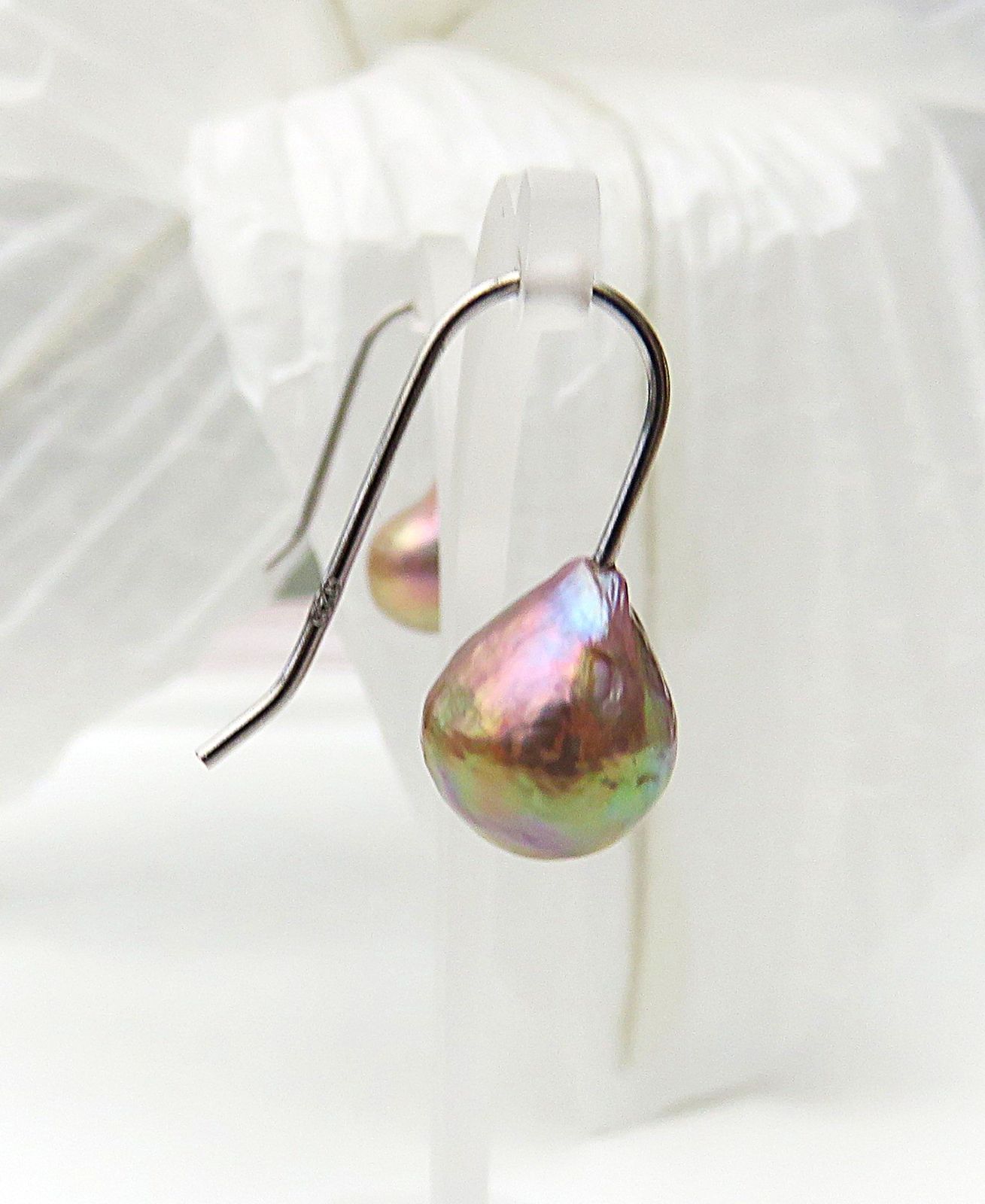 Für diese ausgefallenen Mingperlen Ohrringe möchte ich Sie begeistern. Diesen beiden Perlen verfügen über natürliche Farben, die bei Ming Perlen in dieser Form und Intensität sehr, sehr selten vorkommen. Sie schillern in so unglaublich vielen und starken Farbtönen, dass sogar ein Rosenkäfer neidisch werden könnte. Den Zauber dieser Ausnahme Schmuckstücke möchte ich an ihre künftige Trägerin weitergeben. Die Ohrringe vermitteln den Anschein innerlich zu leuchten. Einfach märchenhaft. Sie ändern je nach Lichtverhältnissen ihre Farben so total, dass man meinen könnte, es handele sich um völlig andere Ohrringe. Schauen Sie sich bitte hierzu die Fotos an. Es ist immer das gleiche Paar aber aus unterschiedlichen Blickwinkeln auf den Bildern zu sehen. Ich habe die barocken tropfenförmigen Ming Perlen an schlichten Haken aus rhodiniertem Sterlingsilber befestigt, damit sie mit ihrer schillernden Schönheit so richtig zur Geltung kommen können. Sie sind auf der Suche nach einer Trägerin, die das Außergewöhnliche, Geheimnisvolle liebt.