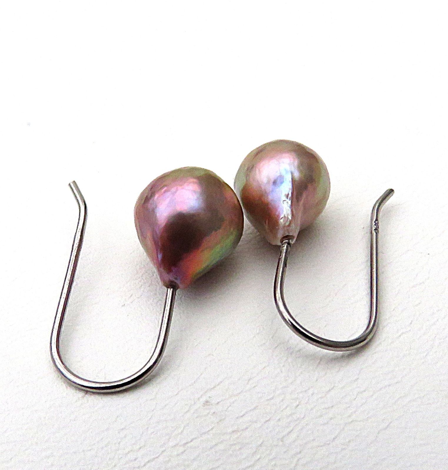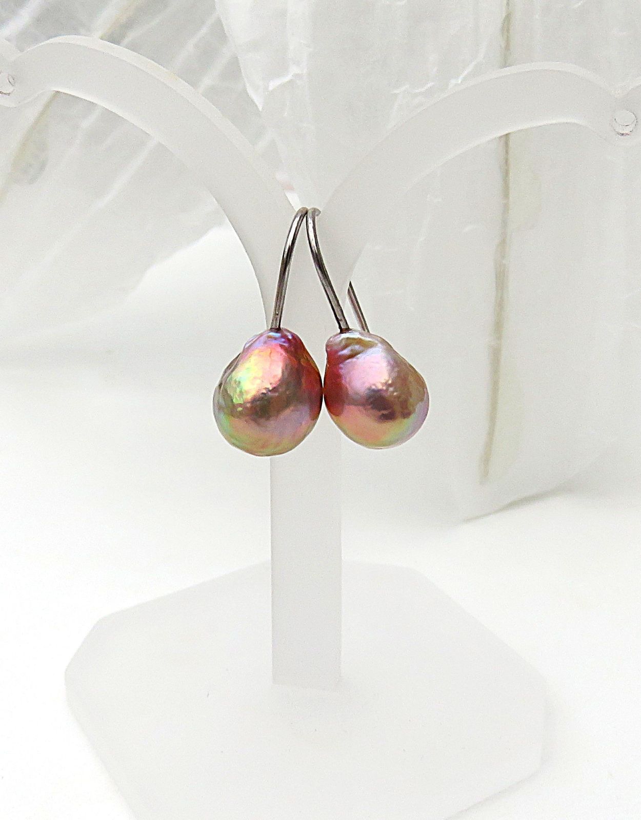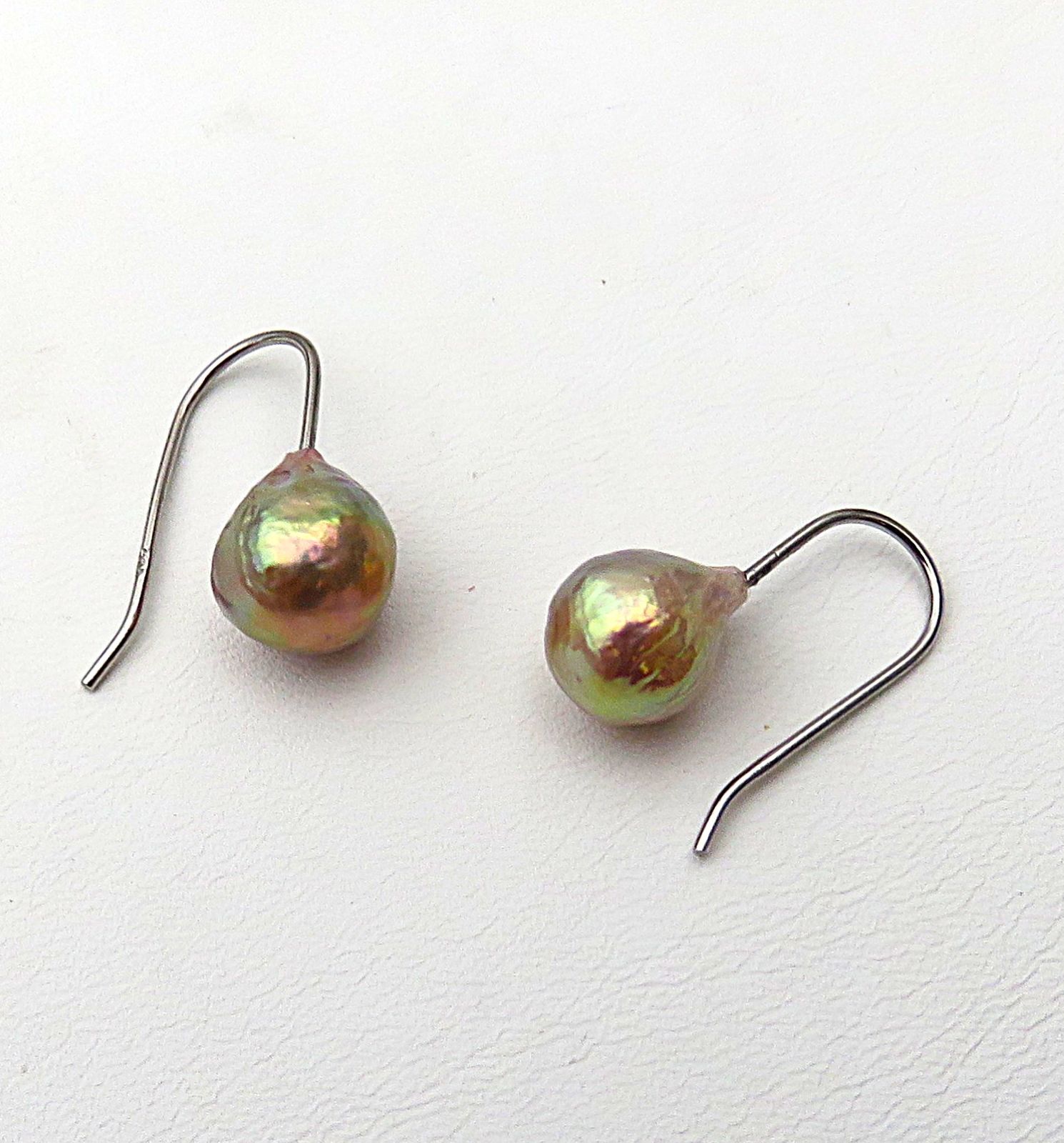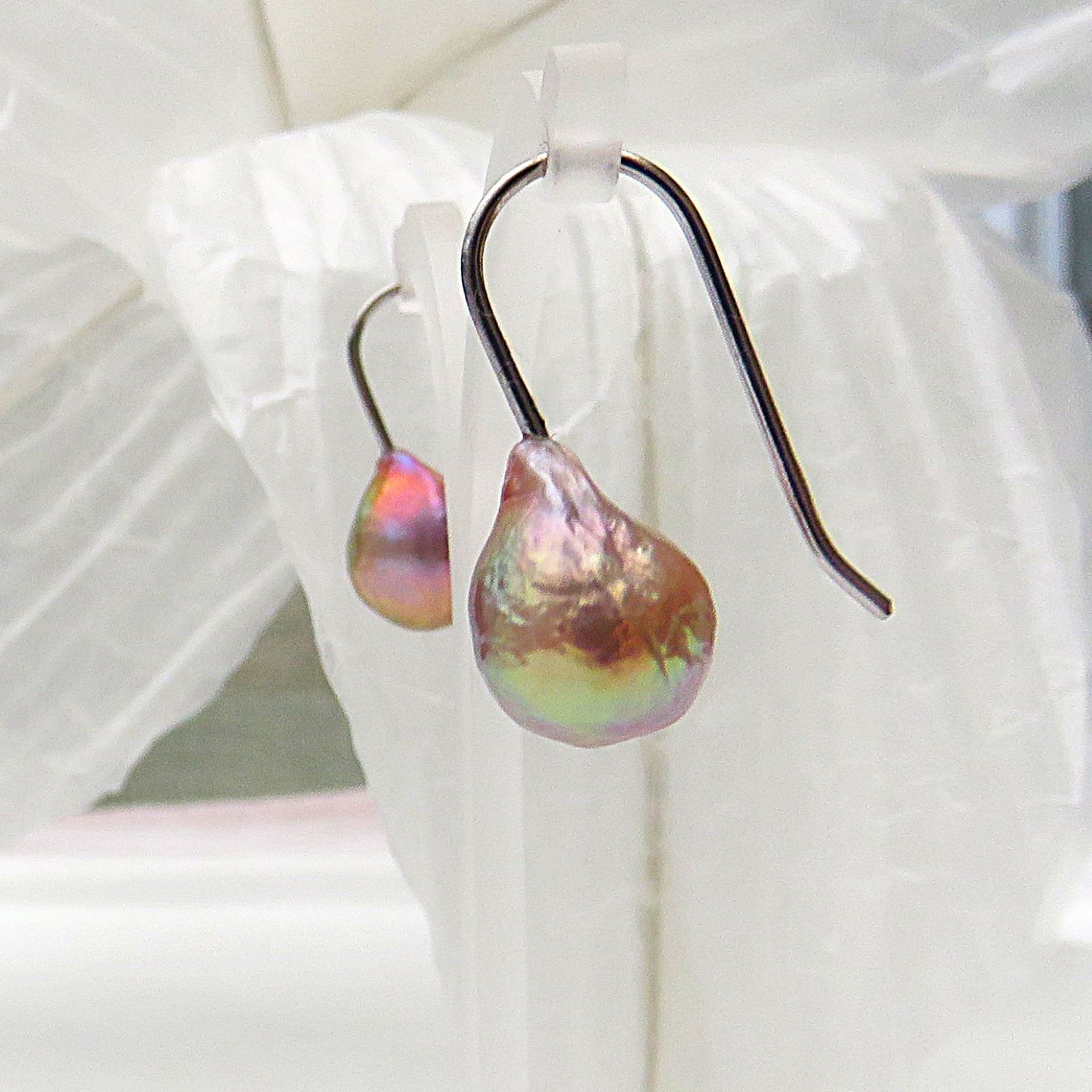 Für diese ausgefallenen Mingperlen Ohrringe möchte ich Sie begeistern. Diesen beiden Perlen verfügen über natürliche Farben, die bei Ming Perlen in dieser Form und Intensität sehr, sehr selten vorkommen. Sie schillern in so unglaublich vielen und starken Farbtönen, dass sogar ein Rosenkäfer neidisch werden könnte. Den Zauber dieser Ausnahme Schmuckstücke möchte ich an ihre künftige Trägerin weitergeben. Die Ohrringe vermitteln den Anschein innerlich zu leuchten. Einfach märchenhaft. Sie ändern je nach Lichtverhältnissen ihre Farben so total, dass man meinen könnte, es handele sich um völlig andere Ohrringe. Schauen Sie sich bitte hierzu die Fotos an. Es ist immer das gleiche Paar aber aus unterschiedlichen Blickwinkeln auf den Bildern zu sehen. Ich habe die barocken tropfenförmigen Ming Perlen an schlichten Haken aus rhodiniertem Sterlingsilber befestigt, damit sie mit ihrer schillernden Schönheit so richtig zur Geltung kommen können. Sie sind auf der Suche nach einer Trägerin, die das Außergewöhnliche, Geheimnisvolle liebt.