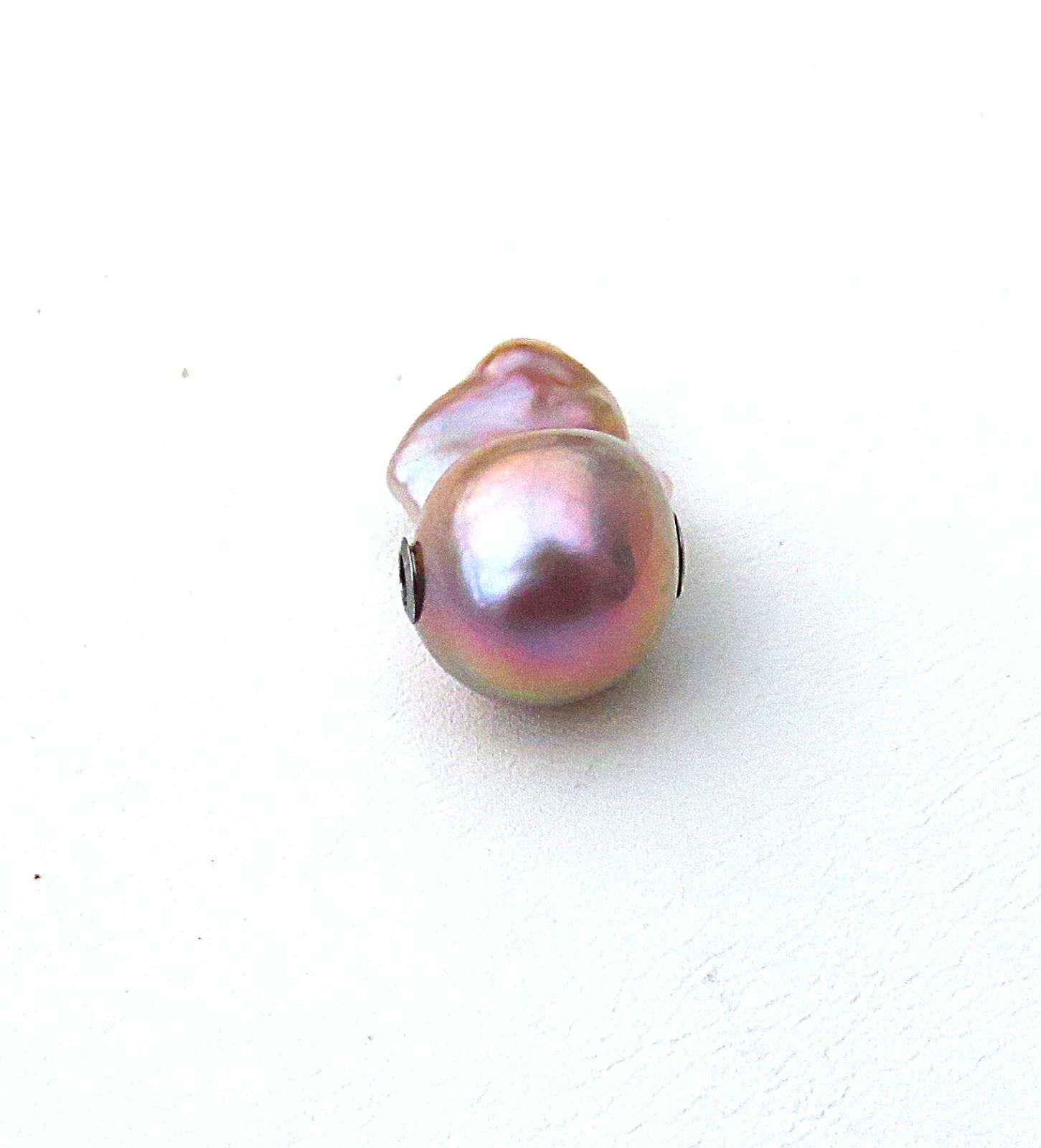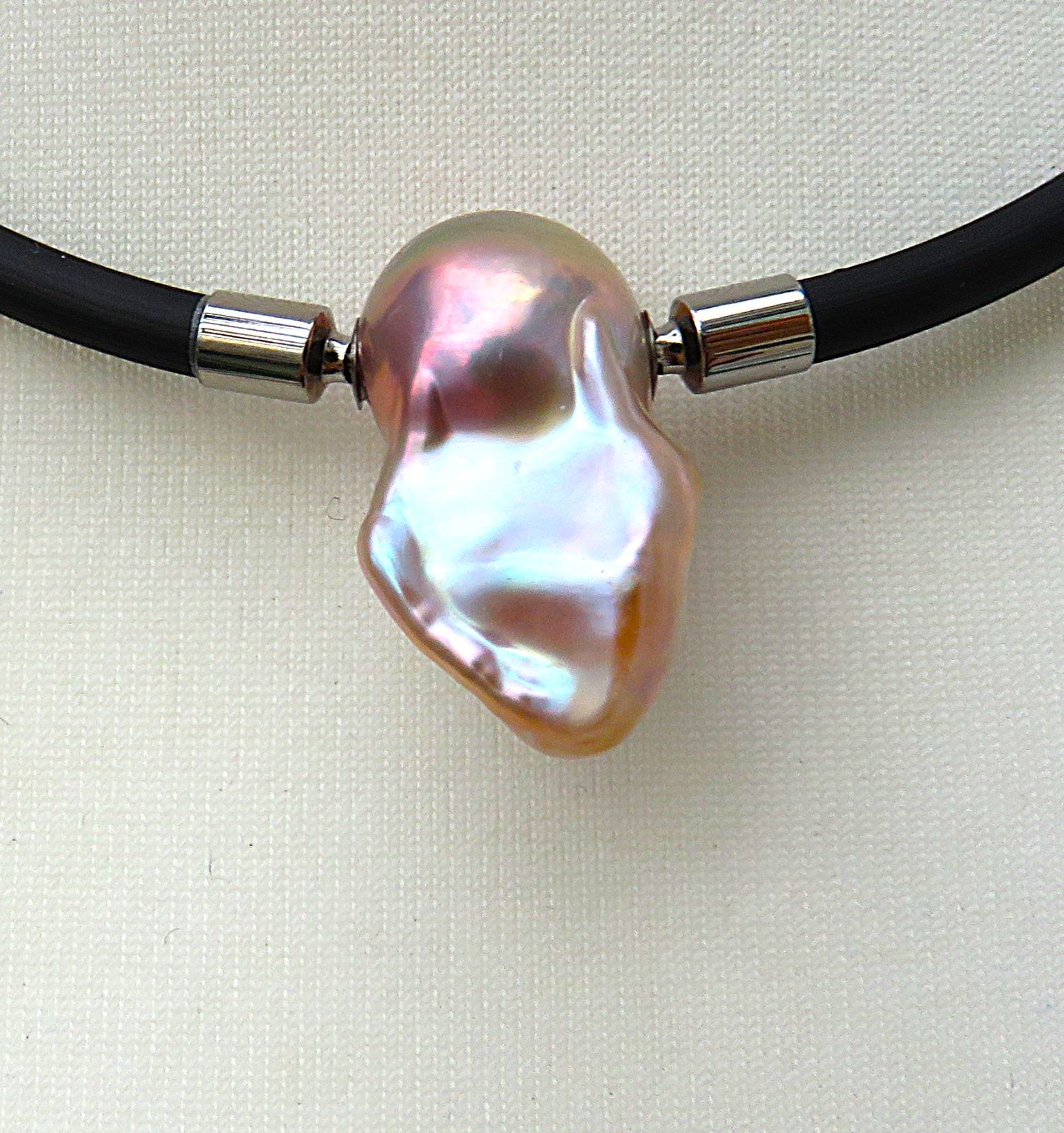Diese traumhaft schöne, vielfarbige Ming Perle habe ich mittels Edelstahl Schließmechaniken zur Wechselschließe gearbeitet. Sie ist von exorbitant guter Qualität. Die Nacre ist extrem dick. Wie ich beim Bohren feststellen konnte, misst sie an die 2 mm. Das ist enorm und sorgt dann auch für einen umwerfend brillanten Lüster.