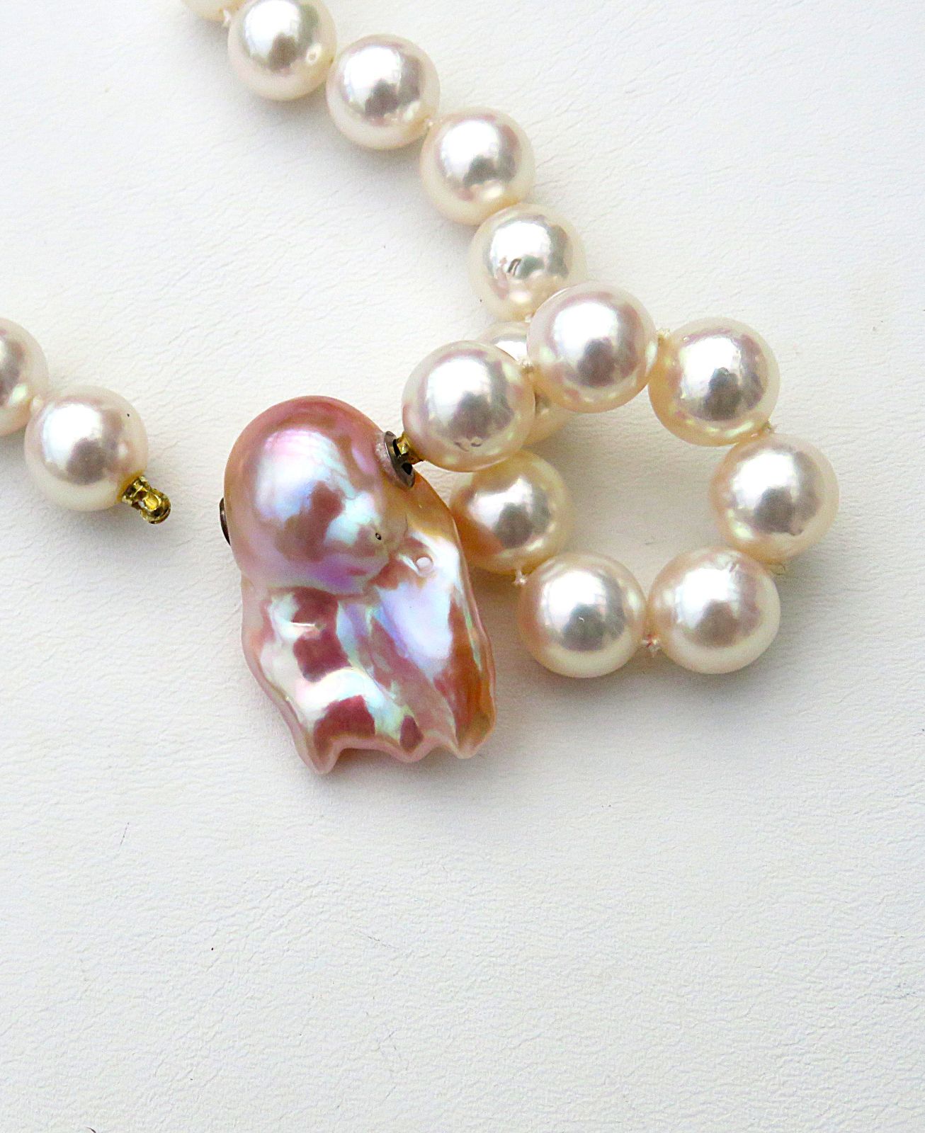 Diese traumhaft schöne, vielfarbige Ming Perle habe ich mittels Edelstahl Schließmechaniken zur Wechselschließe gearbeitet. Sie ist von exorbitant guter Qualität. Die Nacre ist extrem dick. Wie ich beim Bohren feststellen konnte, misst sie an die 2 mm. Das ist enorm und sorgt dann auch für einen umwerfend brillanten Lüster.