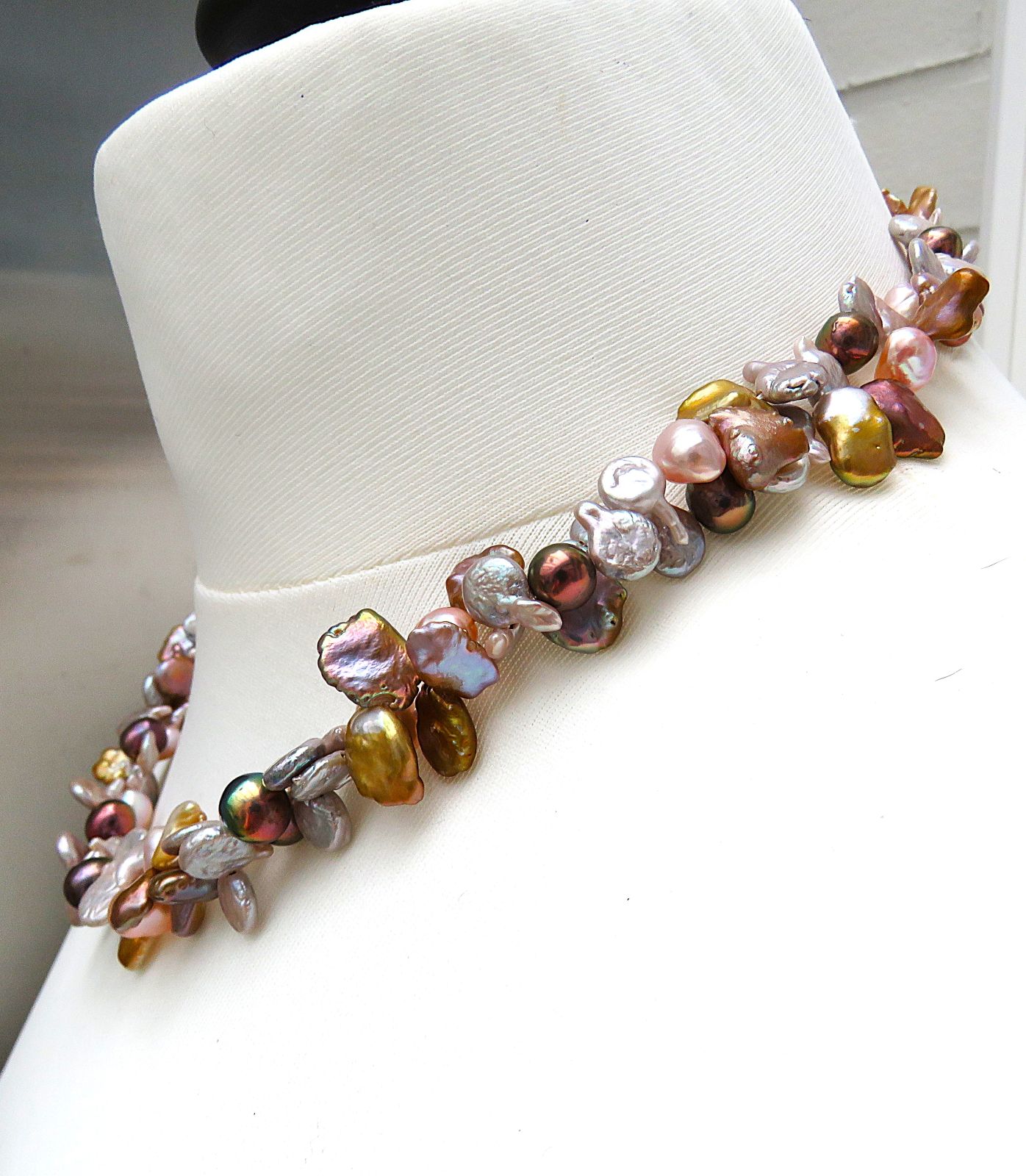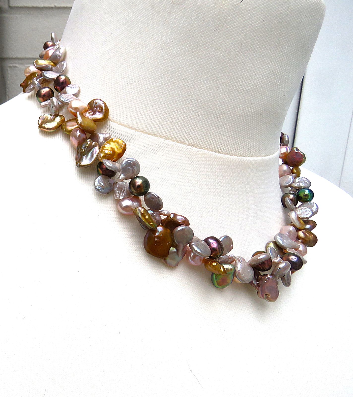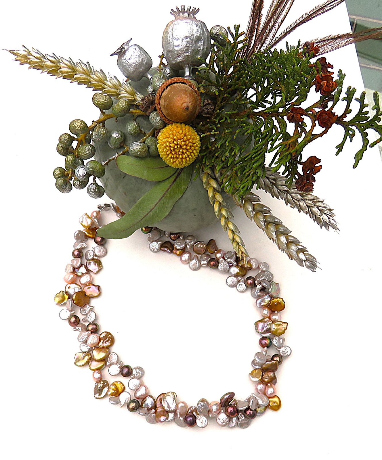 Keshi Perlen, kernlose Perlen und Coin Perlen in Naturtönen habe ich mit potatoeförmigen Perlen in sattem gefärbtem Braun kombiniert.