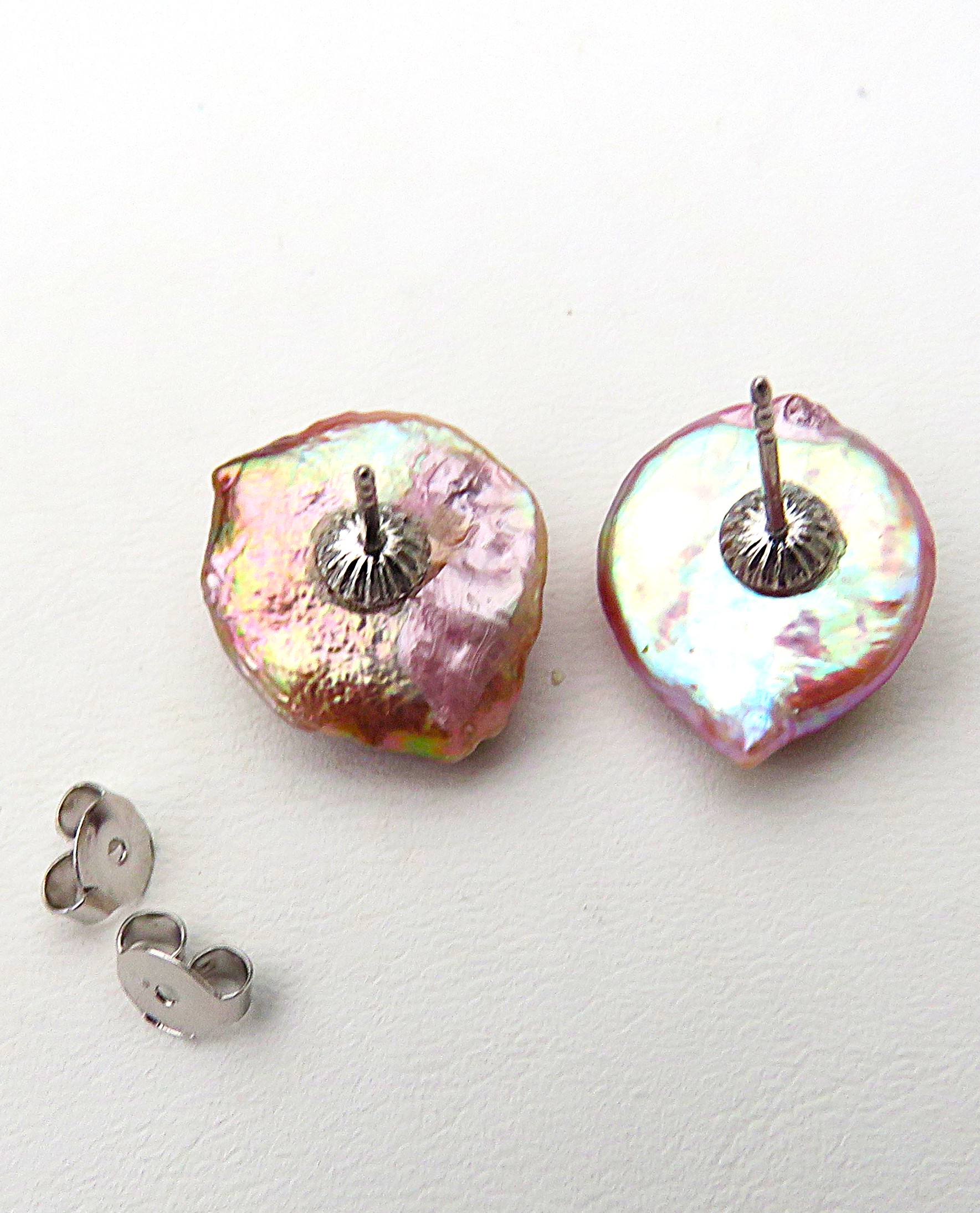 Wundervolle Süßwasser Coin Perlen von beeindruckender Größe habe ich zu diesem attraktiven Paar Ohrstecker verarbeitet. Die Perlen sind von sehr guter barocker Qualität. Die Nacre ist sehr dick, bei gleißendem Lüster. Die Körperfarbe ist ein unterschiedlich intensives Pink. Die Überfarben sind unglaublich vielfältig und intensiv. Die borkig wirkende Oberfläche der Perlen sorgt zudem für tausendfache Lichtbrechung und bietet so den Überfarben die ideale Plattform sich in ihrer ganzen Vielfältigkeit zu präsentieren.