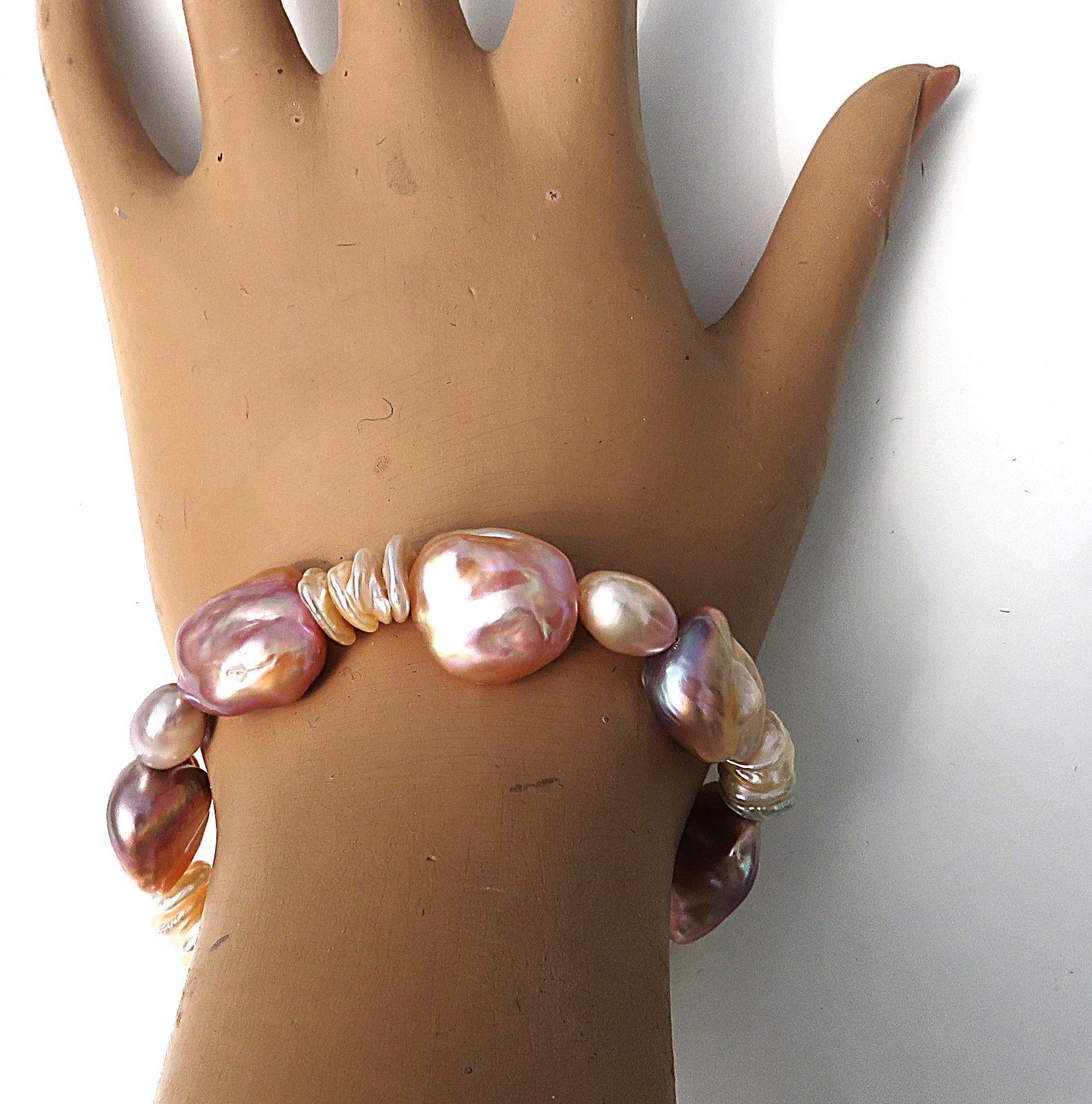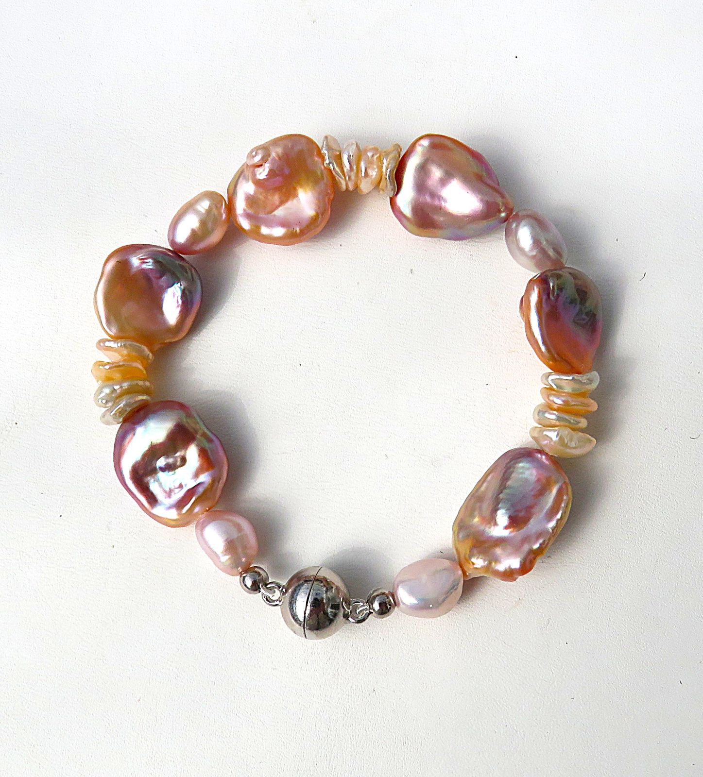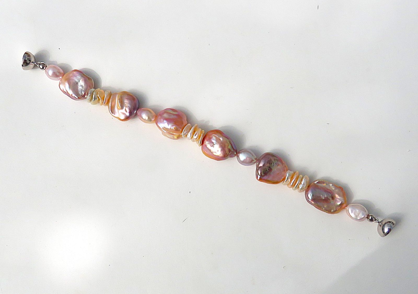Aus naturfarbenen großen und kleinen Keshi Perlen in Verbindung mit kernlosen Perlen habe ich dieses Armband gefertigt. Es ist groß und ausdrucksvoll, bei gleichzeitigem Tragekomfort, da ich die flachesten Keshi für das Armband ausgewählt habe. So liegen sie flach angeschmiegt am Handgelenk. Diesen 20 cm langen Armschmuck habe ich auf kunststoffummantelten Juwelierdraht gearbeitet. Geschlossen wird das Perlen Armband mit einer 10 mm Magnetschließe aus rhodiniertem Sterlingsilber.