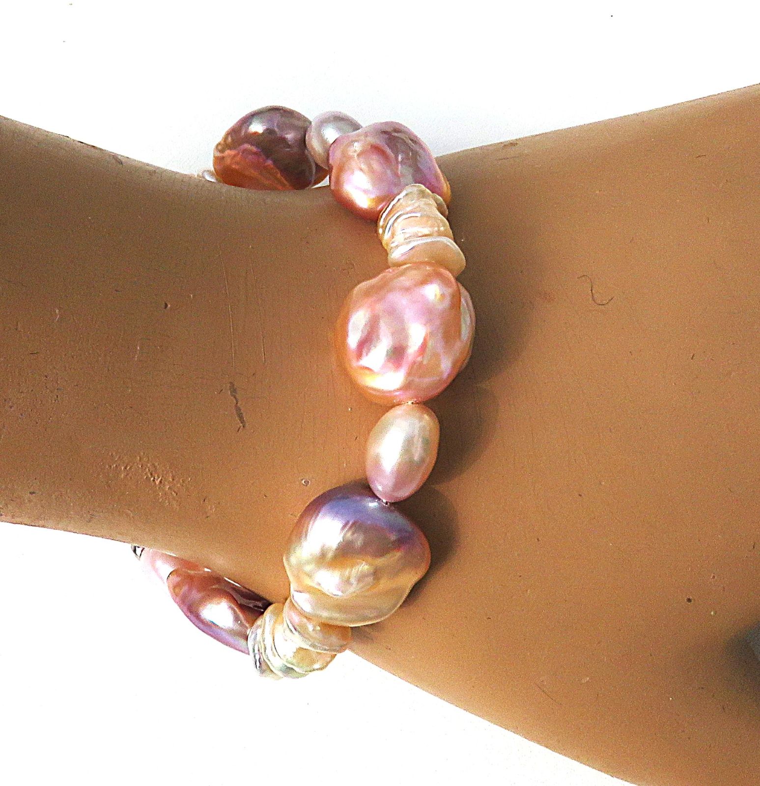 Alle in diesem Armband verarbeiteten Perlen sind von ausgezeichneter Qualität. Das Lüster ist hervorragend. Die Oberfläche der Perlen ist stark strukturiert. Die Haptik ist dennoch glatt und zart. Sie fassen sich geradezu seidig an. Ihre Körperfarbe ist von goldigem Rosé. Die Überfarben liefern sich ein wahres Feuerwerk von Gold, Silber über Gletschertöne, bis hin zu sattem Lila und dezenten Feuernuancen.