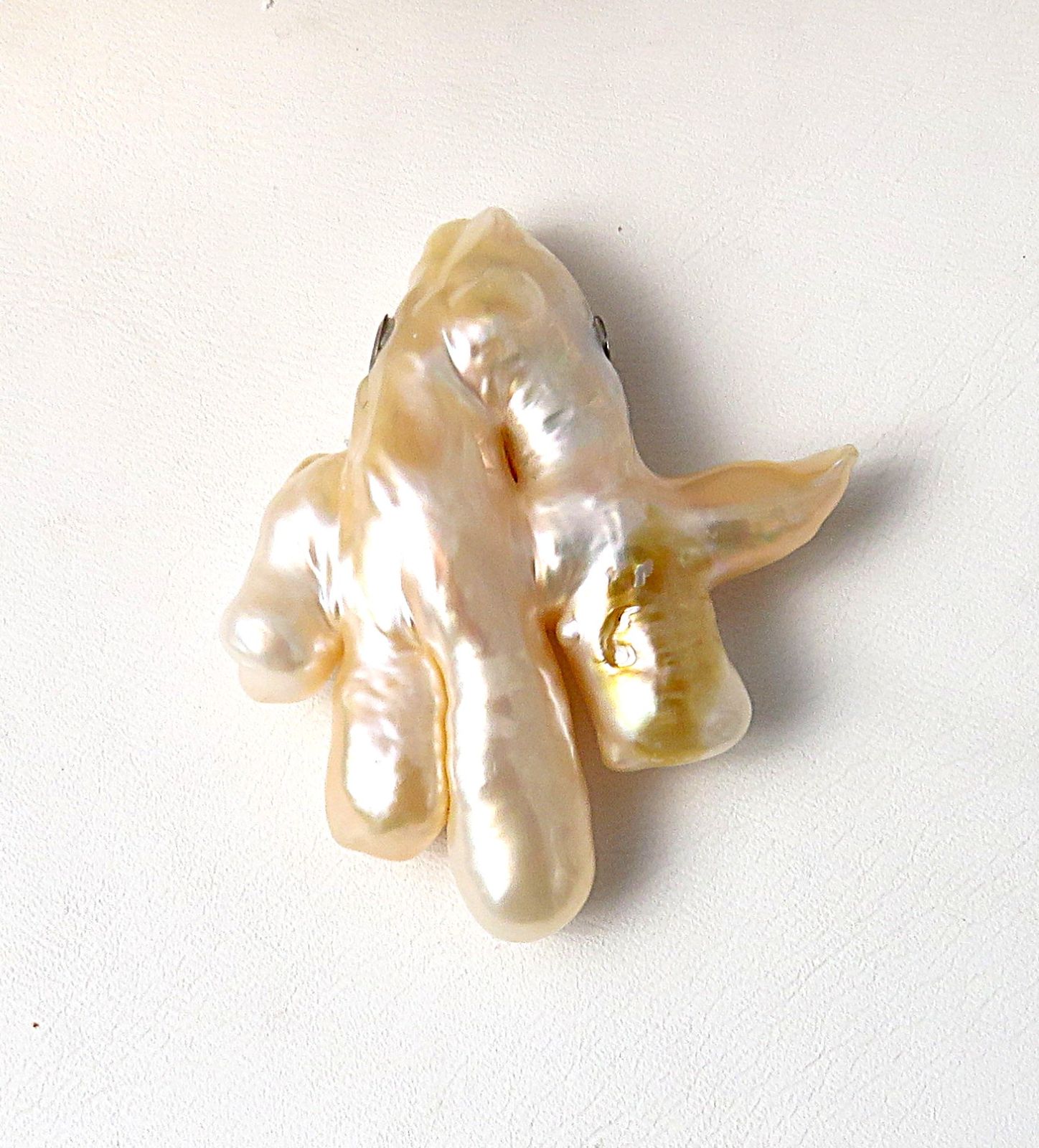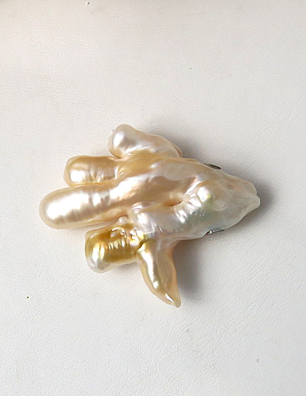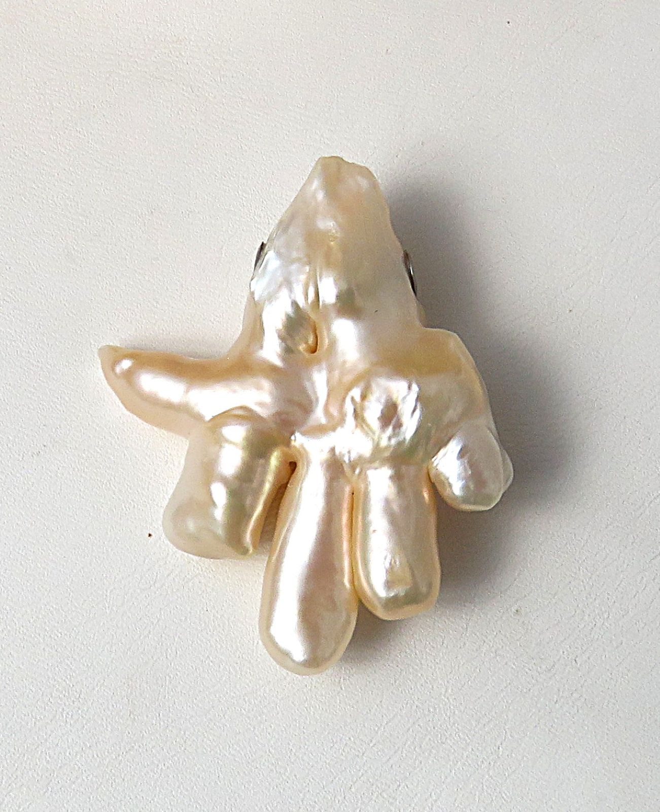 Die Fancy Perle misst ca. 45x38,8x12,2 mm bei einem Gewicht von 74,95 Karat. Es ist eine Perle von sehr abstrakter Form. Die Körperfarbe ist von crèmefarben, die Überfarben sind von hauchzartem silbrigem Apricot bis hin zu Gold. Die Perle ist von sehr sehr guter Qualität bei ausgezeichnetem Lüster. Diese Perle ist von so guter Qualtität, dass sie beidseitig getragen werden kann, indem man sie um 180 ° um die Längsachse dreht. So wird auch die eigentliche Rückseite der Perle zur Schauseite. Schauen Sie sich hierzu bitte die Detailfotos an.