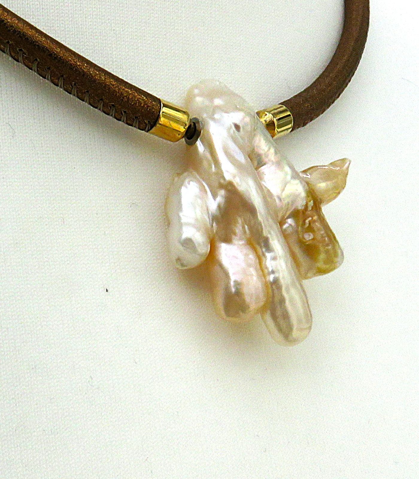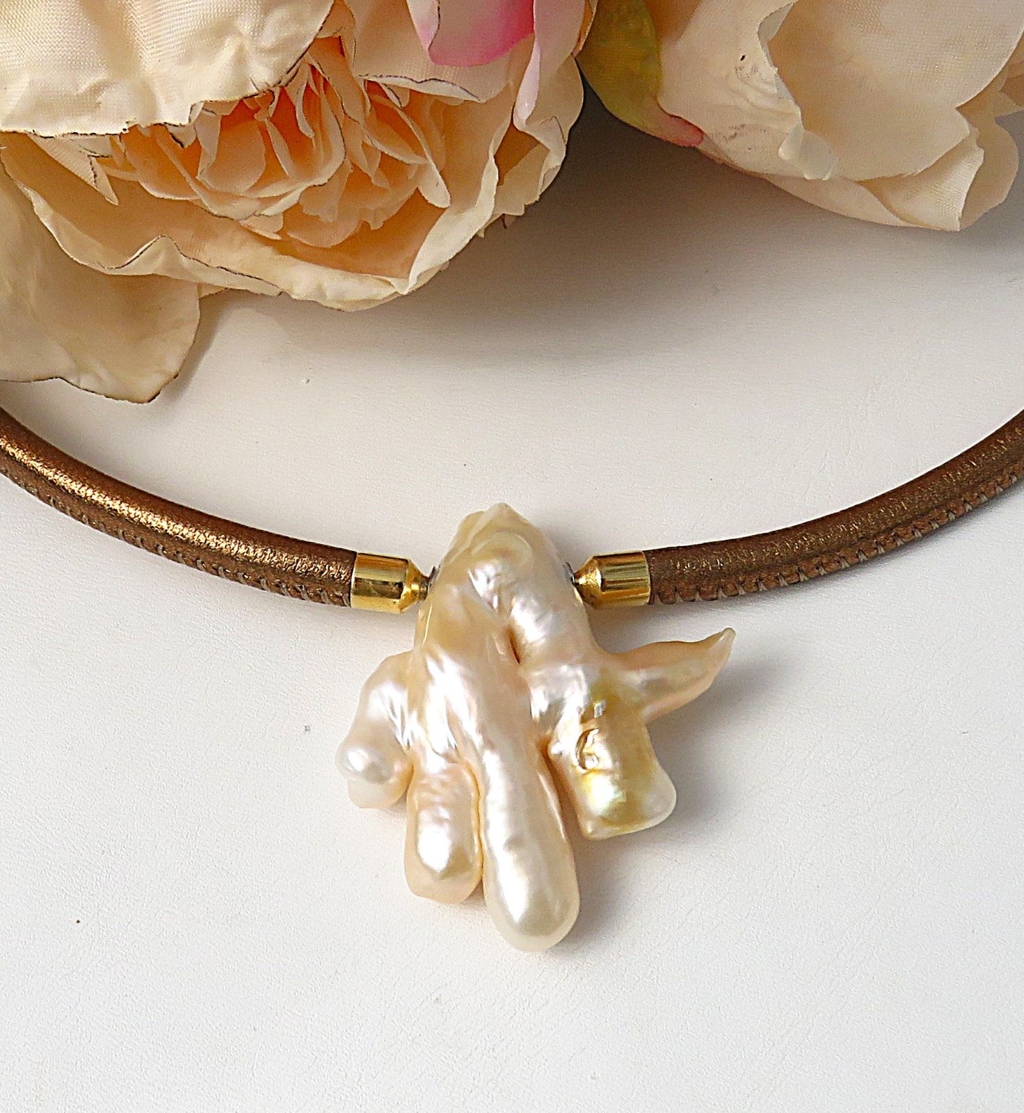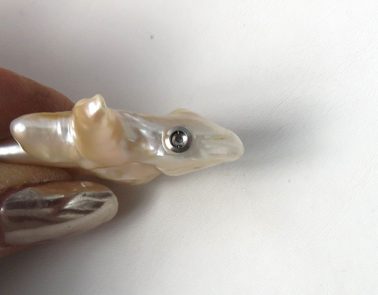 Die Fancy Perle misst ca. 45x38,8x12,2 mm bei einem Gewicht von 74,95 Karat. Es ist eine Perle von sehr abstrakter Form. Die Körperfarbe ist von crèmefarben, die Überfarben sind von hauchzartem silbrigem Apricot bis hin zu Gold. Die Perle ist von sehr sehr guter Qualität bei ausgezeichnetem Lüster. Diese Perle ist von so guter Qualtität, dass sie beidseitig getragen werden kann, indem man sie um 180 ° um die Längsachse dreht. So wird auch die eigentliche Rückseite der Perle zur Schauseite. Schauen Sie sich hierzu bitte die Detailfotos an.