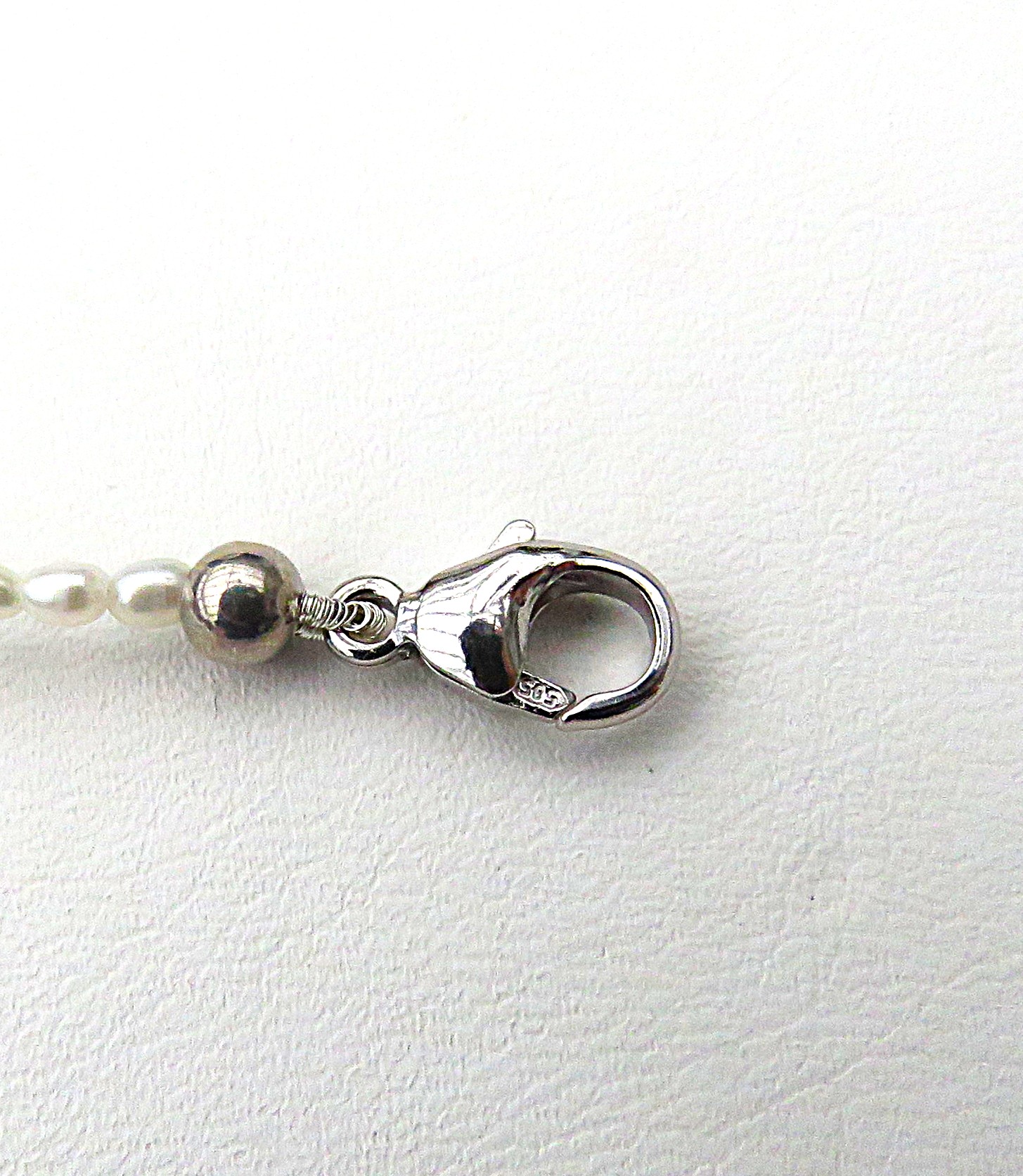 Der 11 mm große Karabiner mit Doppelöse ist aus 14 karätigem Weißgold, die Kaschierkugeln an den jeweiligen Kettenden sind aus rhodiniertem Sterlingsilber 925. Habe diese so gewählt, da man die Kaschierkugeln nach einer evtl. Reparatur nicht wiederverwenden kann. Hier Weißgold zu verwenden wäre in diesem Falle aus derzeitigen Kostengründen nicht gerechtfertigt.