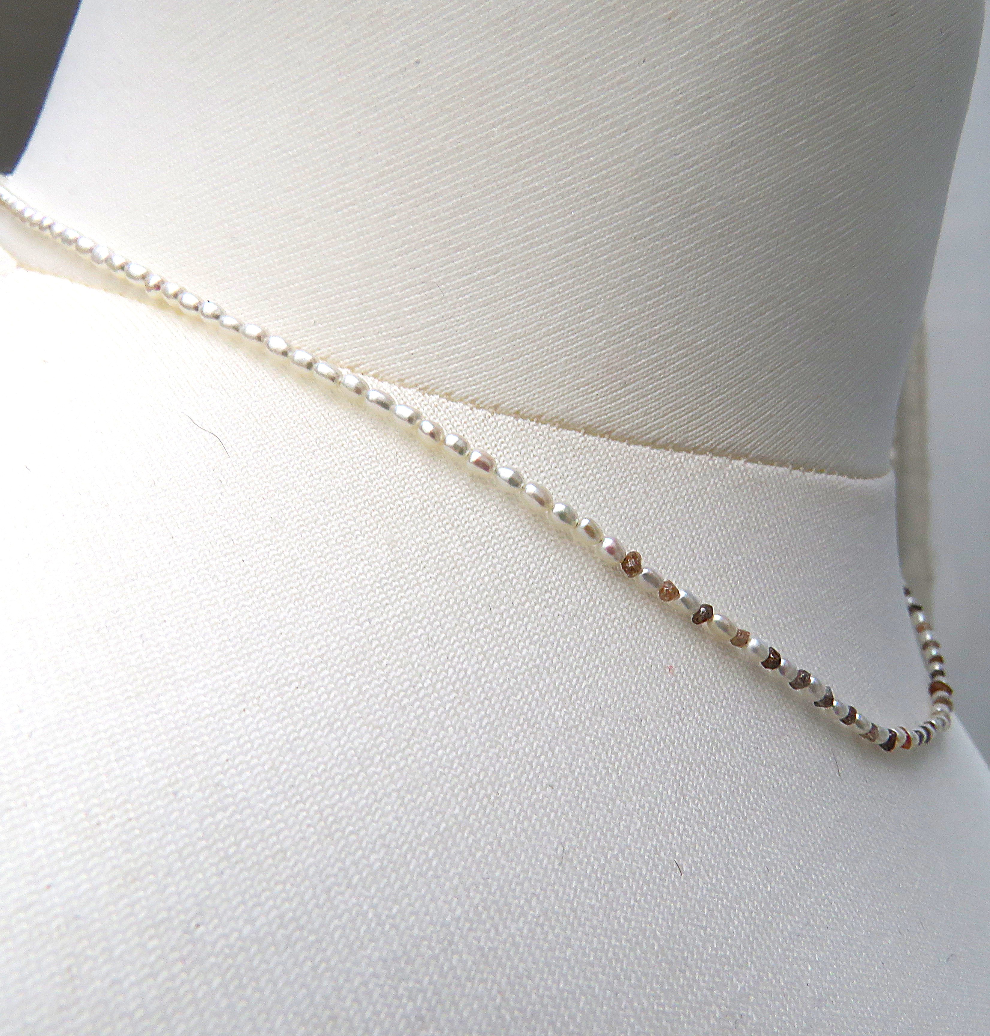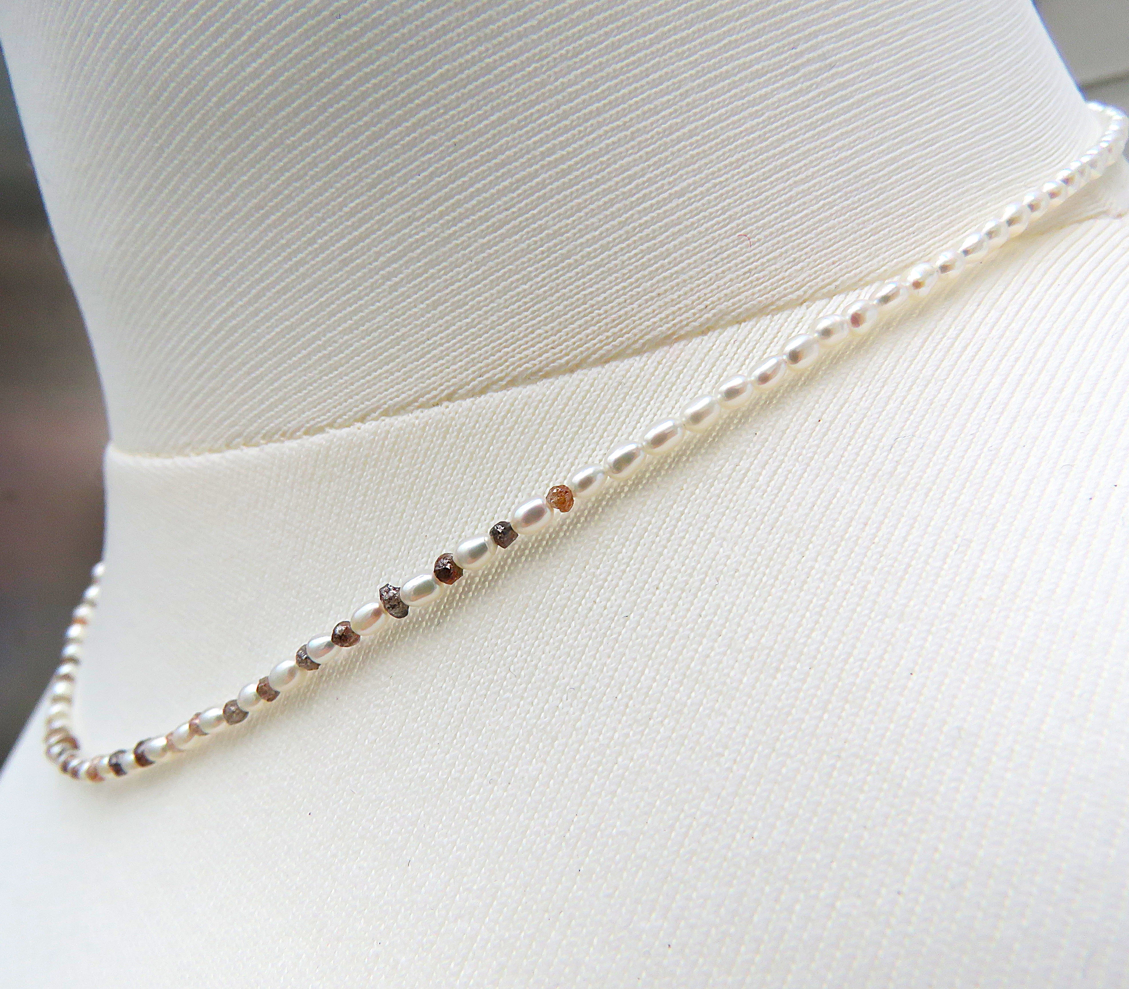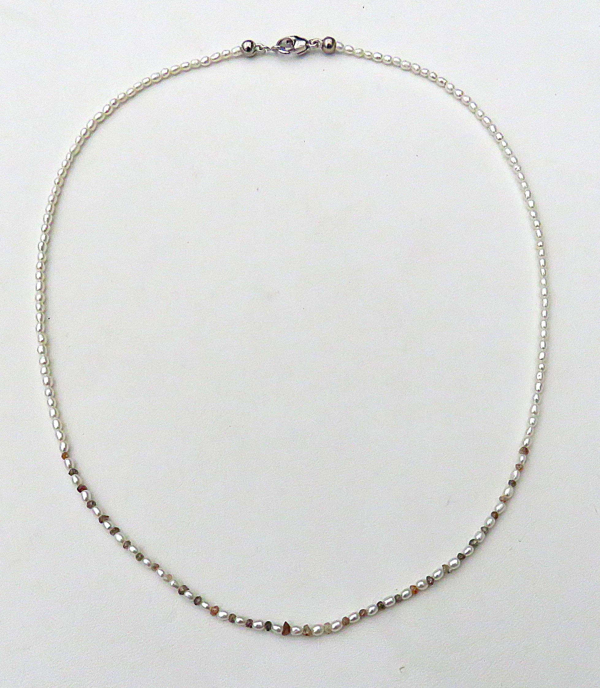 Diese hauchzarte Kette ist Understatement pur. Zur Gestaltung dieses Kleinods habe ich mini mini Reiskornperlen bester Qualität verwendet in Kombination mit 34 naturfarbenen Rohdiamanten. Diese Rohdiamanten wiegen insgesamt 2 Karat. Sie sorgen im vorderen Bereich der Perlen Kette für ein sehr dezentes aber atemberaubendes Bling Bling.
