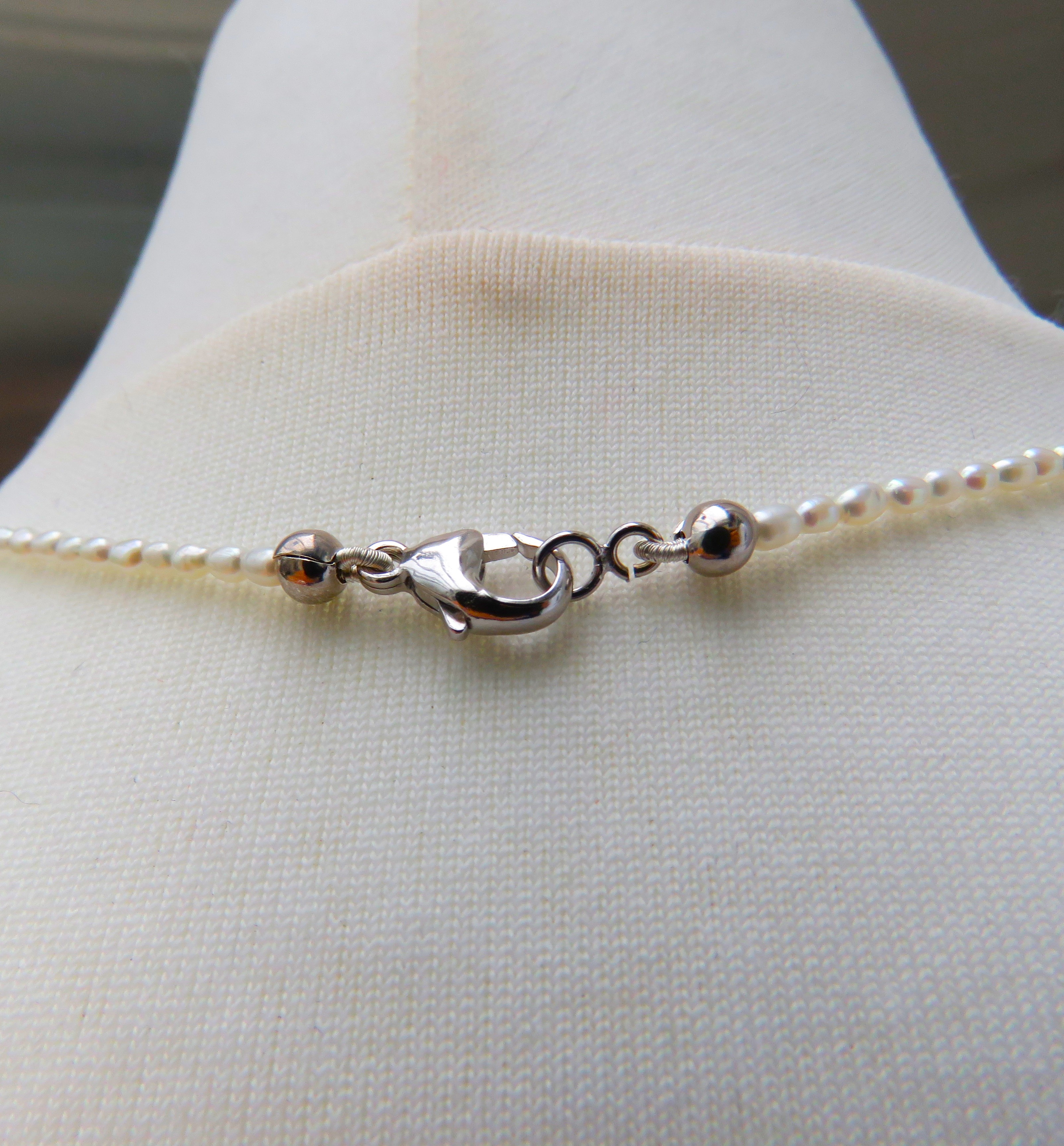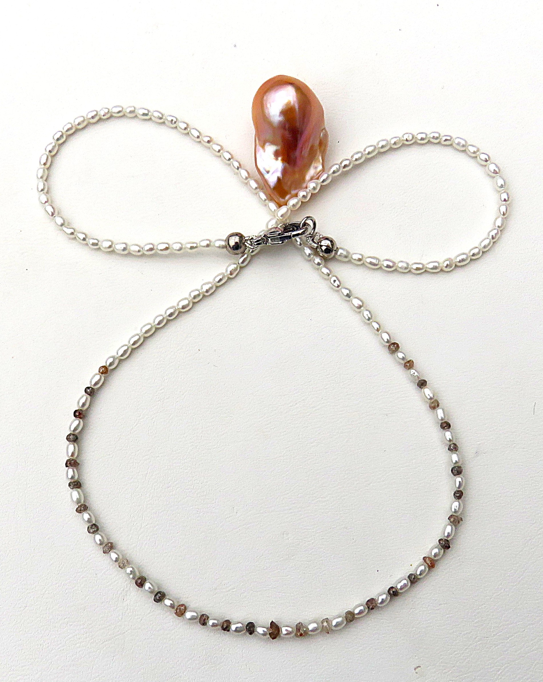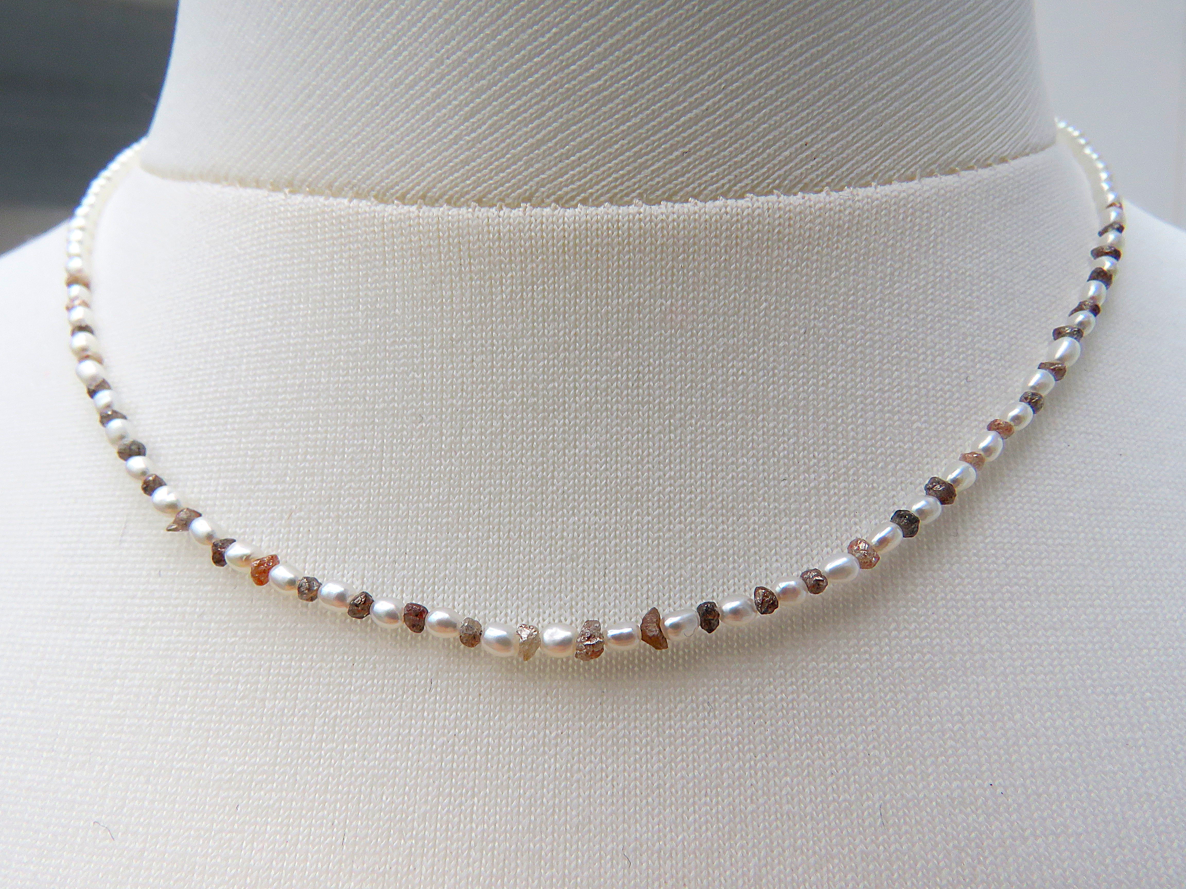 Diese hauchzarte Kette ist Understatement pur. Zur Gestaltung dieses Kleinods habe ich mini mini Reiskornperlen bester Qualität verwendet in Kombination mit 34 naturfarbenen Rohdiamanten. Diese Rohdiamanten wiegen insgesamt 2 Karat. Sie sorgen im vorderen Bereich der Perlen Kette für ein sehr dezentes aber atemberaubendes Bling Bling.