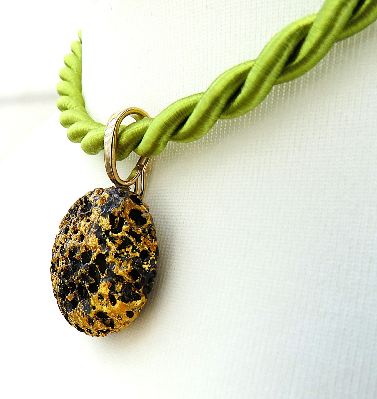 Den sehr großporigen Lava Anhänger habe ich von Hand teilweise mit reinem Blattgold (999,9) belegt. Willkürlich der Struktur des Steines folgend habe ich damit Lunker und Hinterschneidungen des Lavasteins belegt und ausgekleidet, was ihn zu einem außergewöhnlich attraktiven Unikat hat werden lassen. Versehen habe ich den Anhänger mit einem sehr stabilen Vario Clip aus vergoldetem Sterlingsilber.