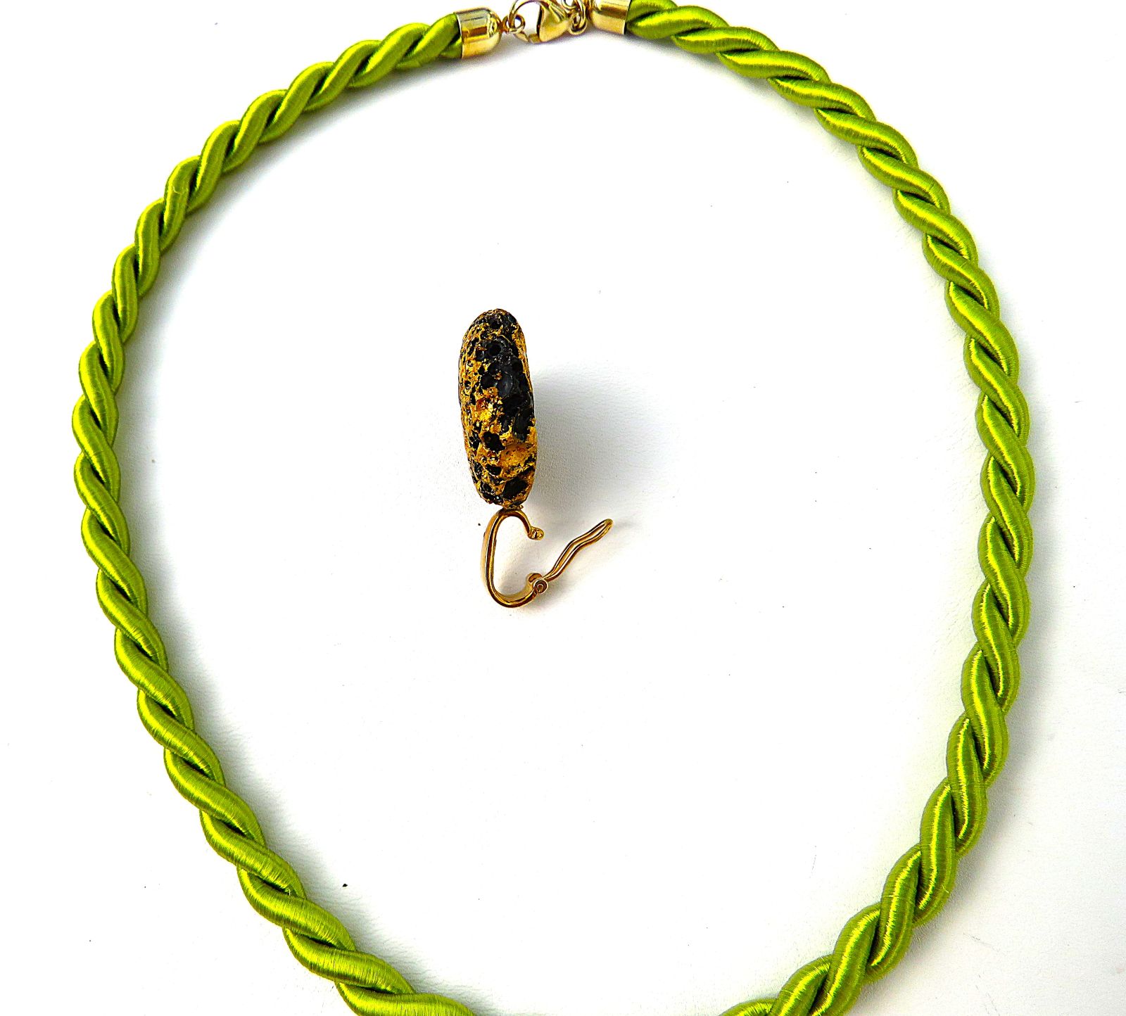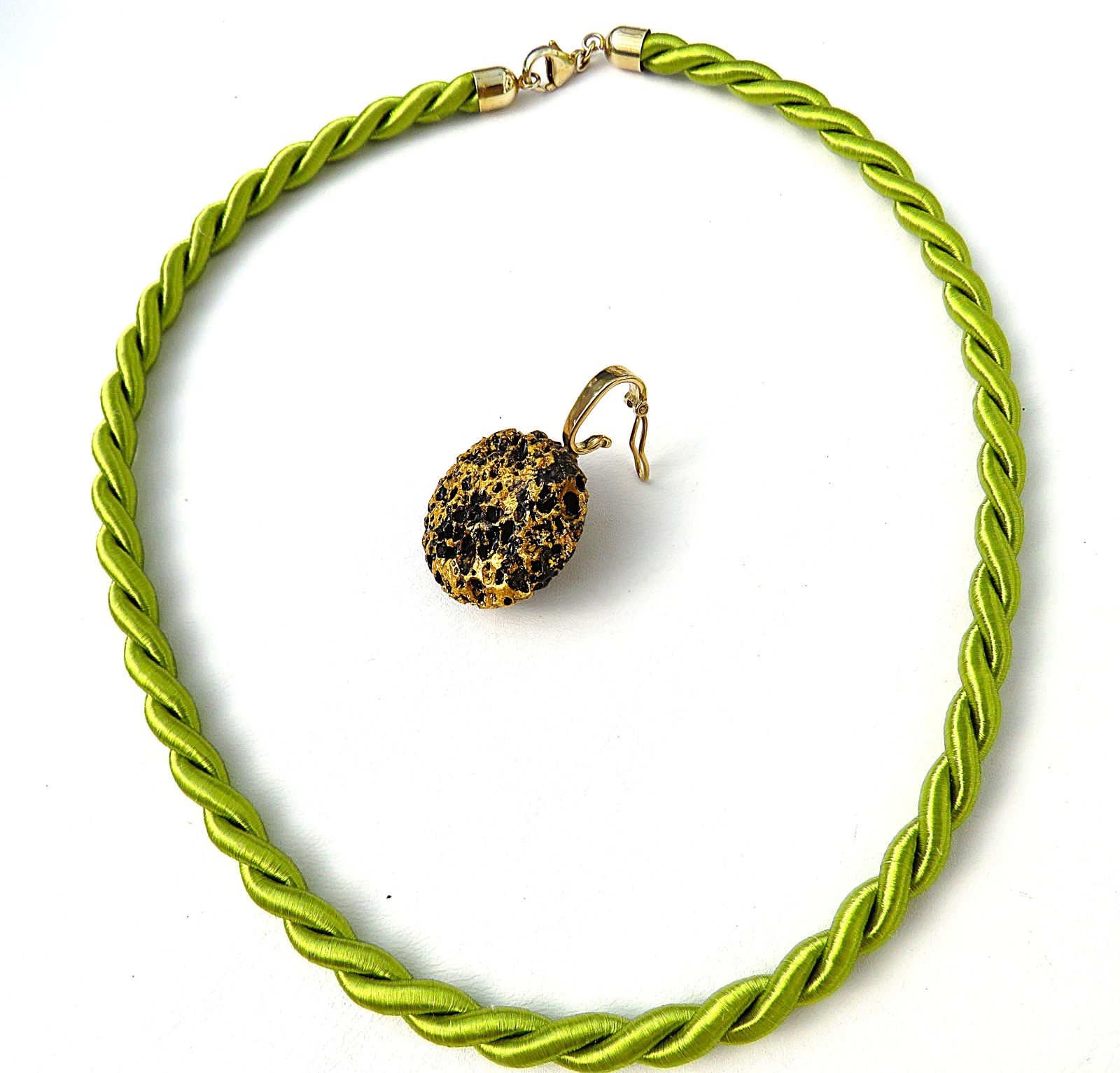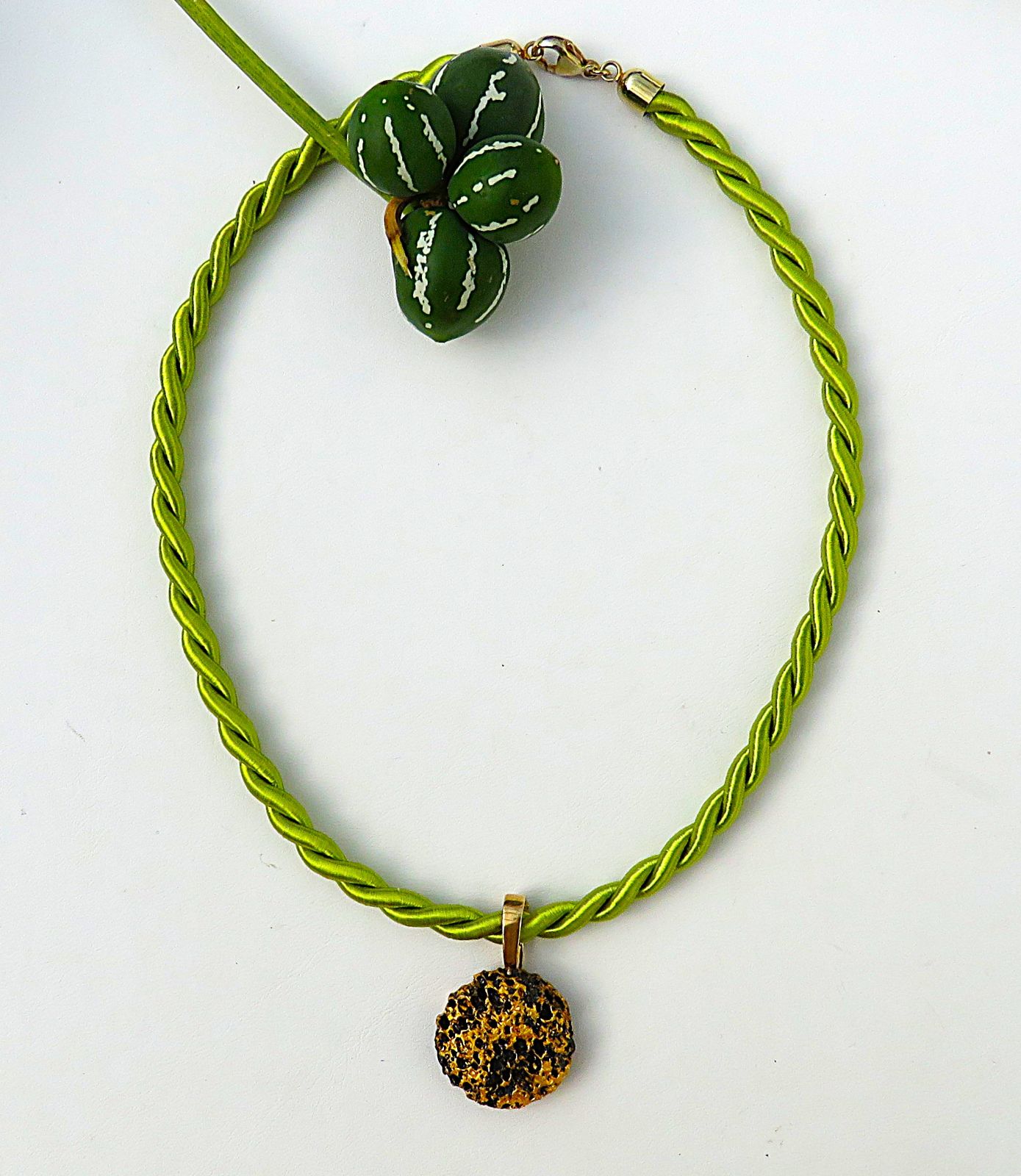 Aus meinem Atelier biete ich Ihnen heute ein besonders ausgefallenes handgefertigtes Modell an. Es handelt sich dabei um ein 45 cm langes kiwigrünes Baumwoll Kordel Collier mit Furnituren aus vergoldetem Sterlingsilber nebst einem Lava Anhänger in Form eines Discs mit Varioclip.