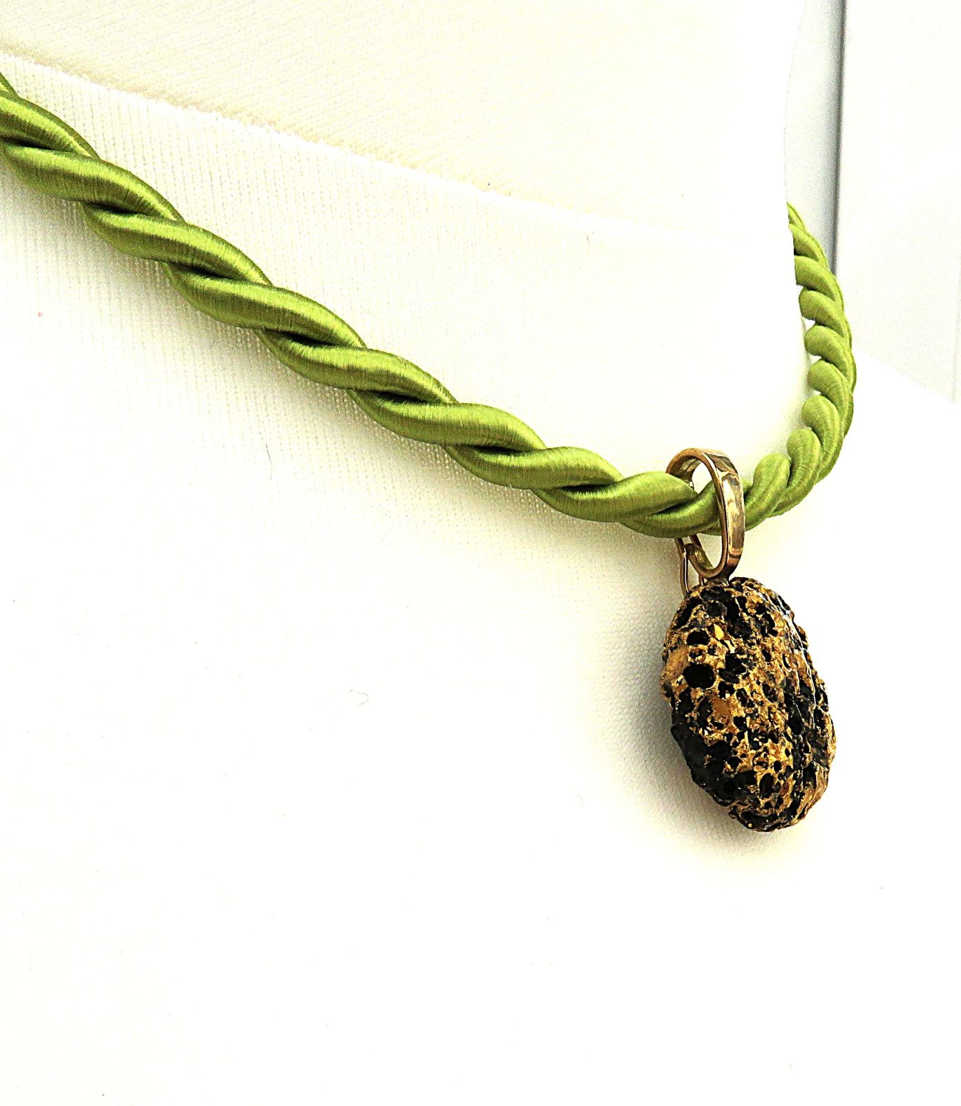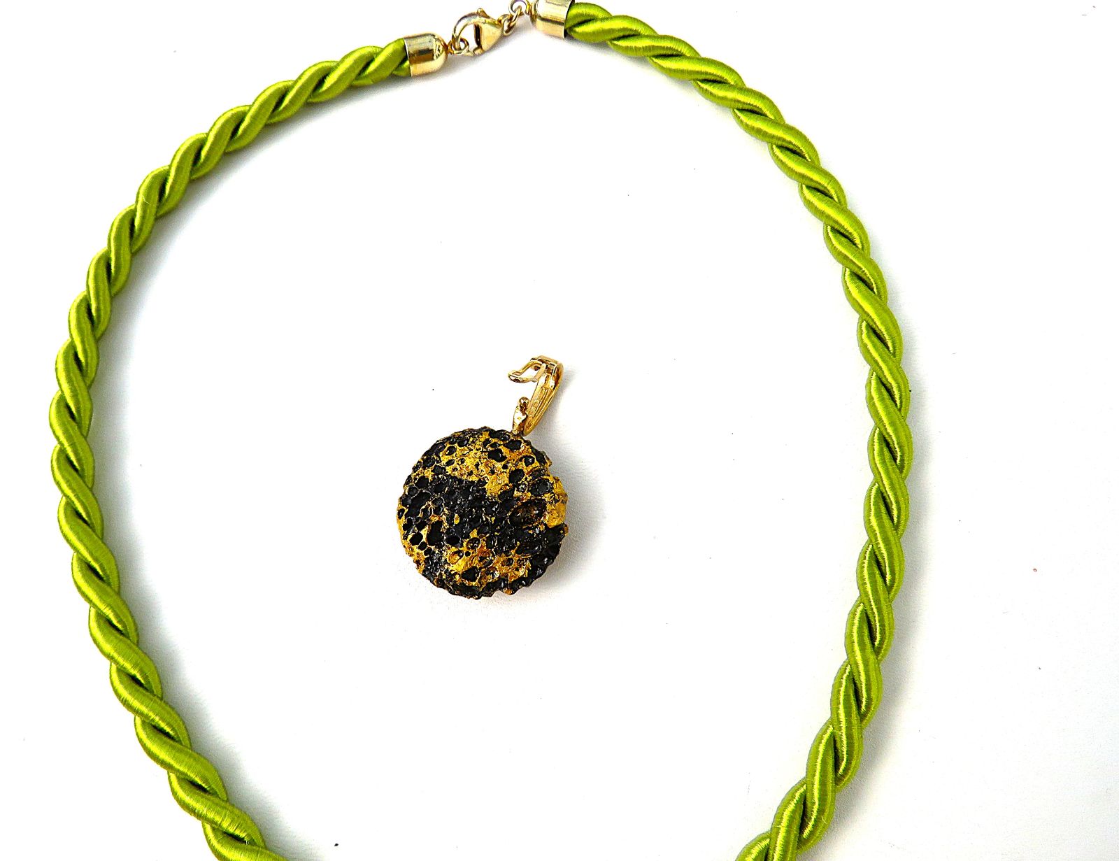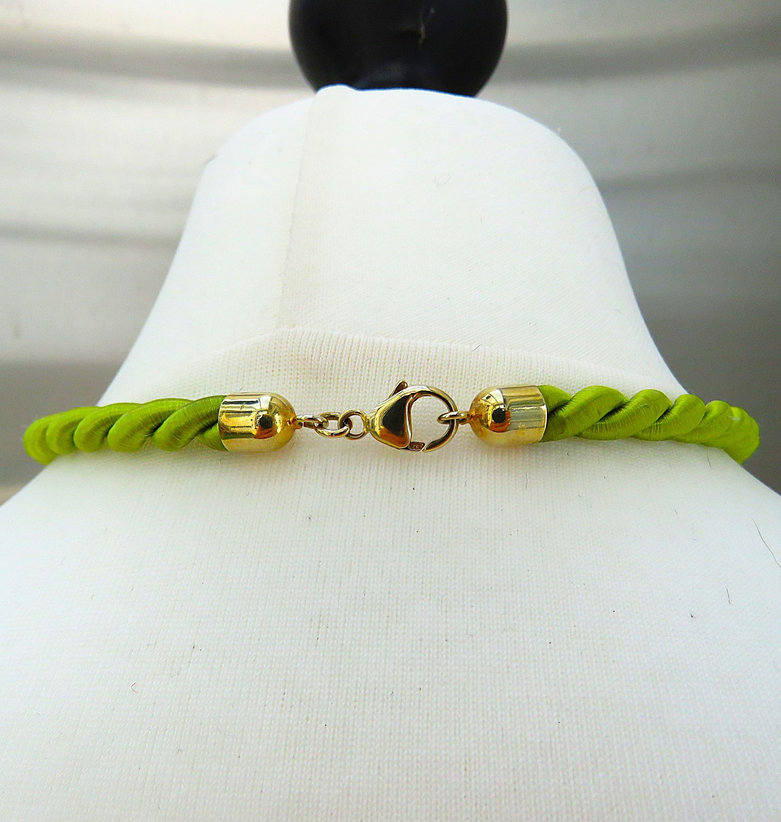 Aus meinem Atelier biete ich Ihnen heute ein besonders ausgefallenes handgefertigtes Modell an. Es handelt sich dabei um ein 45 cm langes kiwigrünes Baumwoll Kordel Collier mit Furnituren aus vergoldetem Sterlingsilber nebst einem Lava Anhänger in Form eines Discs mit Varioclip.