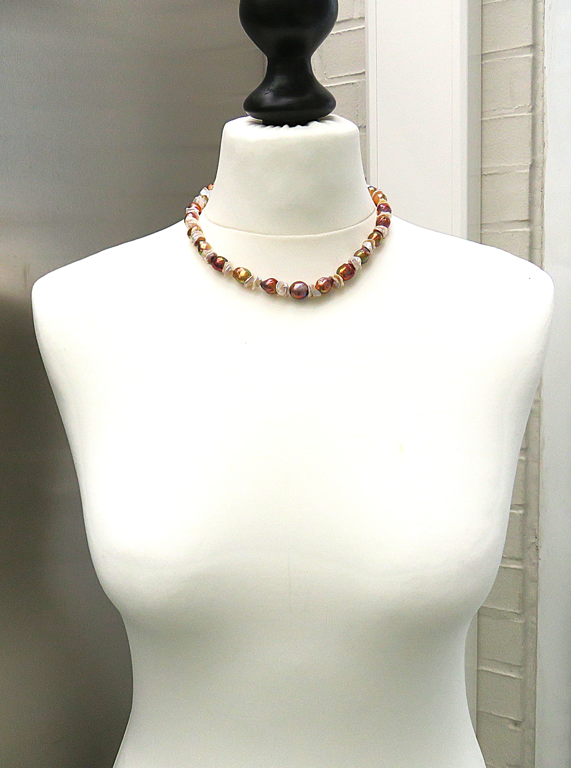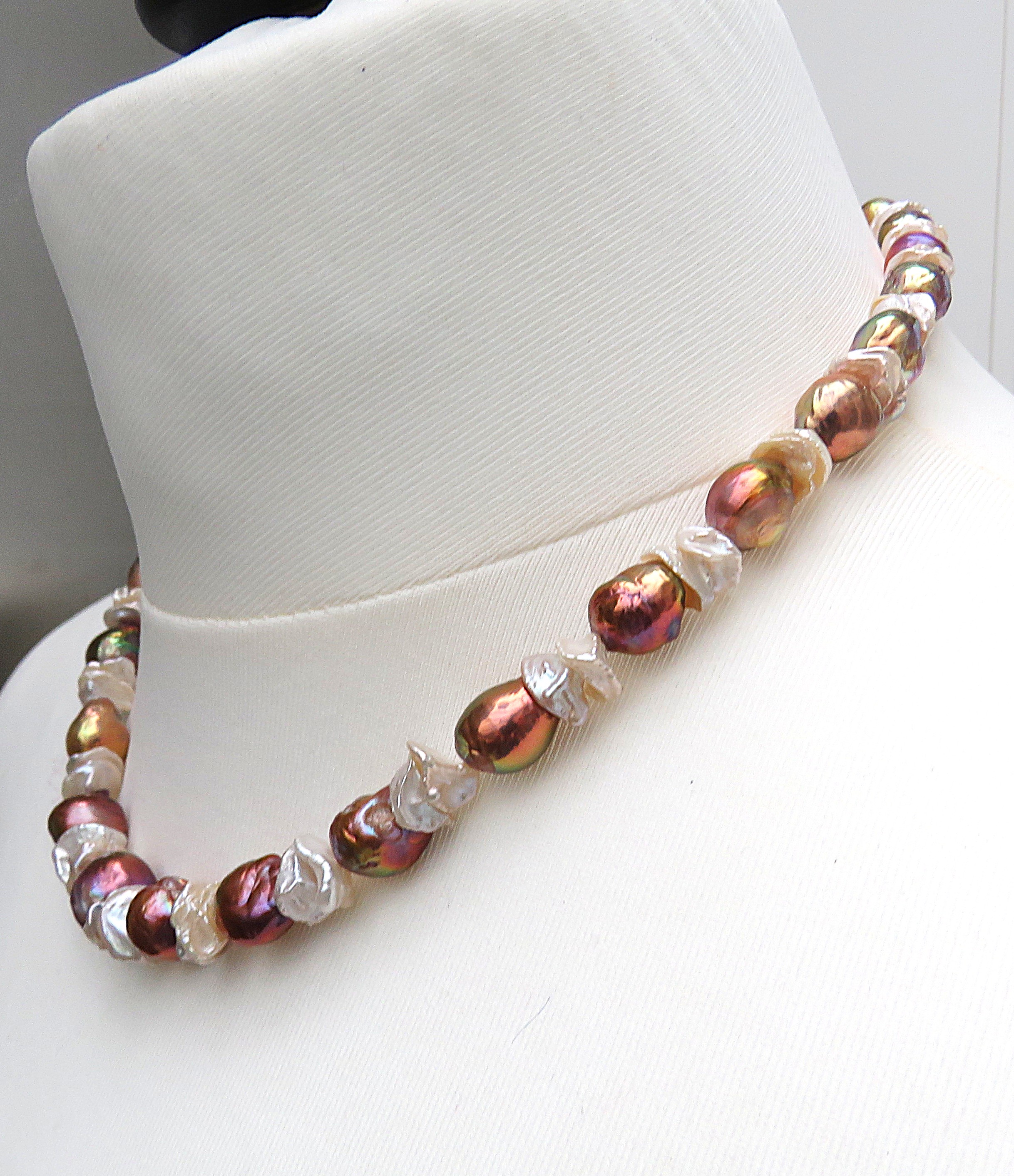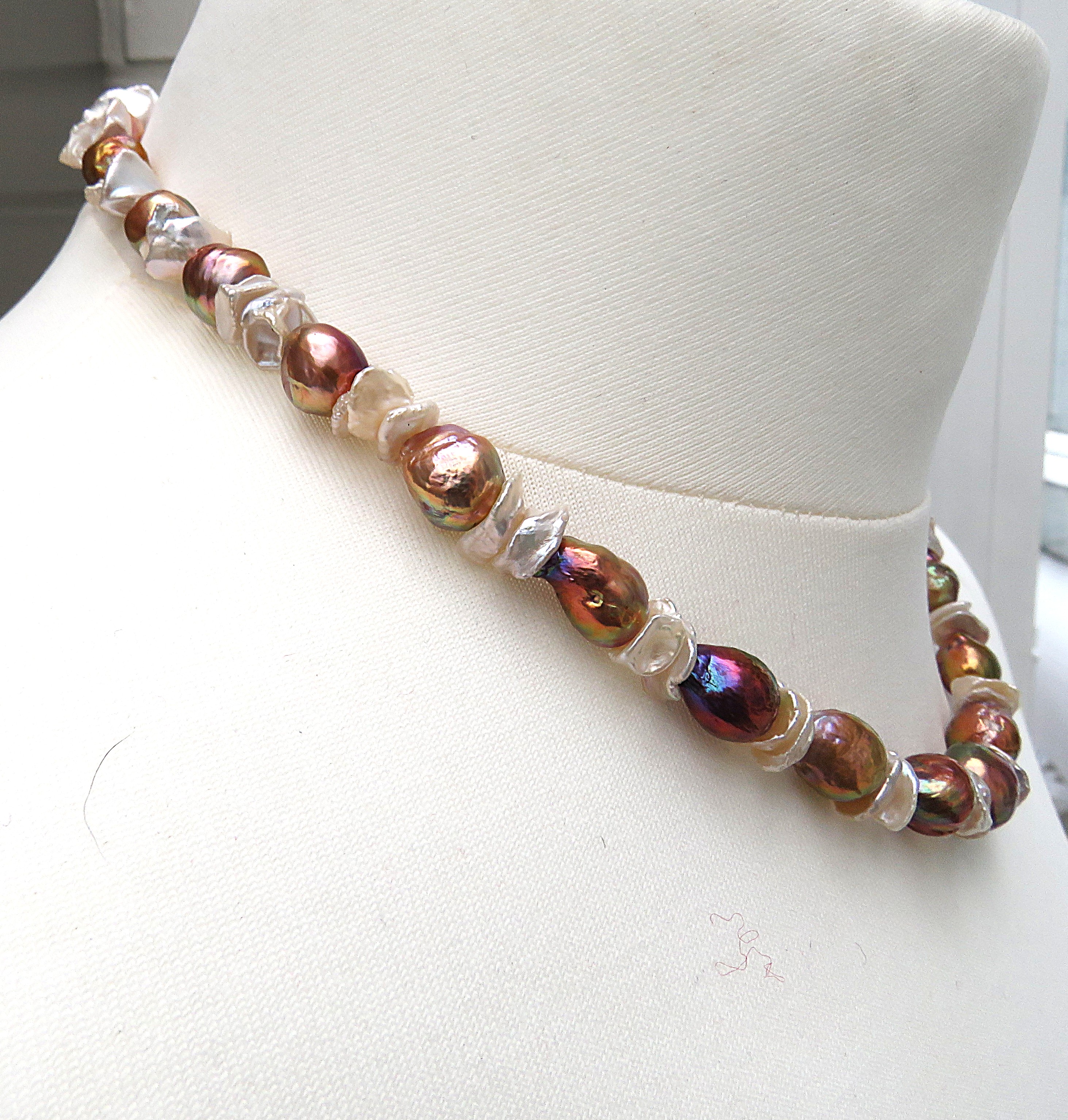 In diesem Süßwasserperlen Collier habe ich Greige farbene Keshi Perlen zusammen mit sehr barocken Perlen im Rapport kombiniert. Alle verwendeten Perlen sind naturfarben. Die barocken Perlen liefern ein Farbenfeuerwerk, das seinesgleichen sucht. Es ist so spektakulär, dass man fast versucht ist, an der Echtheit der Farben zu zweifeln. Dennoch ist es so: So etwas umwerfend Schönes kann nur Natur!! Qualitativ sind Die Keshi mit AAA, die barocken Perlen ob ihrer sehr auffällig strukturierten Oberfläche allenfalls mit A+ zu bewerten. Die barocken Perlen sind in dieser natürlichen Farbgebung als sehr sehr selten zu bezeichnen. Die Farben sind knallig und überaus präsent. Die Perlen haben außerdem die Fähigkeit, sich bei wechselnden Lichtverhältnissen farblich zu verändern. Einmal dominieren Grün- und Lila Töne, ein anderes Mal gewinnen Kupfer- und Feuernuancen die Oberhand. Unglaublich faszinierend!