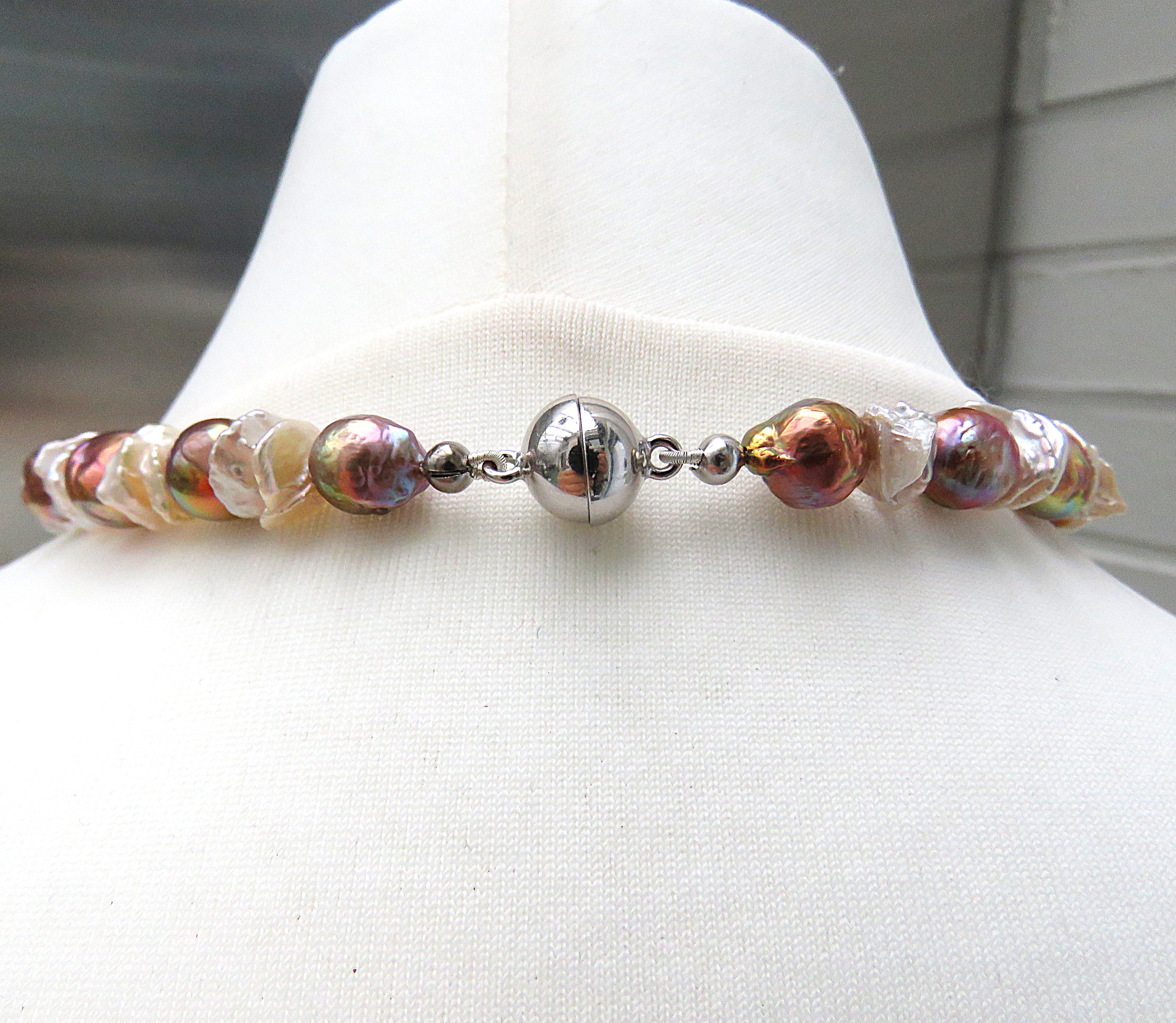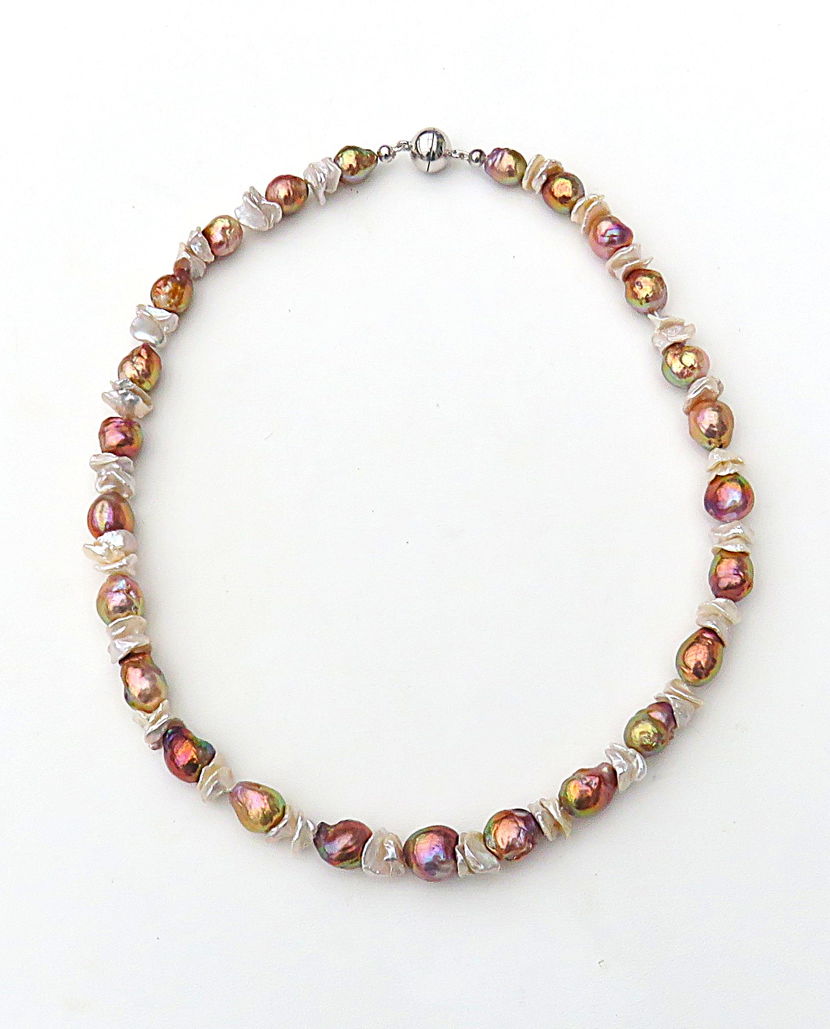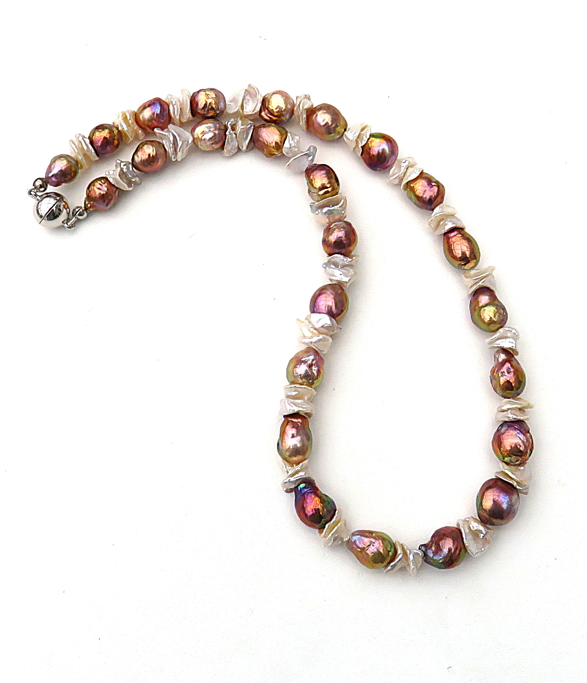In diesem Süßwasserperlen Collier habe ich Greige farbene Keshi Perlen zusammen mit sehr barocken Perlen im Rapport kombiniert. Alle verwendeten Perlen sind naturfarben. Die barocken Perlen liefern ein Farbenfeuerwerk, das seinesgleichen sucht. Es ist so spektakulär, dass man fast versucht ist, an der Echtheit der Farben zu zweifeln. Dennoch ist es so: So etwas umwerfend Schönes kann nur Natur!! Qualitativ sind Die Keshi mit AAA, die barocken Perlen ob ihrer sehr auffällig strukturierten Oberfläche allenfalls mit A+ zu bewerten. Die barocken Perlen sind in dieser natürlichen Farbgebung als sehr sehr selten zu bezeichnen. Die Farben sind knallig und überaus präsent. Die Perlen haben außerdem die Fähigkeit, sich bei wechselnden Lichtverhältnissen farblich zu verändern. Einmal dominieren Grün- und Lila Töne, ein anderes Mal gewinnen Kupfer- und Feuernuancen die Oberhand. Unglaublich faszinierend!