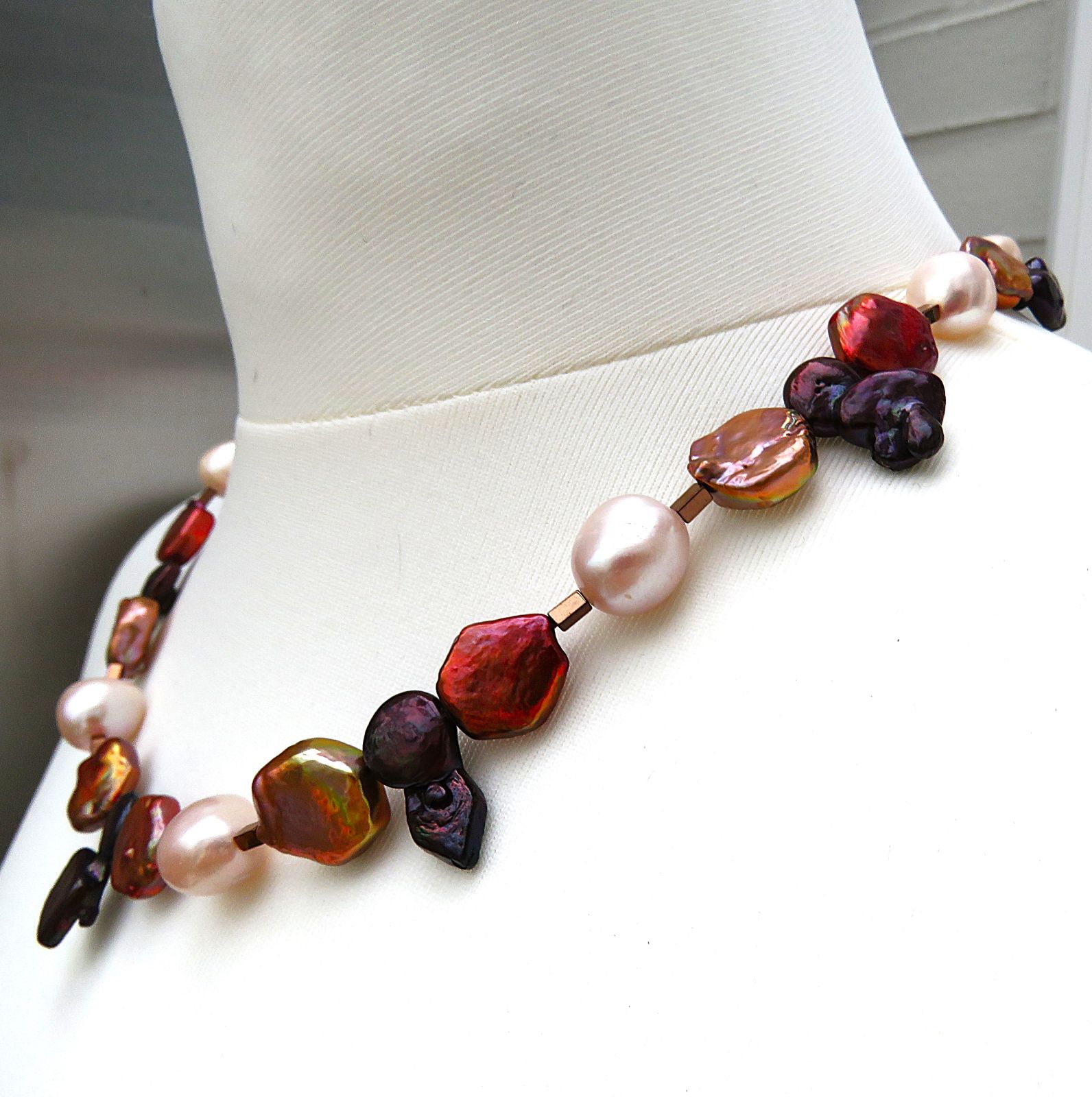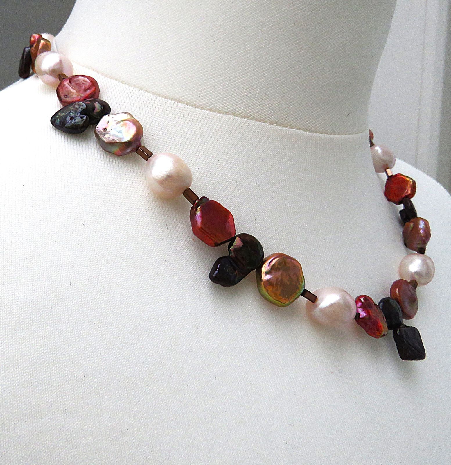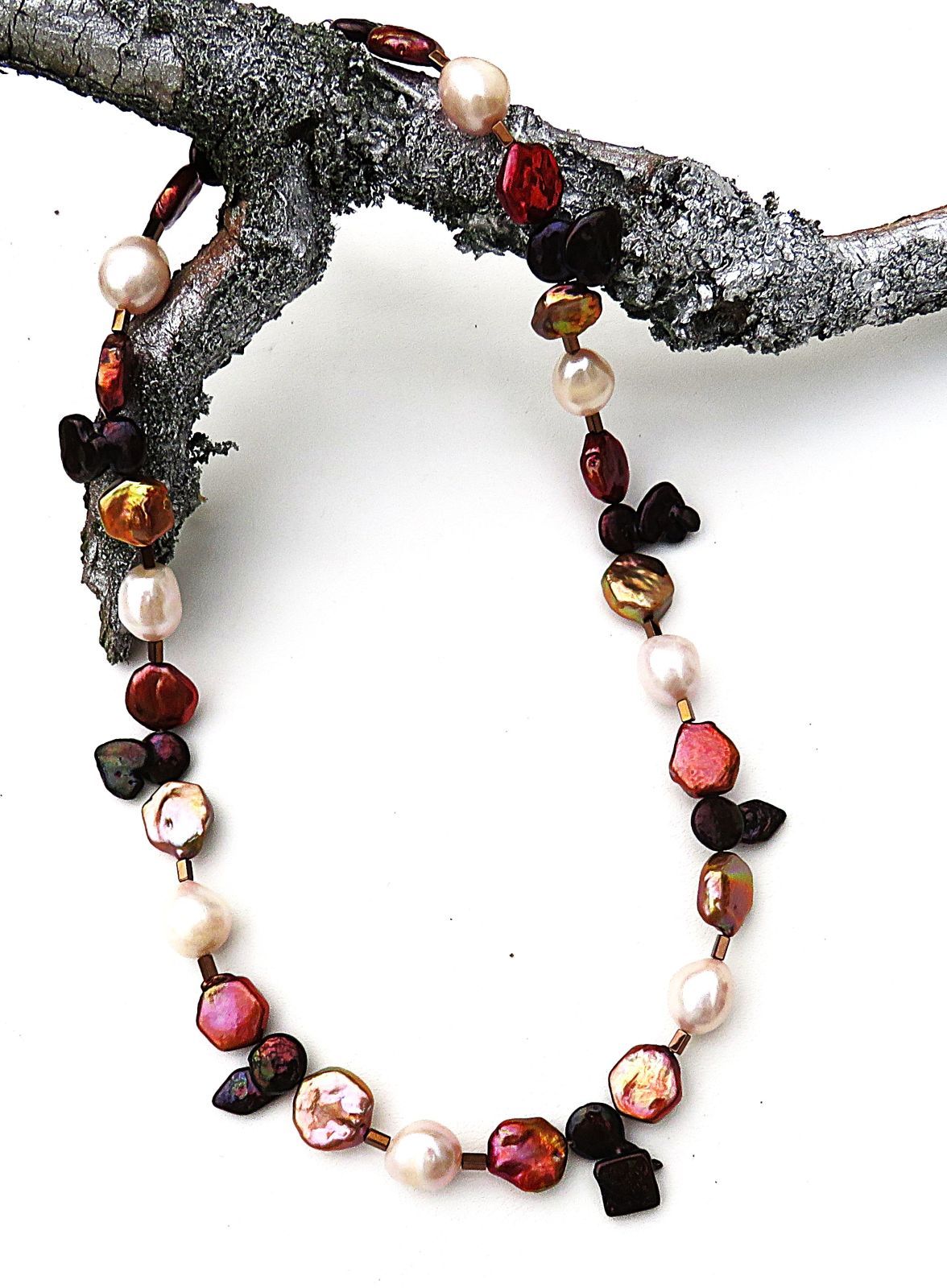 Es handelt sich ausschließlich um Süßwasserperlen, die sich im Rapport in diesem Collier aneinander reihen, begleitet von kleinen viereckigen Stäbchen aus kupferfarben galvanisiertem Hämatit. So ist ein eigenwilliges Unikat entstanden.