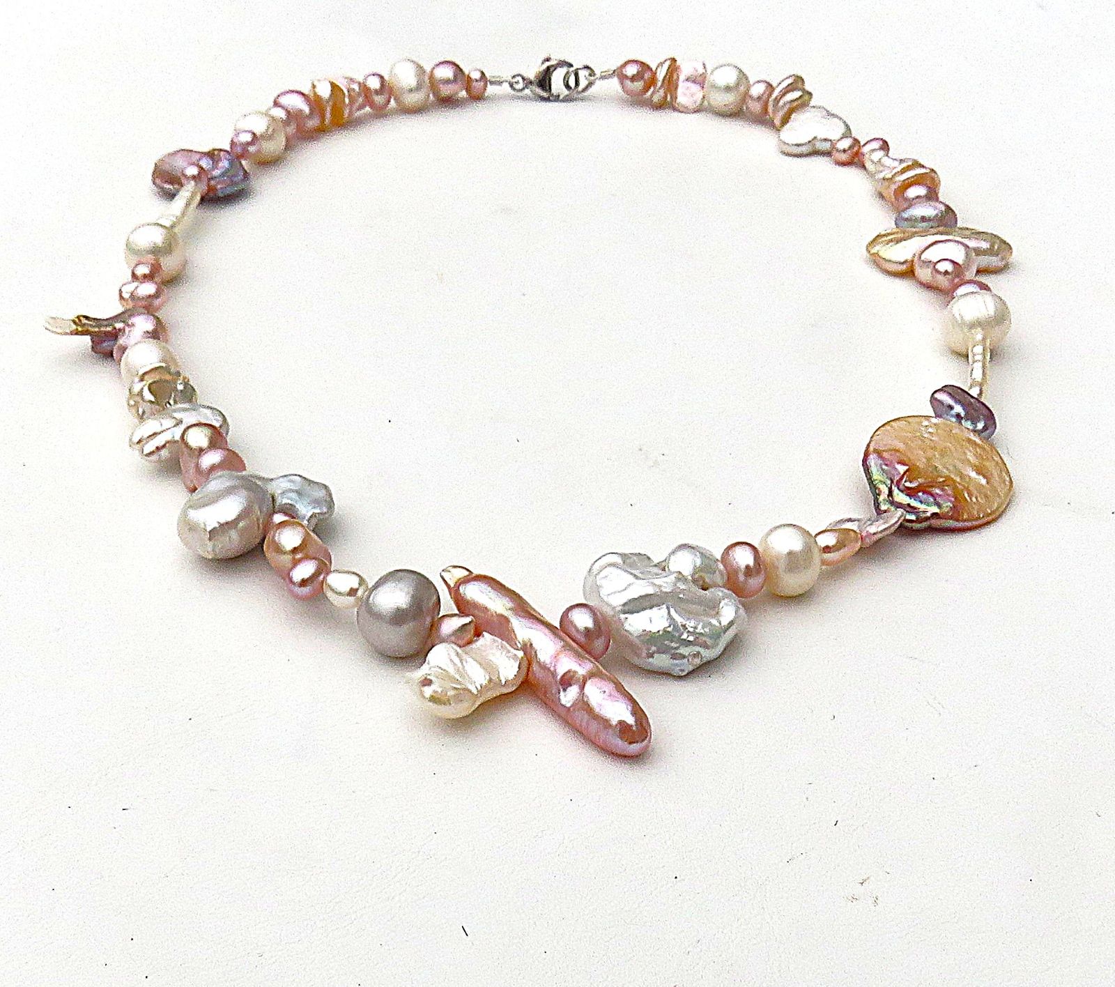 Es handelt sich ausschließlich um Süßwasserperlen, die sich scheinbar willkürlich in diesem Collier aneinander reihen. Dennoch wirkt diese Perlen Kette trotz aller Asymmetrie ausgewogen und homogen in ihrer Gesamterscheinung.