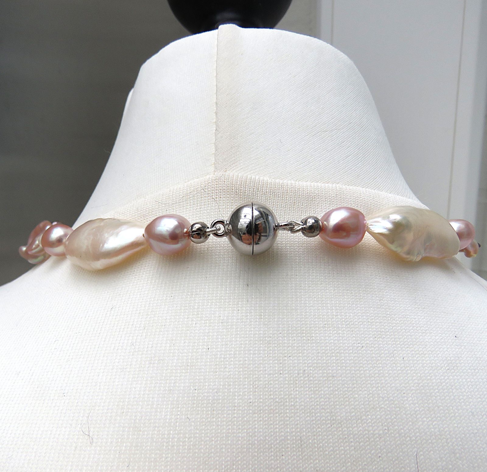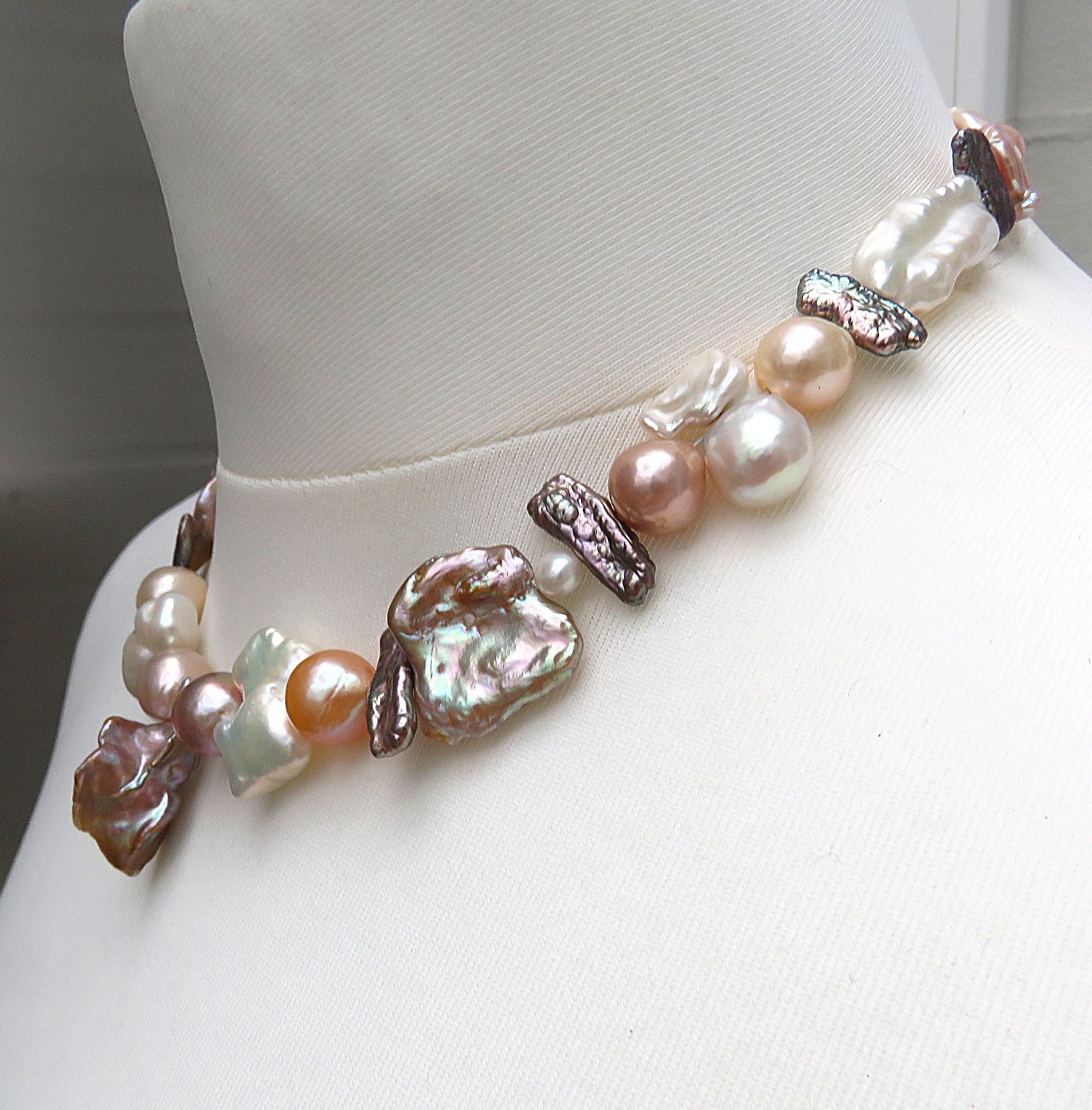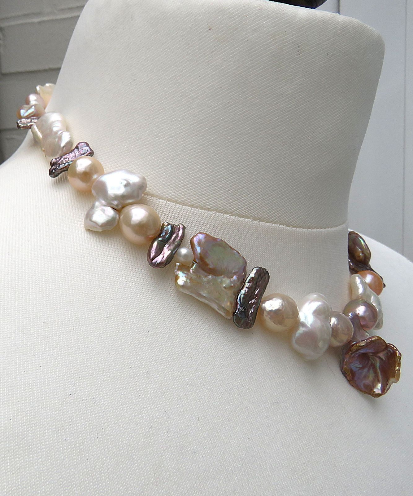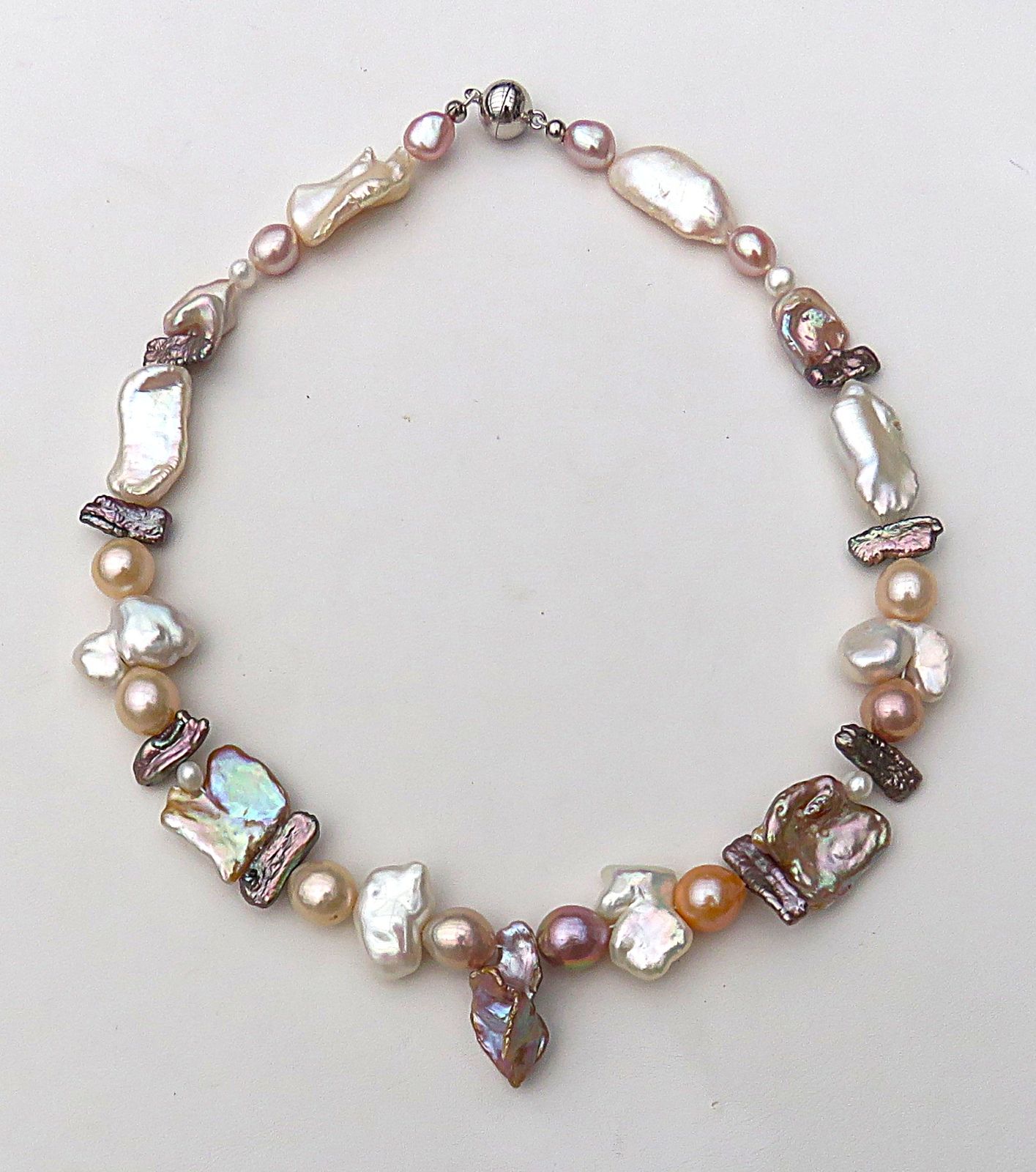 Verwendet habe ich naturfarbene große Keshi Perlen, große, weiße Peanuts, und dunkel gefärbte kleine Biwa Perlen, natur roséfarbebene Biwa und riesige weiße, Biwa Perlen. Ich habe sie in einem Rapport arrangiert. Das Collier punktet durch seinem Mix pastellig dezenter Farbvarietäten sowie durch die bizarren Formen in unterschiedlichen Größen. Diese Perlen Unikat Kette ist ein ganz besonderer Hingucker.