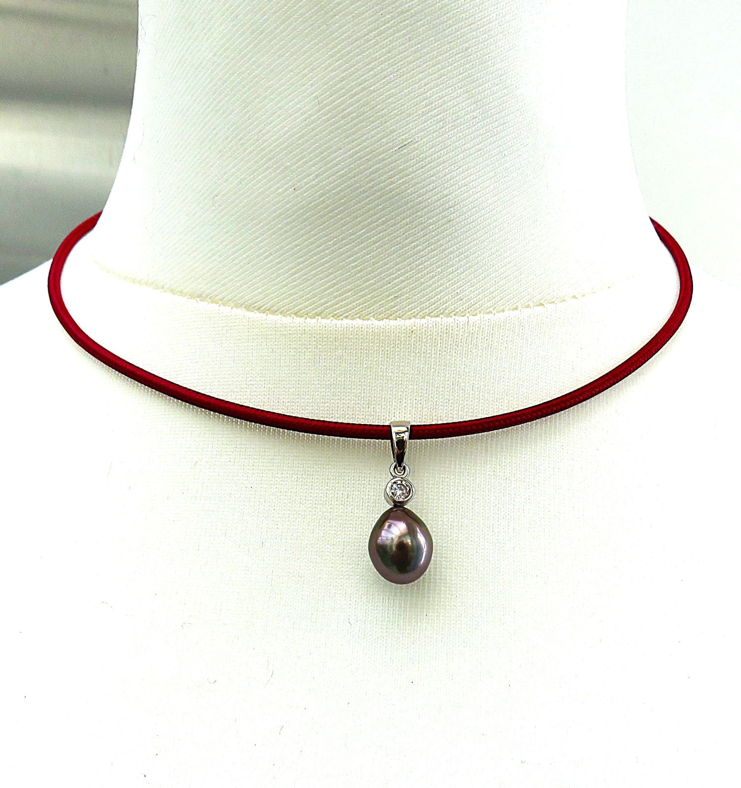 Öfter mal etwas Neues - so auch heute und hier: Es ist dies zum Einen eine wundervolle makelloseTahiti Tropfenperle und zum anderen ein - Achtung!! Magnetischer Halsreif. Das Teilchen hat es wirklich in, bzw. an sich. Dieser mit seidigem bordeauxfarbenem Gewebe ummantelte Halsreif ist durchgängig magnetisch. Eine Schließe ist demzufolge garnicht nötig,