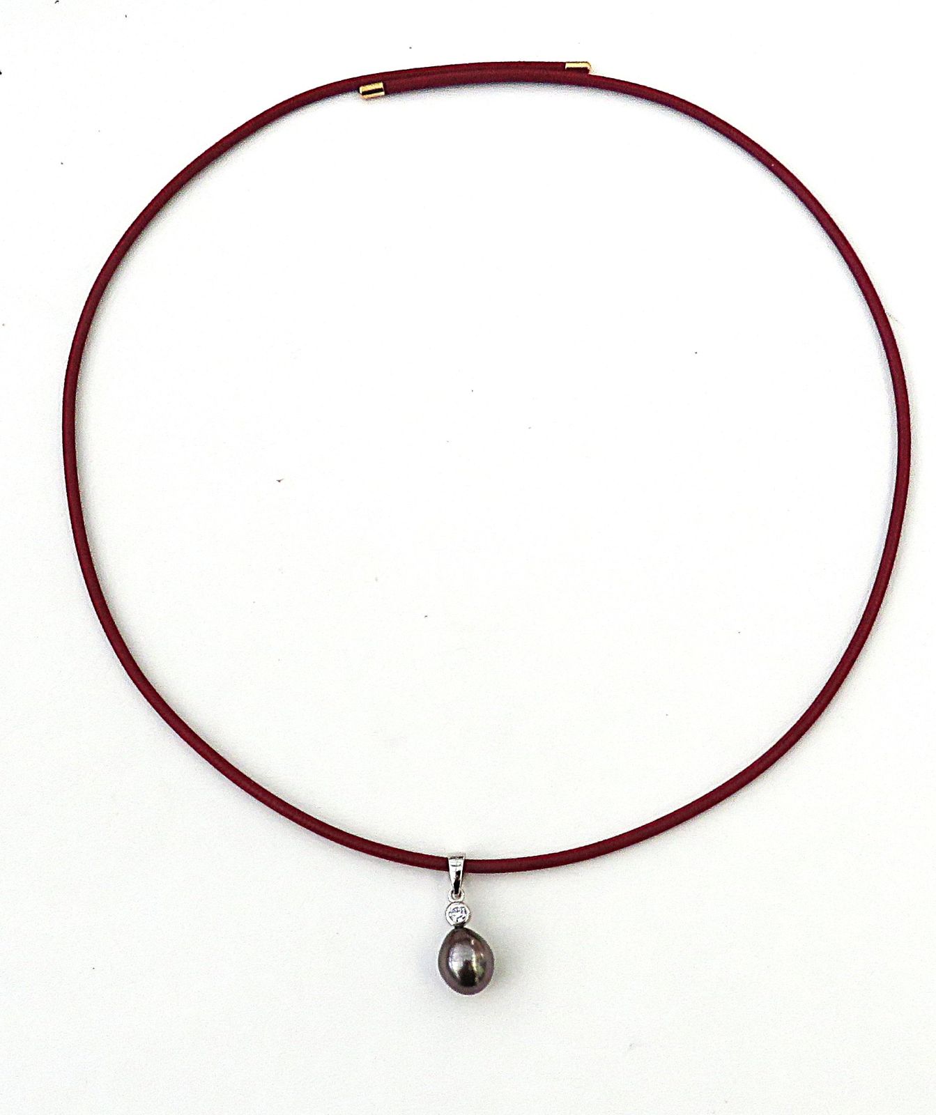 Die Tahiti Perle Modell Nr. 5536 die Tahiti Perle hat eine schwarze Körperfarbe. Die Überfarbe ist ein zartes Purple, welches hervorragend mit dem Halsreif korrespondiert. Die Tahiti misst ca. 9,4 x 10,8 mm. Befestigt habe ich die Tahiti Perle an Öse aus rhodiniertem Sterlingsilber, die mit einem kleinen Zirkon versehen ist. Dieser sorgt zusätzlich für ein dezentes Bling Bling. Die Gesamtlänge des Anhängers beläuft sich auf ca. 23,5 mm.