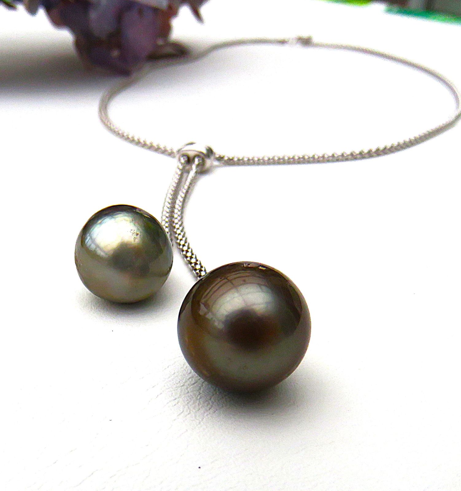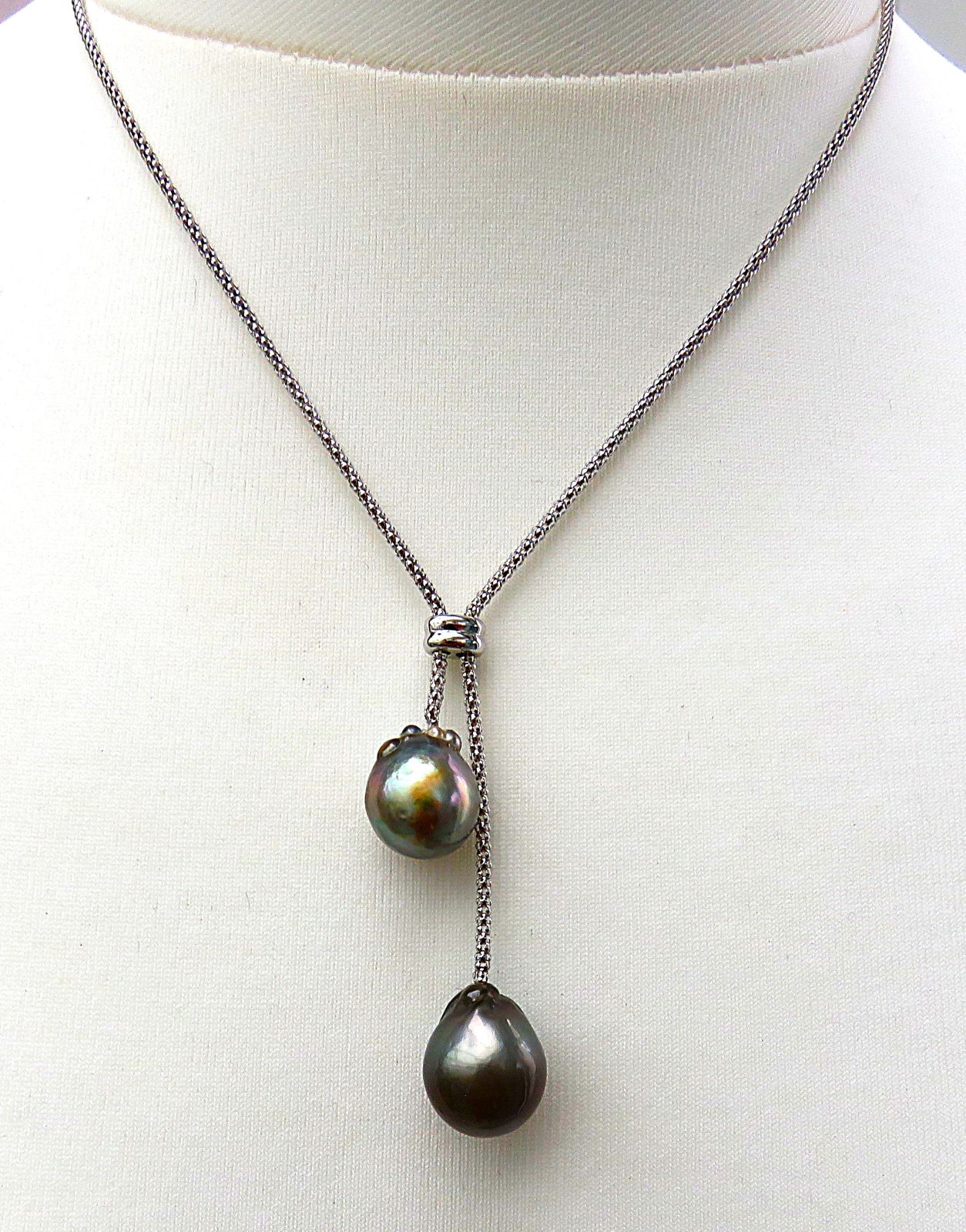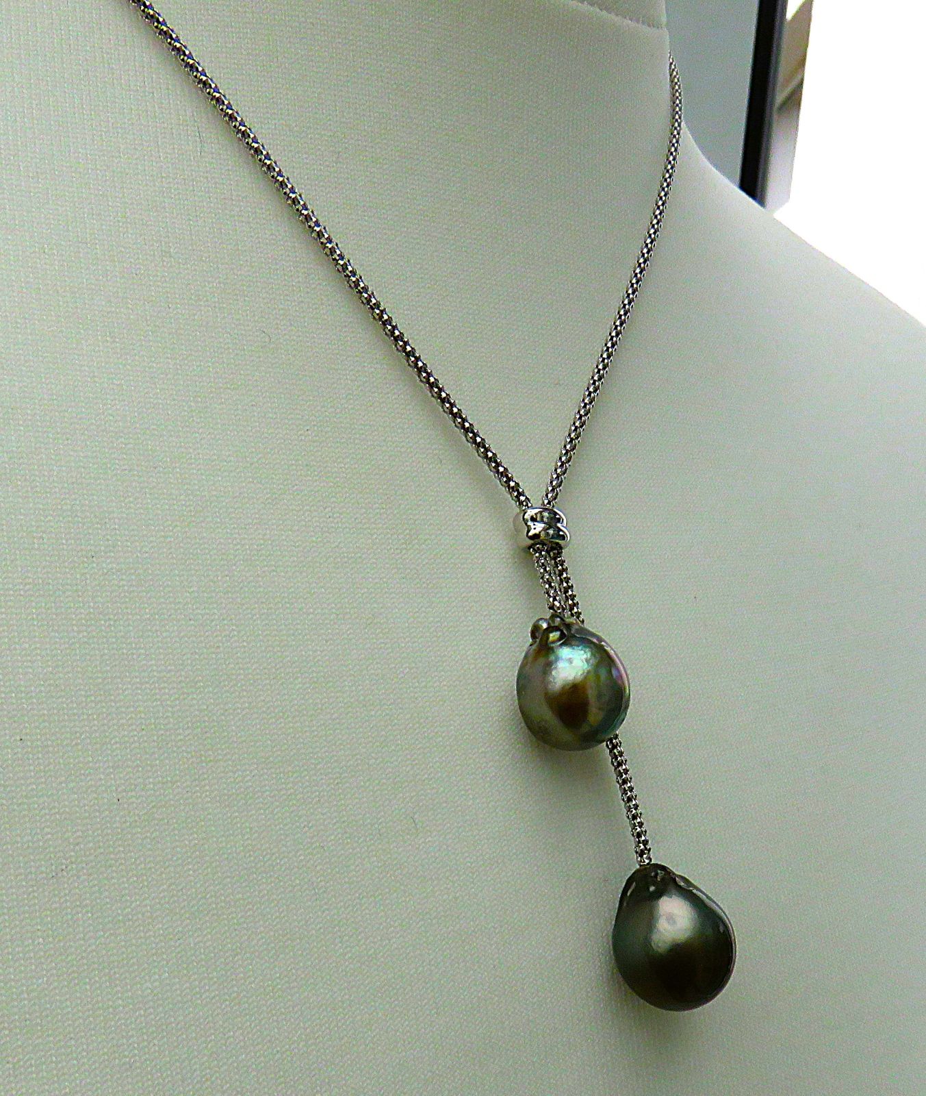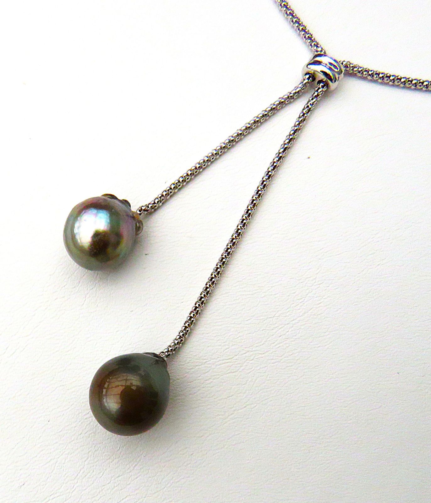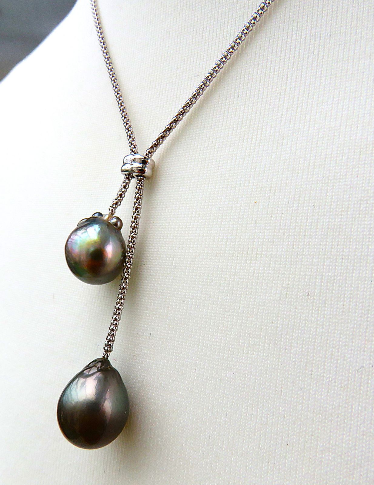 Biete Ihnen an: Zwei pralle Tahiti Tropfenperlen an einer 1,8 mm starken und 49 cm langen rhodinierten Sterlingsilber Kette.