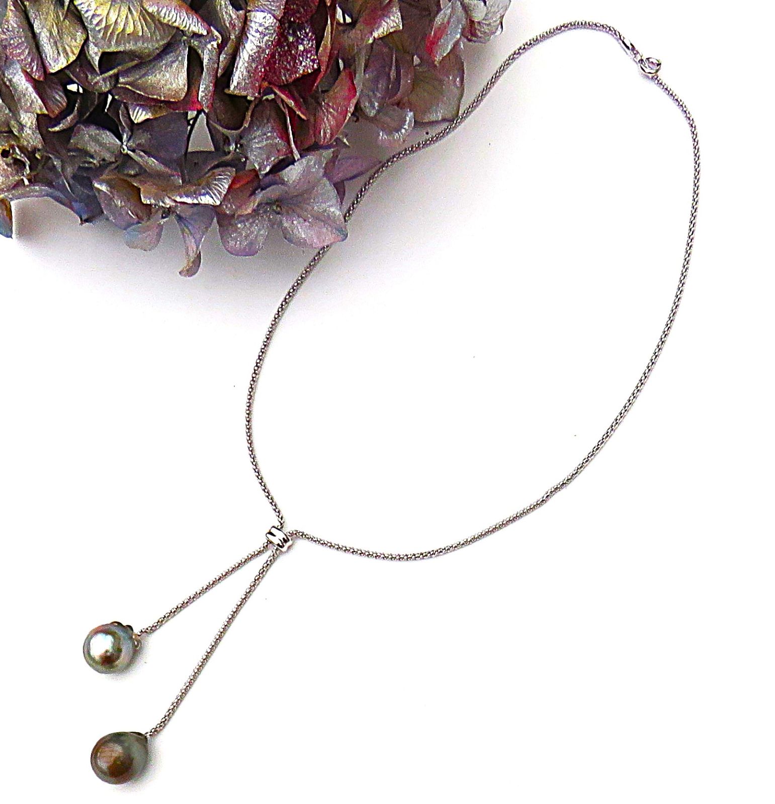 Die beiden Tahitiperlen sind fest mit den Enden der Kette verbunden. Sie sind tropfenförmig barock und sie verfügen über ein wundervolles Lüster.