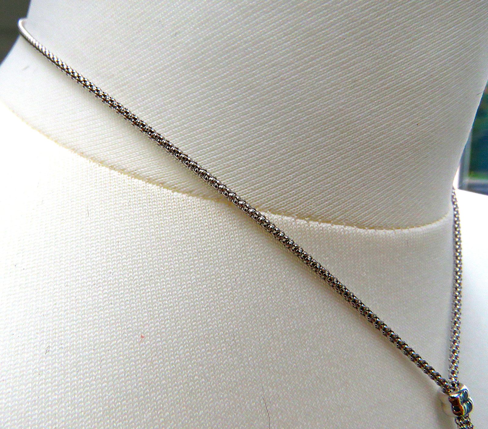 Die Sterlingsilber Kette ist ähnlich einer Venezianer Kette gearbeitet, allerdings hat sie, entgegen dem quadratischen, wie bei Venezianerketten üblich, einen runden Querschnitt. Die Kette ist zweigeteilt, wobei die eine Seite 2,5 cm länger ist als die andere. Bei beiden Kettenhälften sind mittels eines beweglichen Schiebers verbunden, der frei auf der Kette läuft und so die Möglichkeit gegeben ist, dass man die Länge des Silbercolliers variieren kann. Schauen Sie sich hierzu bitte meine Detailfotos an. Dieses Schmuckstück ist daher sehr variabel einsetzbar.