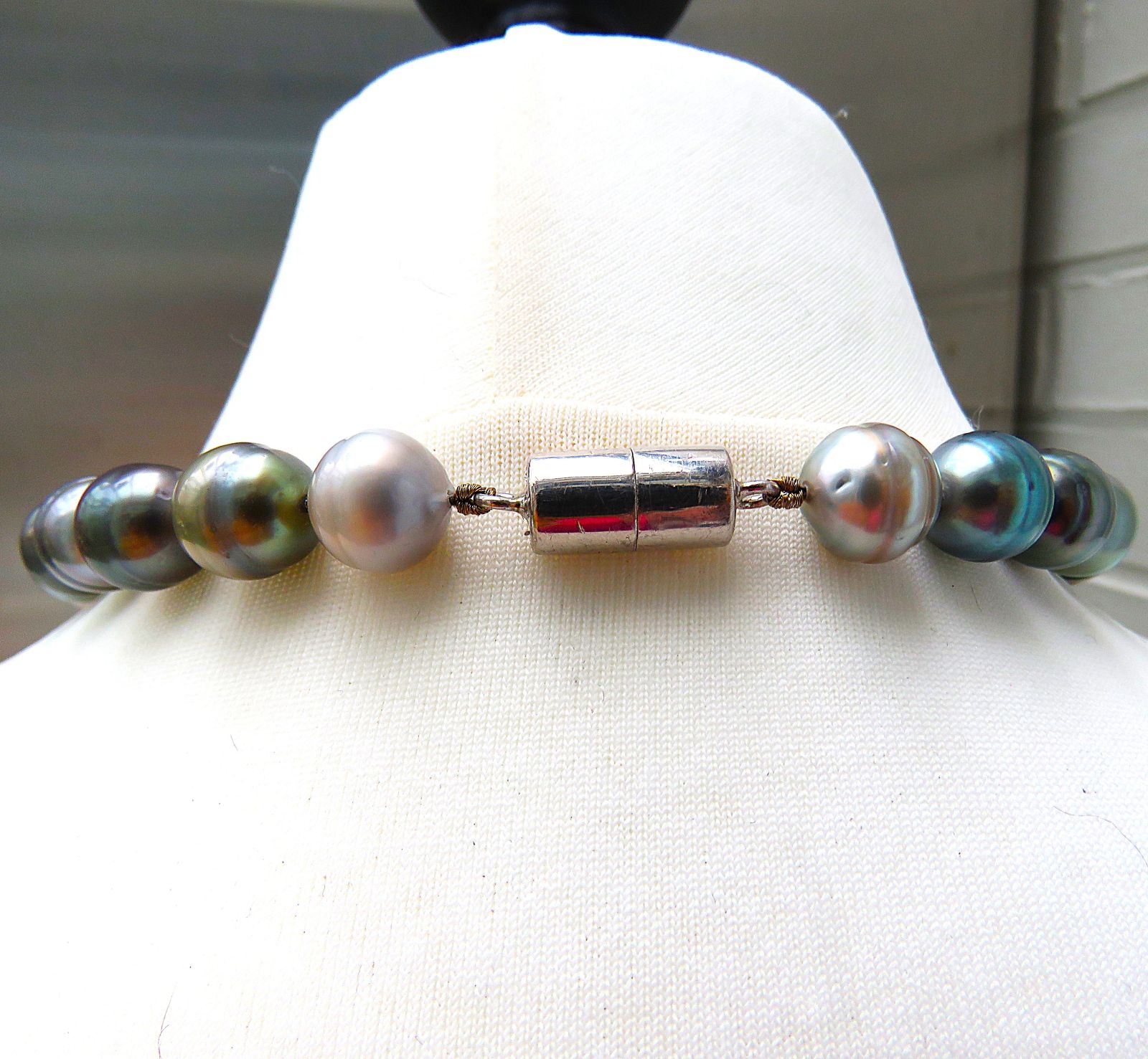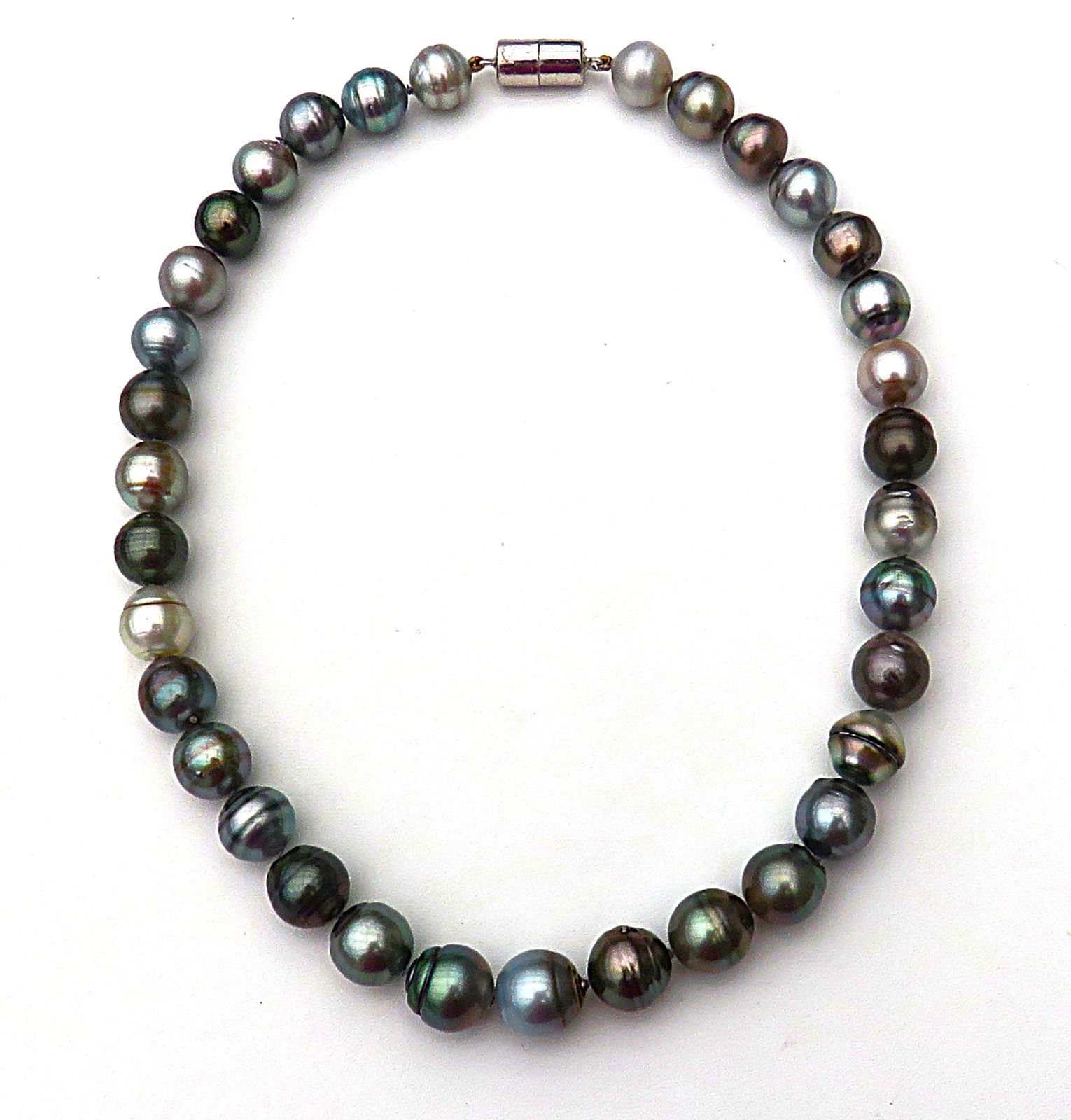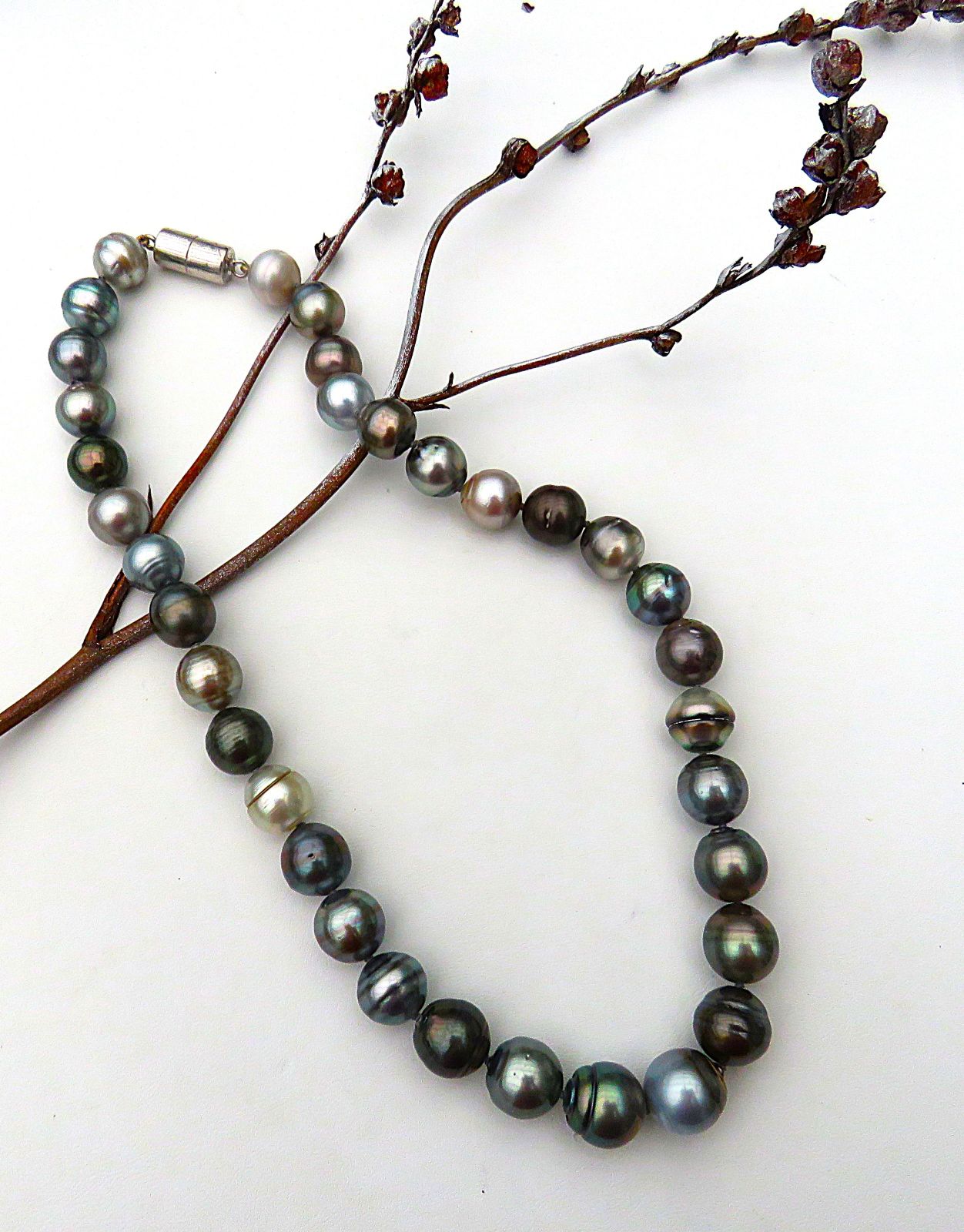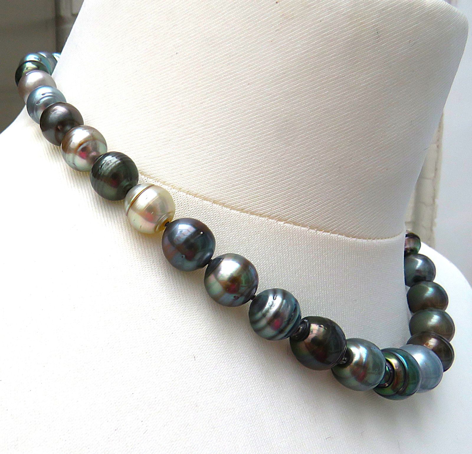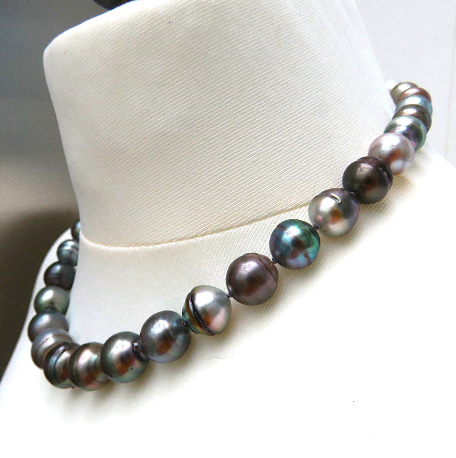 Schauen Sie sich bitte die Tageslichtaufnahmen an und lassen Sie sich verzaubern von den unerschöpflichen Farbvarietäten der hier verarbeiteten Tahiti Perlen. Die Bilder lassen keinen Zweifel an der guten Qualität und Einmaligkeit dieses Halsschmuckes.